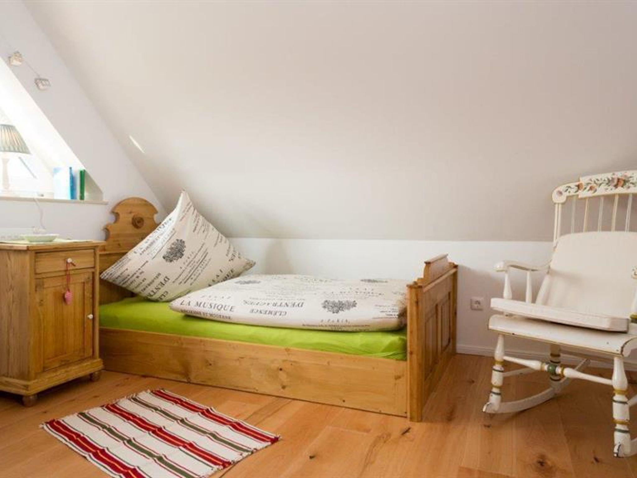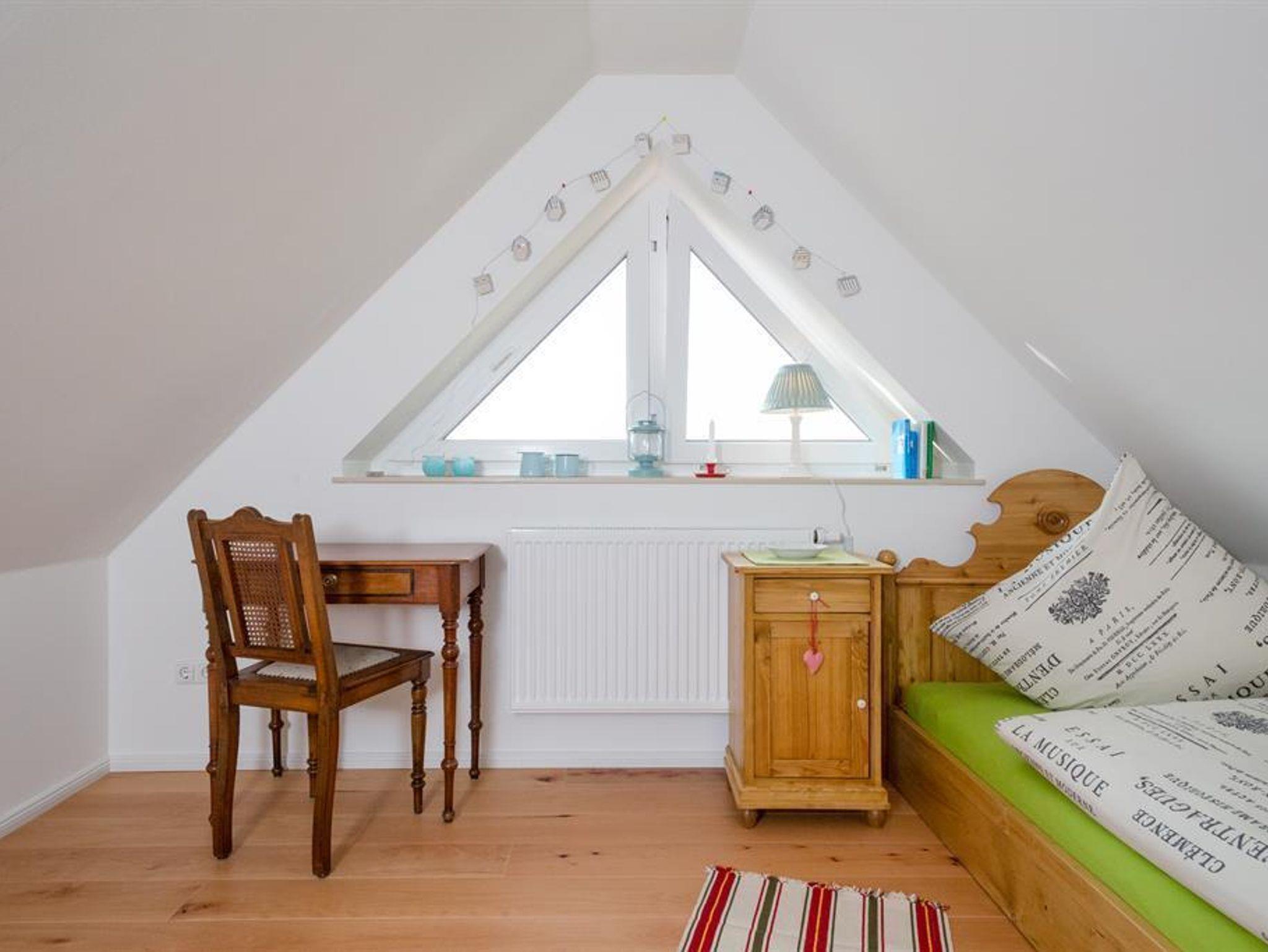Das unsere Schlafzimmer verfügt über eine Doppelbett. Die Treppe hinauf gelangen Sie in den offenen Spitzboden mit 2 gegenüberliegenden kleinen Schlafräumen, jeweils mit einem Einzelbett ausgestattet. Bei einer Buchung von 1-2 Personen gehört der Spitzboden NICHT zum Mietumfang.