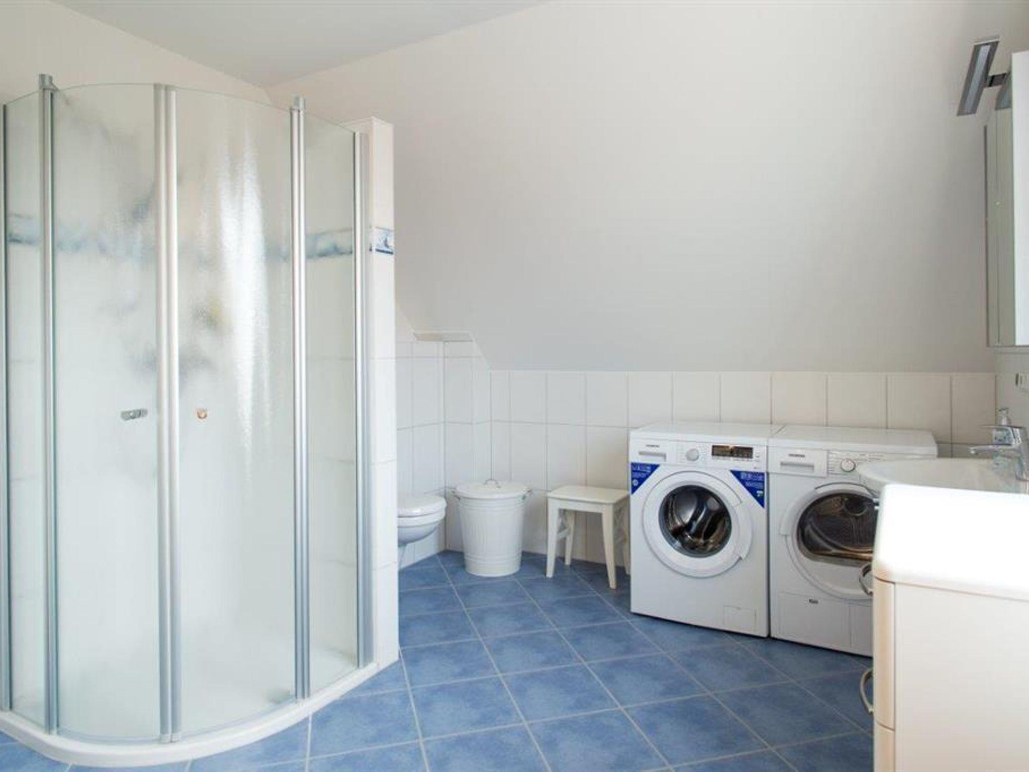 Das hochmoderne Bad verfügt über eine flache Runddusche mit Glasschiebetür, Waschtisch, Fön, WC, Fußbodenheizung und einer exklusiven Sauna. Zudem finden Sie eine Waschmaschine und Trockner. Für Kinder gibt es einen Fußhocker am Waschbecken. Kinderstuhl und Kinderbett sind