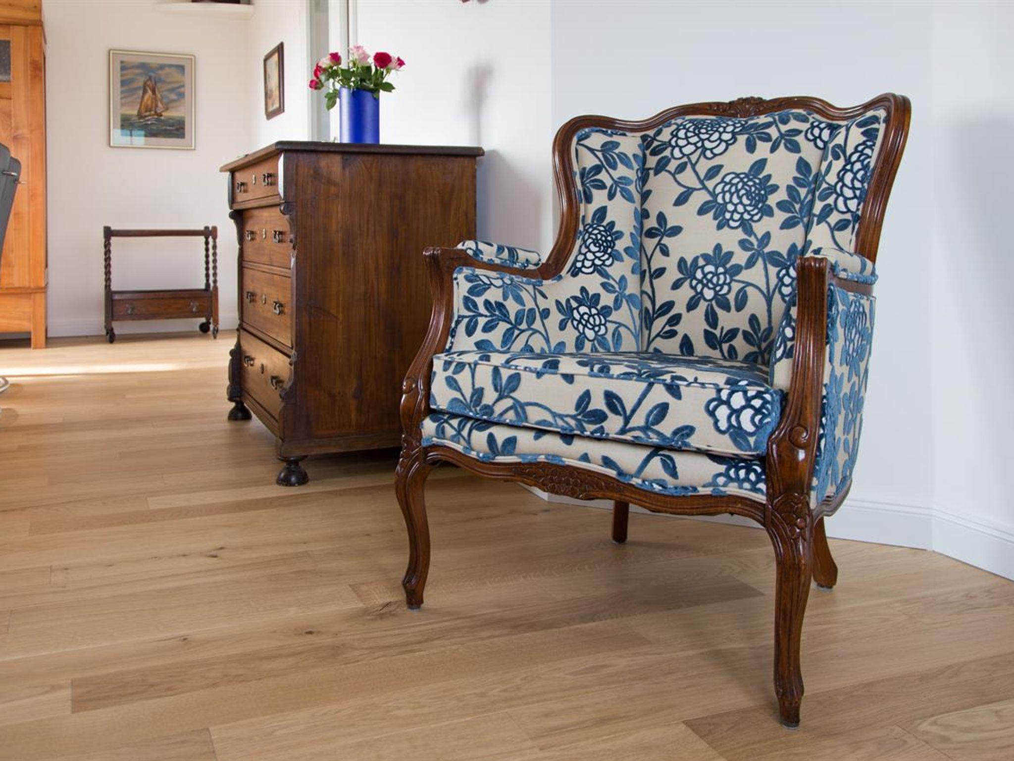 die keine Wünsche offen lässt sowie ein gemütliches Wohnzimmer. Bis auf die Küche (Fliesen) sind alle Räume mit Holzfußböden und Fußbodenheizung ausgelegt. Die Kombination von einzigartigen alten und neuen Möbeln schafft ein unvergleichbares nordisches Wohngefühl.