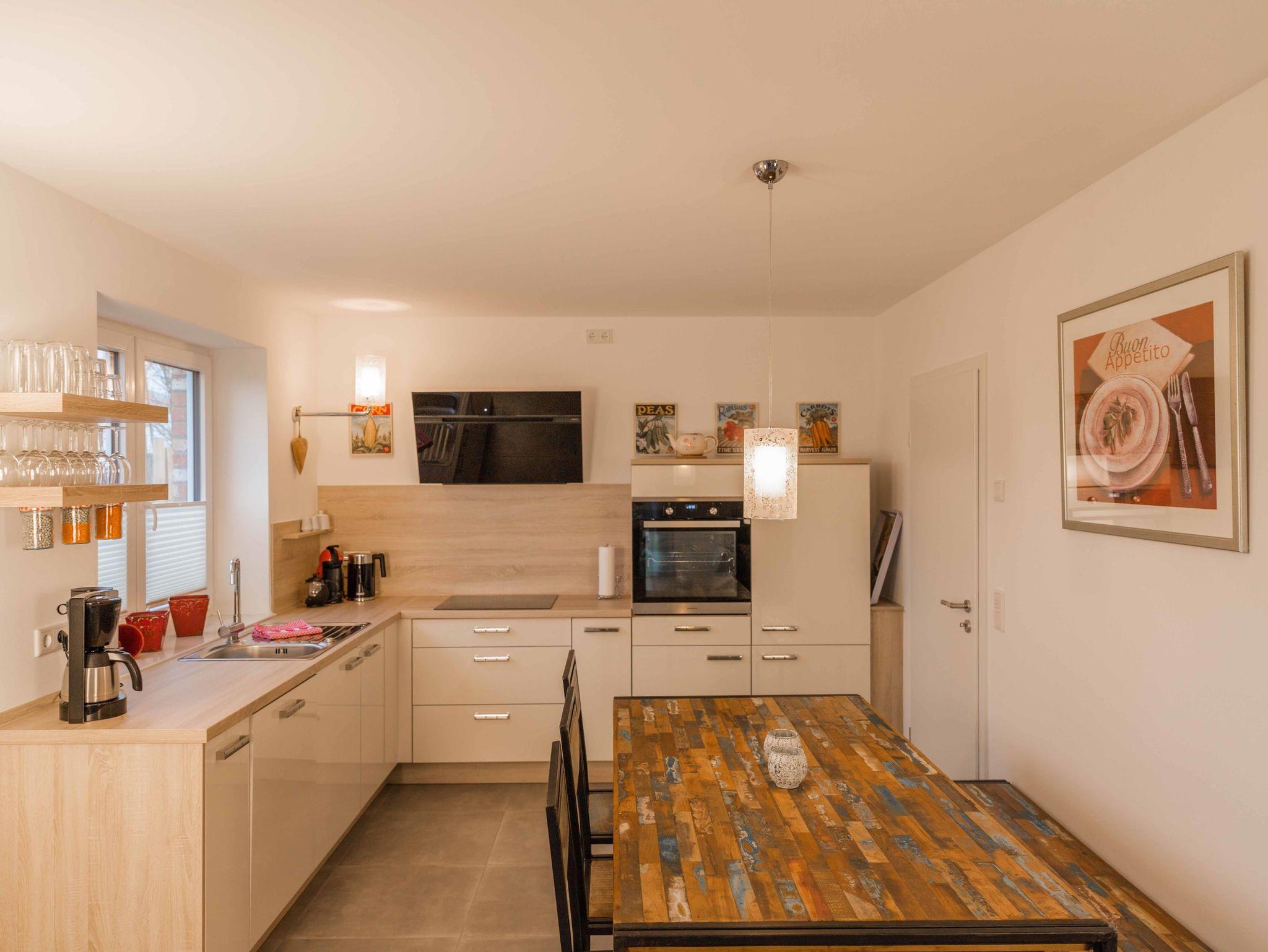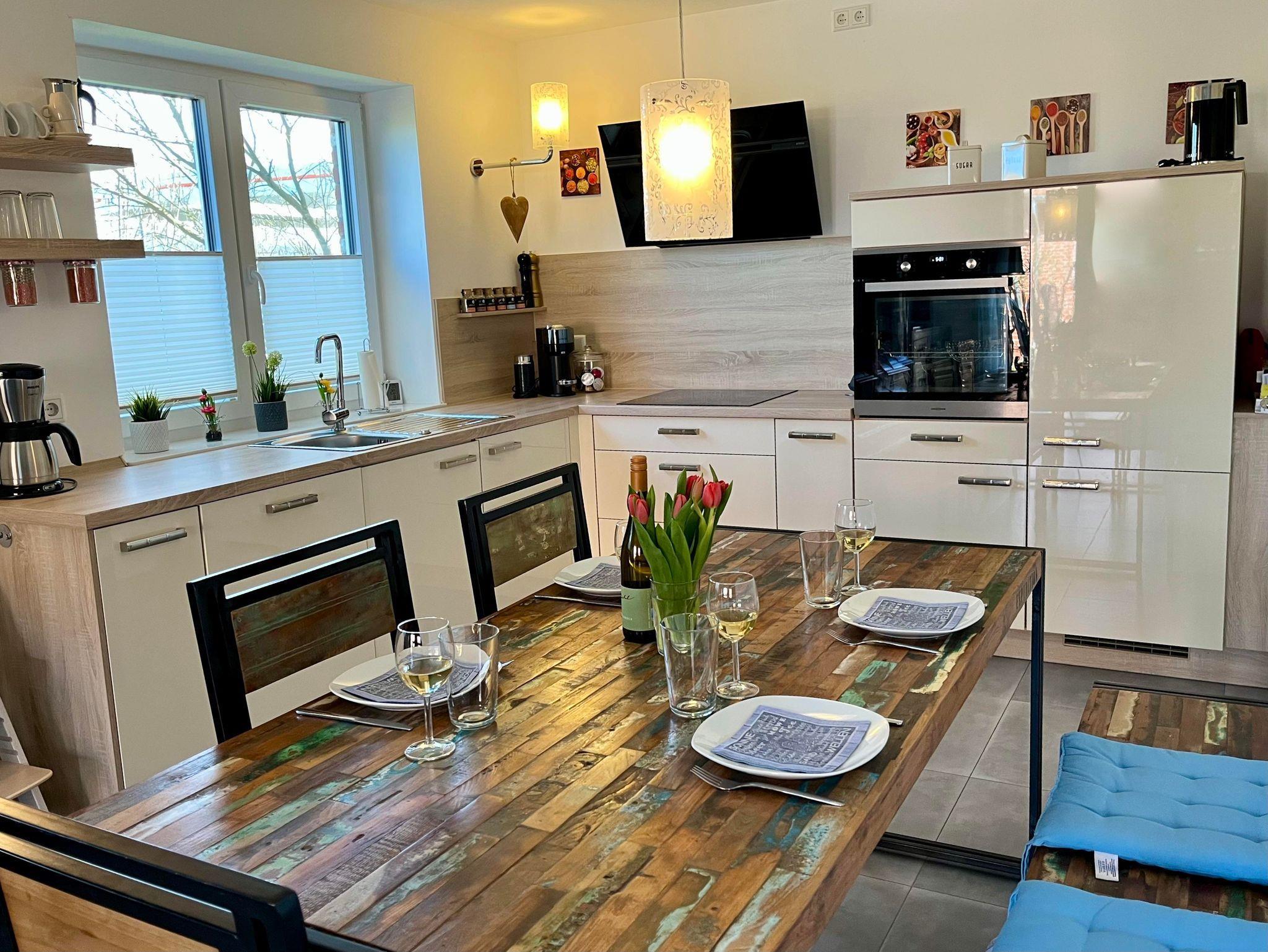 In der großen offenen Wohnküche ausgestattet mit hochwertigen Elektrogeräten, incl. Cerankochfeld, Backofen, Spülmaschine und Kühl-/Gefrierschrank, lassen sich kleine und große Gerichte hervorragend zubereiten.