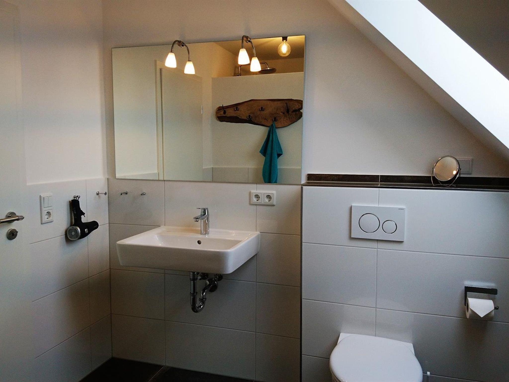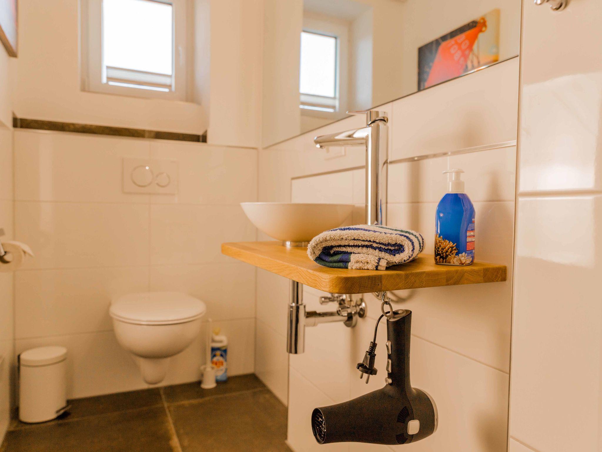 Ebenfalls im Erdgeschoss befindet sich ein Bad mit WC und bodengleicher Dusche und der Hauswirtschaftraum mit Waschmaschine.
