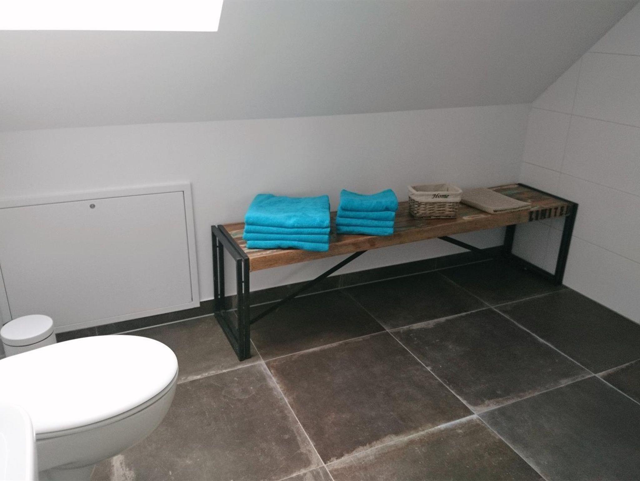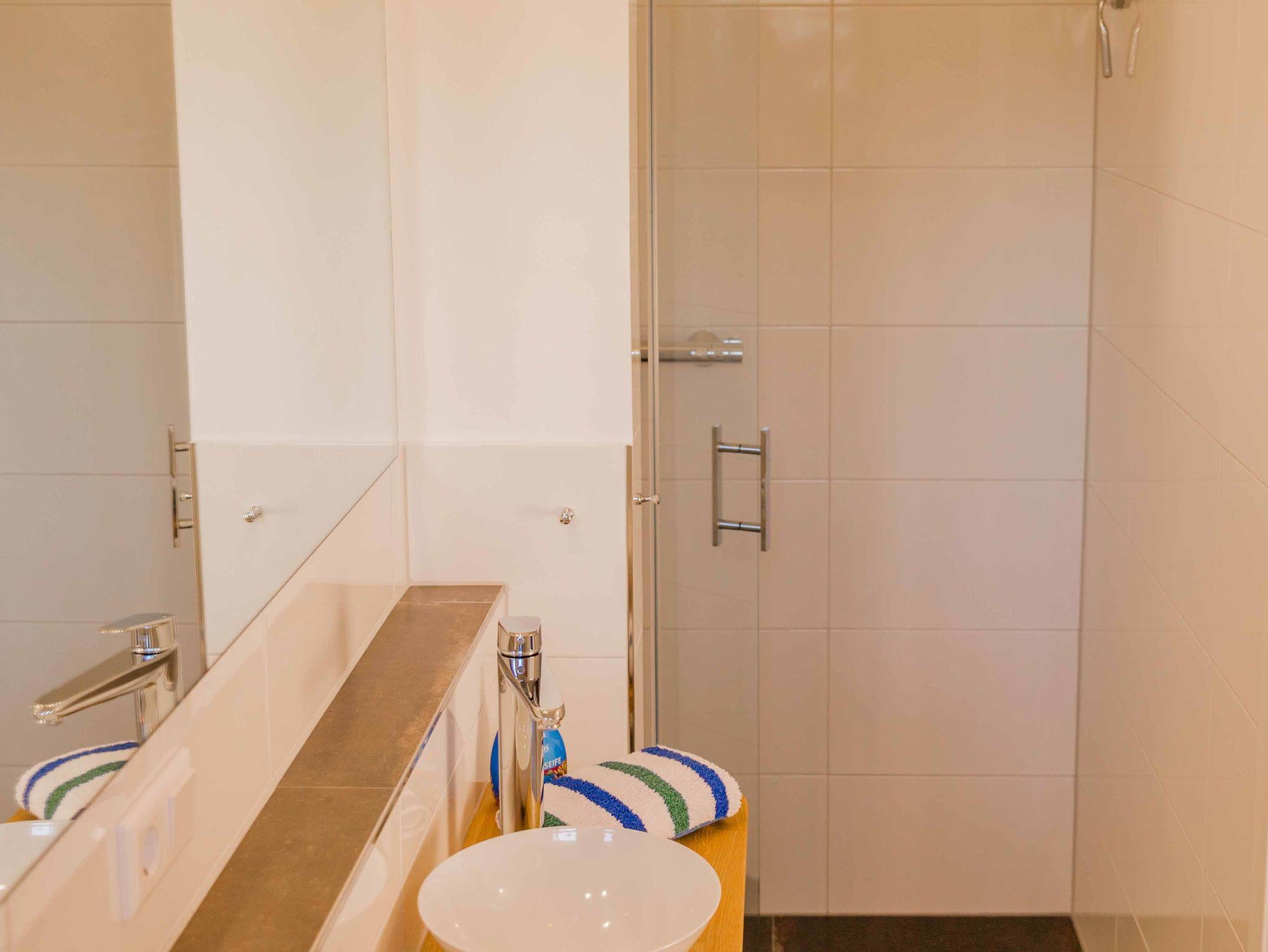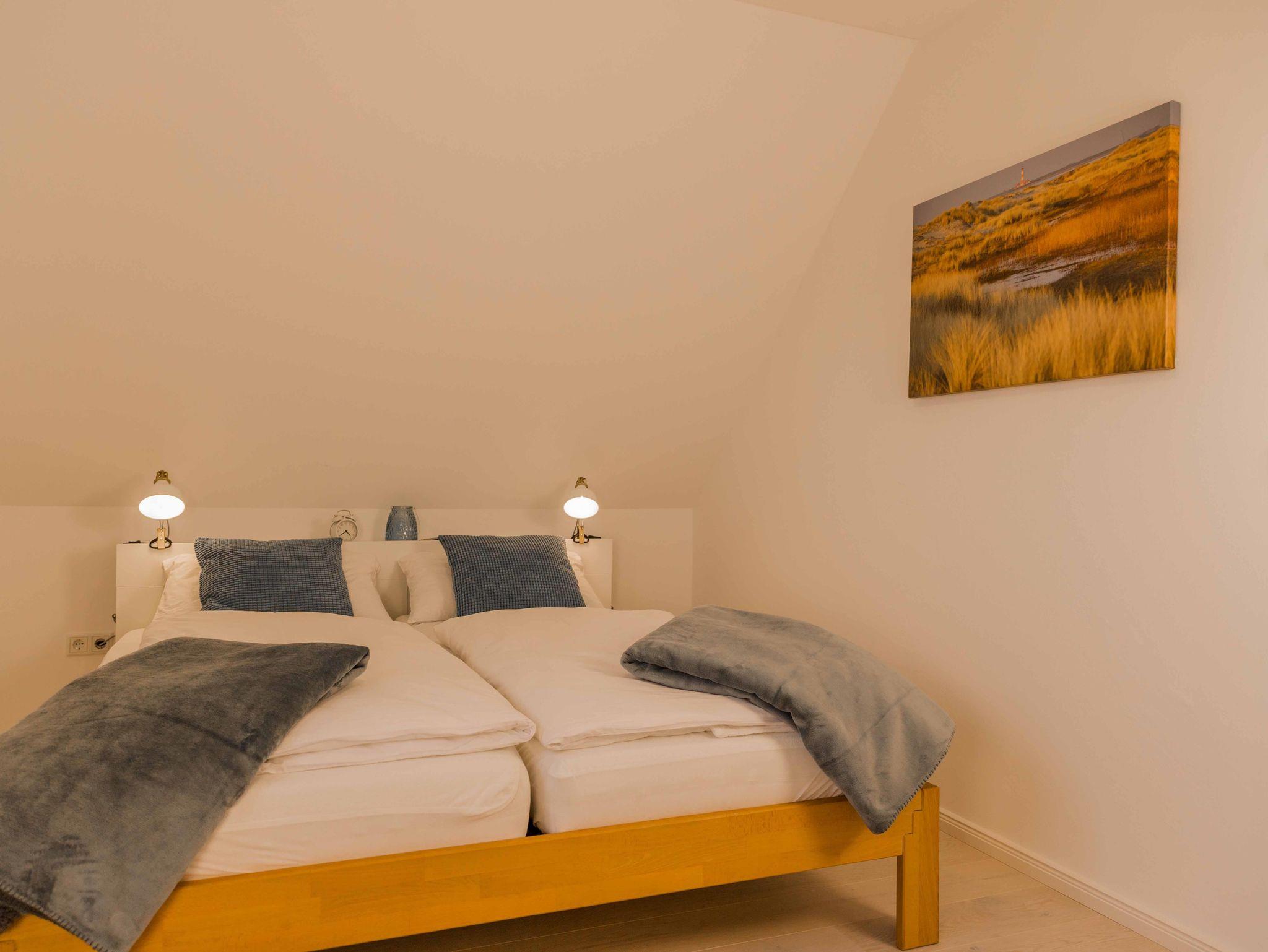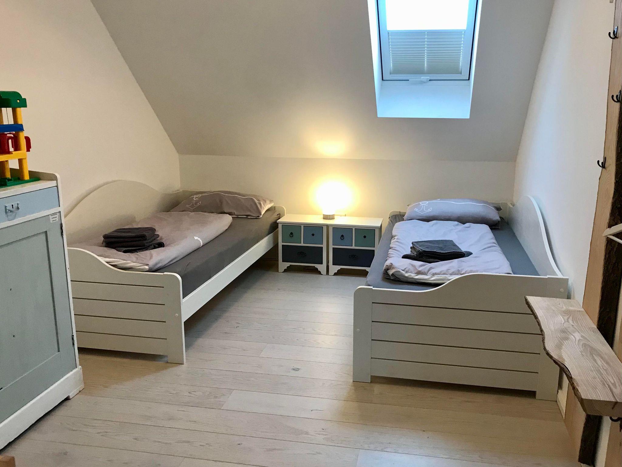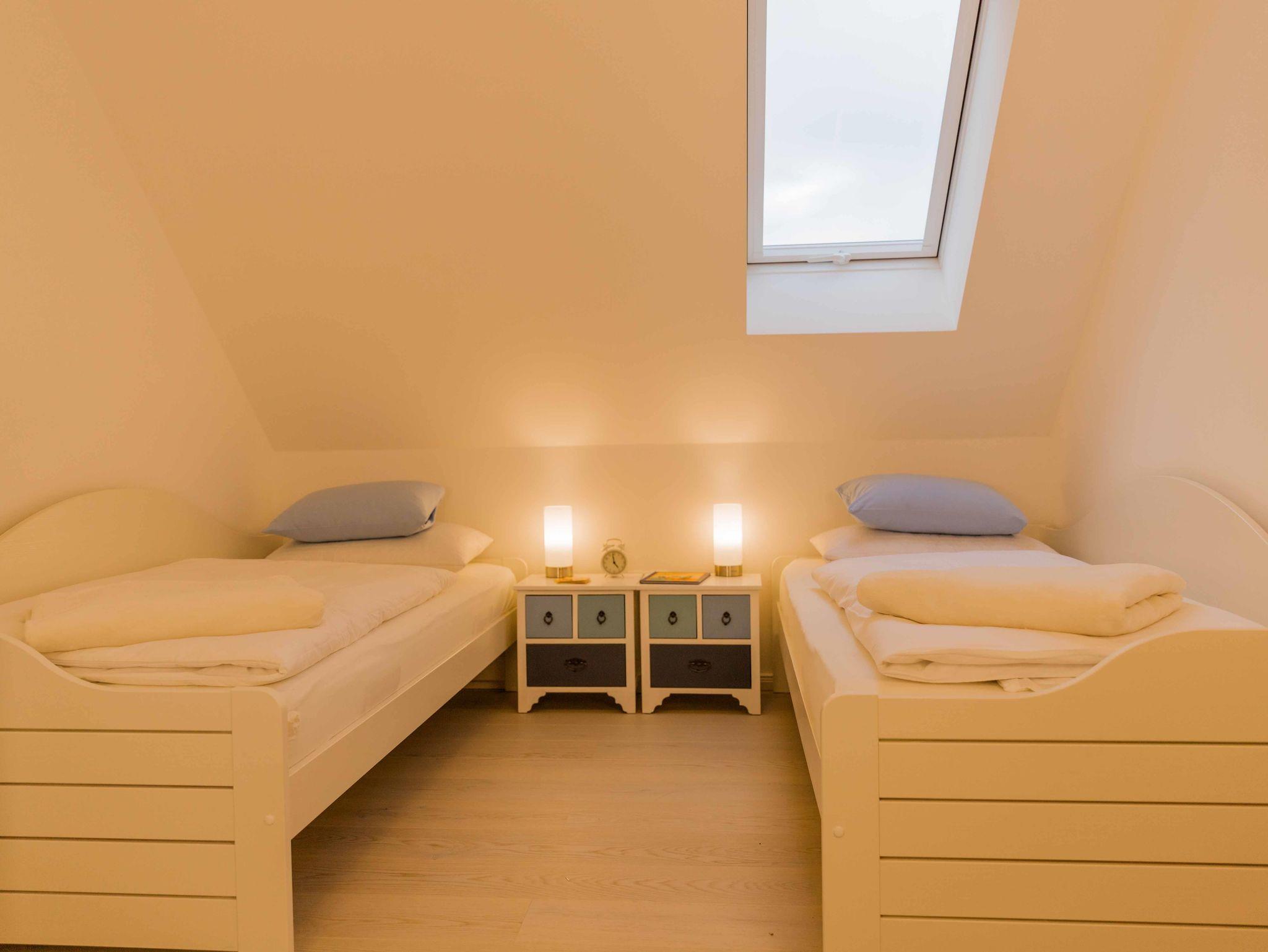 Die Schlafzimmer sind im Obergeschoss, davon eins mit Doppelbett mit verstellbaren Lattenrosten (180x200cm) und Fernseher, eins mit Doppelbett (180x200m) und ein Kinderzimmer mit zwei Einzelbetten (90x200cm). Ein Badezimmer mit großer, bodengleicher Dusche und Regenbrause finden Sie ebenfalls hier.