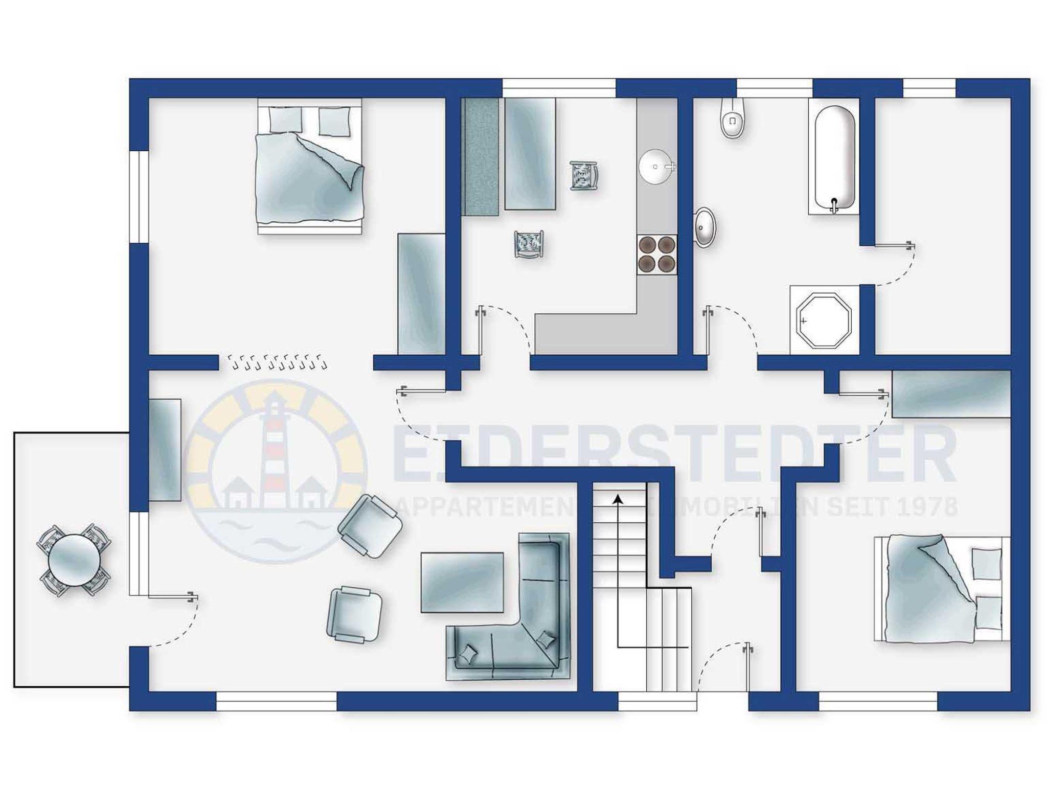 Gemütliche 3-Zimmer-Ferienwohnung im Haus Hildegard mit ca. 78 qm auf 1 Ebene (EG) für bis zu 4 Personen. In ruhiger Lage im Ortsteil Bad in St. Peter-Ording. Ein kleiner Hund ist herzlich willkommen.
