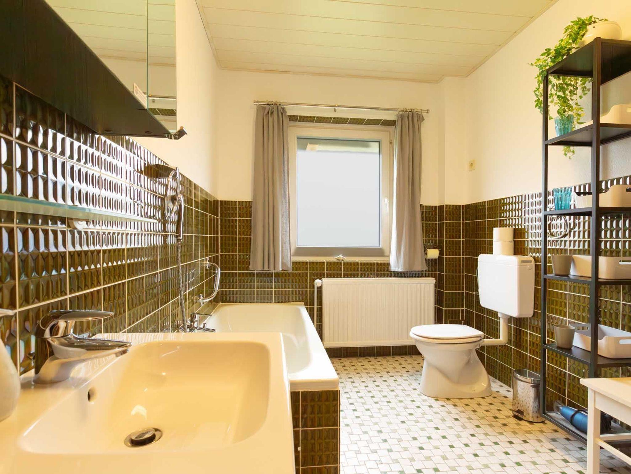 Badezimmer (Wannenbad) mit Badewanne, separater Dusche, WC, Tageslicht und Föhn.