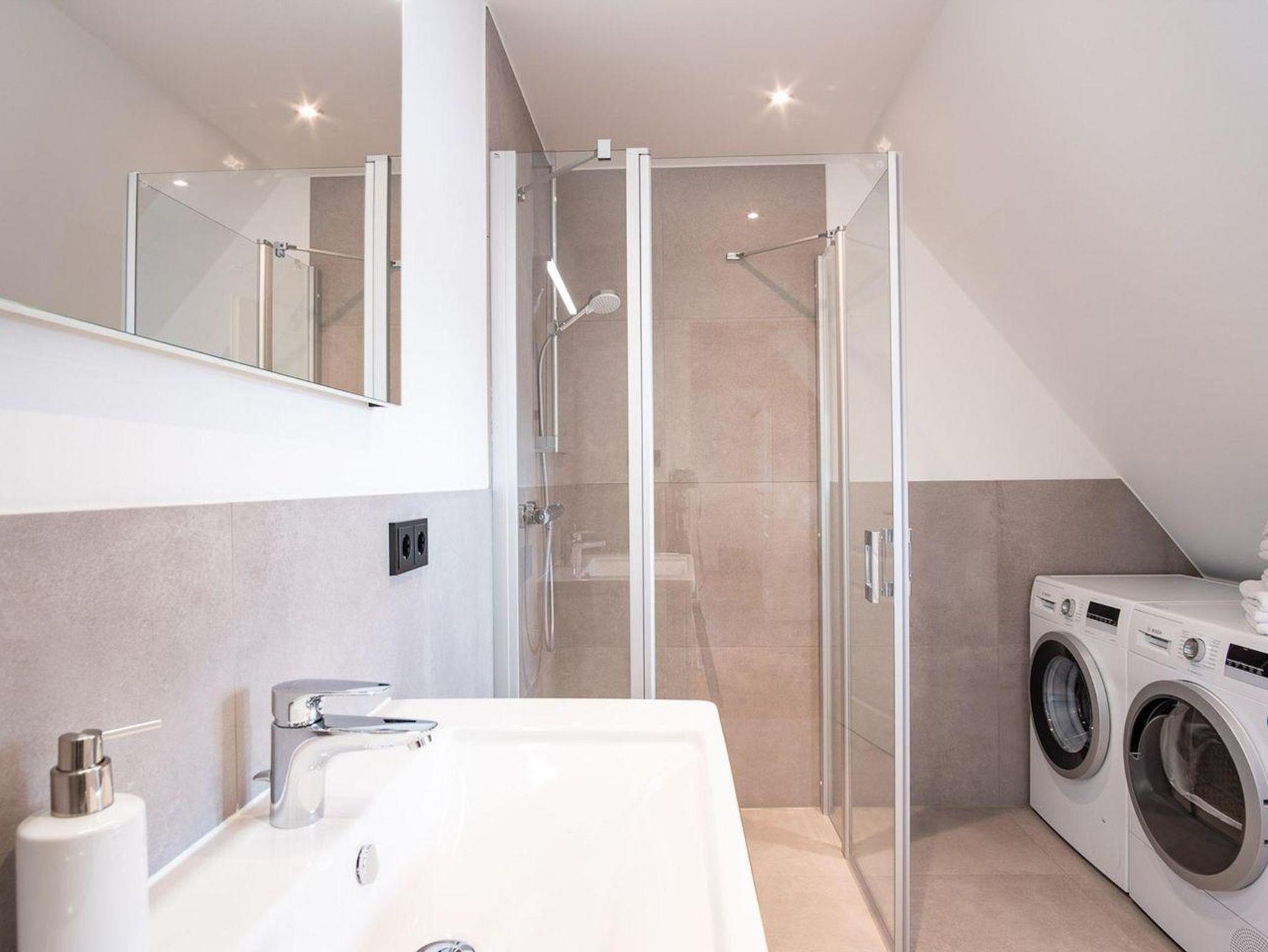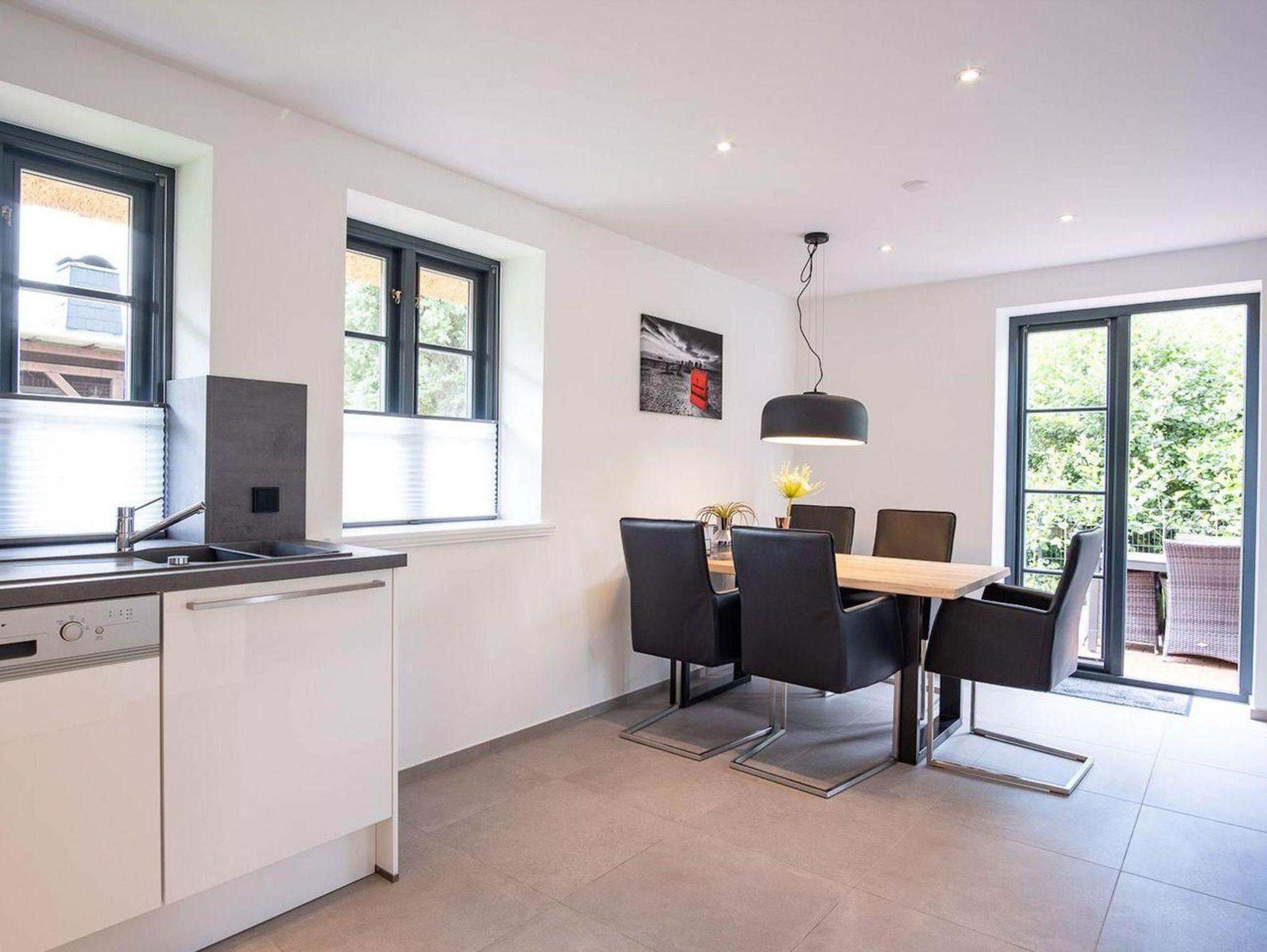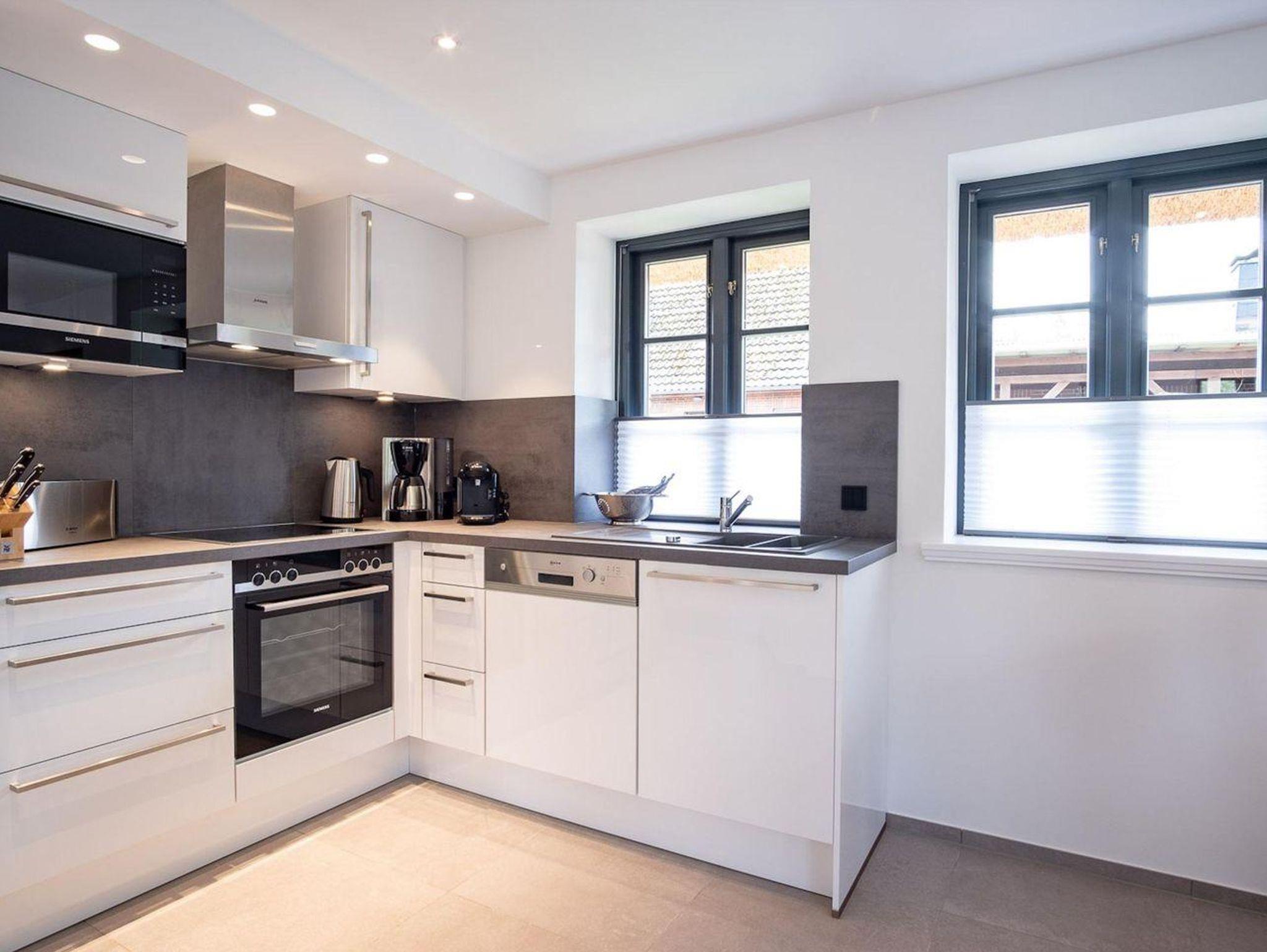 Im Erdgeschoss befindet sich der lichtdurchflutete Wohnraum mit TV, einer luxuriösen, angrenzenden Küche sowie einem stilvollen Essbereich. Der Wohnraum ist mit modernen, stylischen Möbeln eingerichtet. Die Küche verfügt über hochwertige Elektrogeräte und ist voll ausgestattet. An den Wohnbereich schließen sich ein Flur, ein Duschbad und ein Doppelschlafzimmer mit TV an.