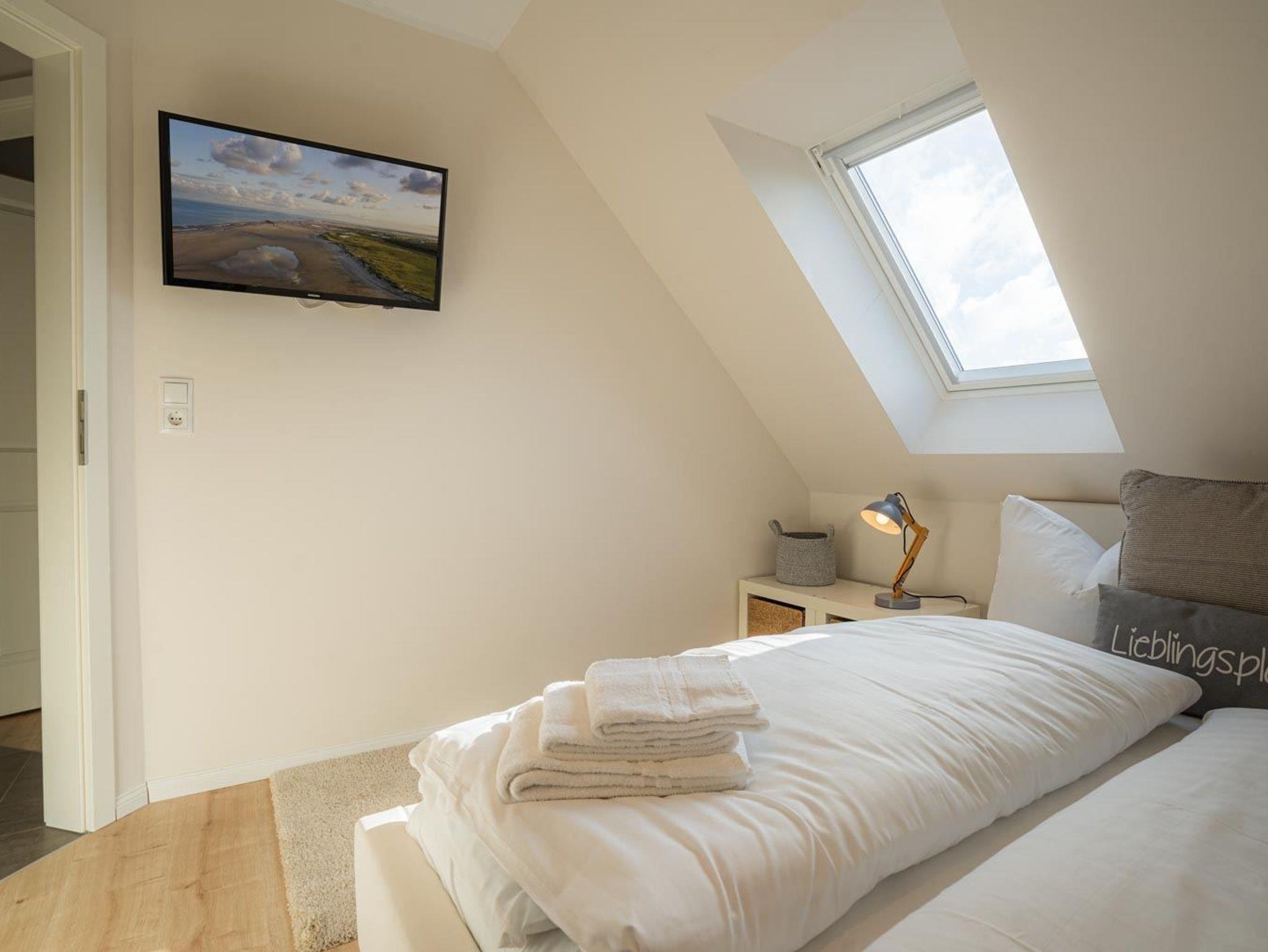 3 Schlafzimmer: Doppelbett (90x200 cm), zwei französische Doppelbetten (140x200 cm), jeweils mit hochwertigen Bugatti-Matratzen, Kleiderschränken, SMART-TV und abdunkelbaren Fenstern mit Fliegengittern. 2 Bäder: Duschbad mit Regen-Dusche, Wannenbad mit Fußbodenheizung.