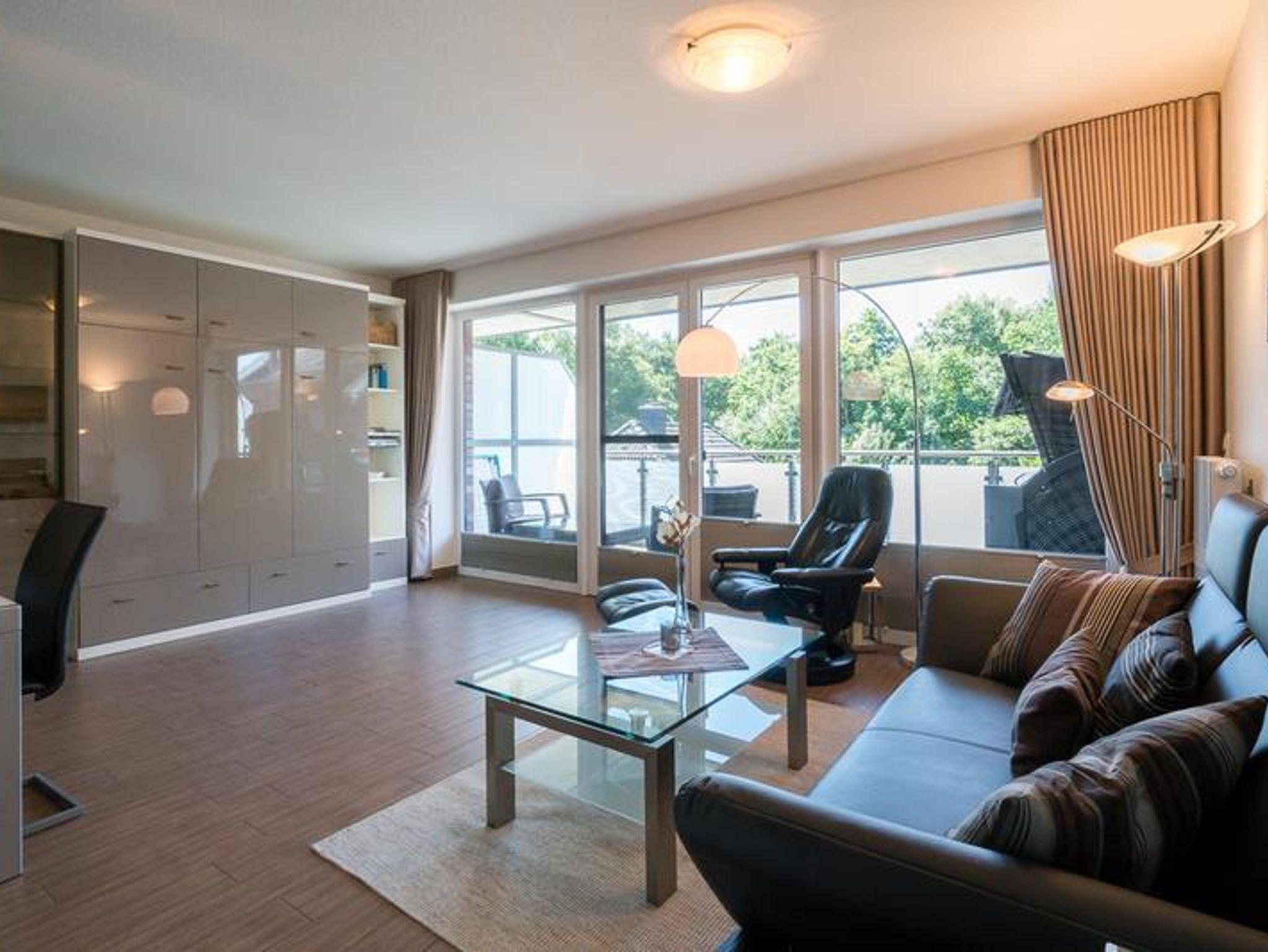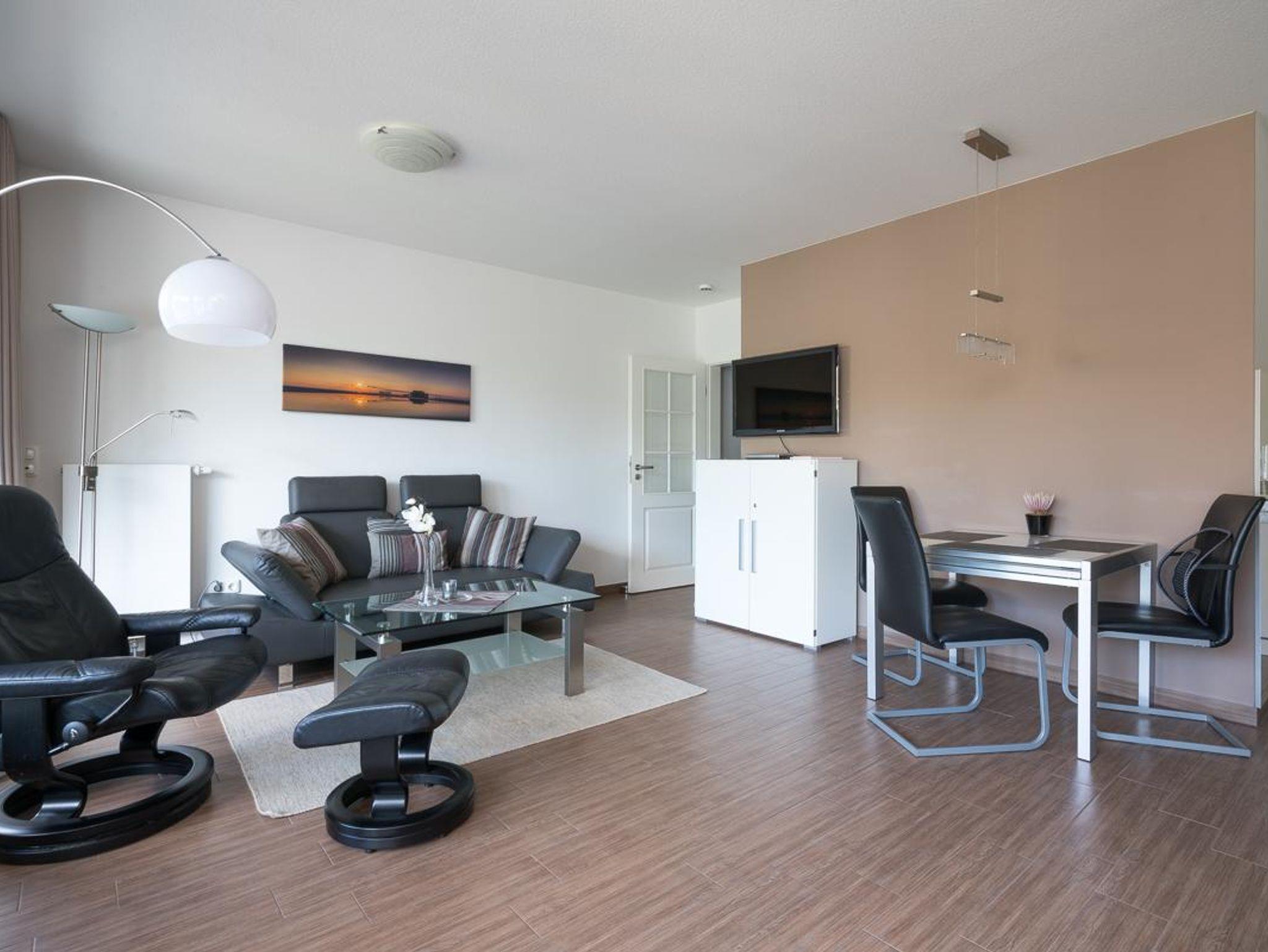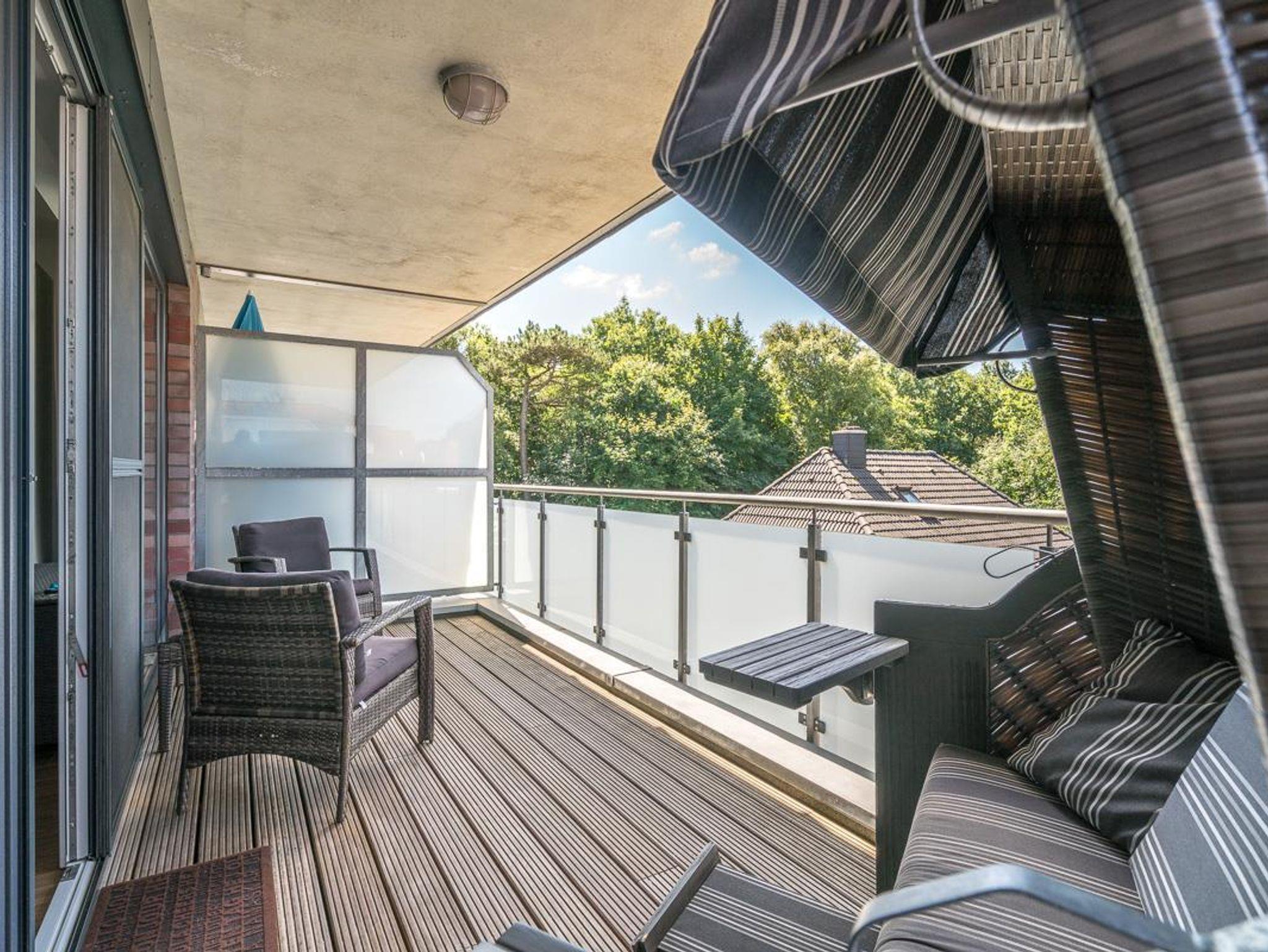 Attraktiver Neubau direkt am Waldrand in bester Lage. 2-Zimmer-Appartement,1. Etage (auch Aufzug vorh.). Exclusive Ausstattung. Flur. Duschbad/WC mit Fön. Wohnraum mit einem Stressless-Sessel u. Sofa., Essecke, LCD-TV, Radio mit CD Player und DVD Player. Möbl. Südwestloggia. Küchenzeile mit 4-Platten-Herd (Ceran), Backofen, Mikrowelle, Geschirrspüler. Schlafraum mit Boxspringbett und TV. Wäschepakete inklusive ( Betten sind bezogen, 1 Handtuch und 1 Duschhandtuch pro Person). Böden mit Fliesen. Insektenschutz. PKW-Platz sowie Fahrradabstellplatz. Gemeinschaftswaschraum (Münz- maschinen) im Keller. Möblierter Balkon mit Strandkorb, Tisch u. Stühlen NICHTRAUCHER. Kostenloses W-LAN. Keine Haustiere erlaubt.