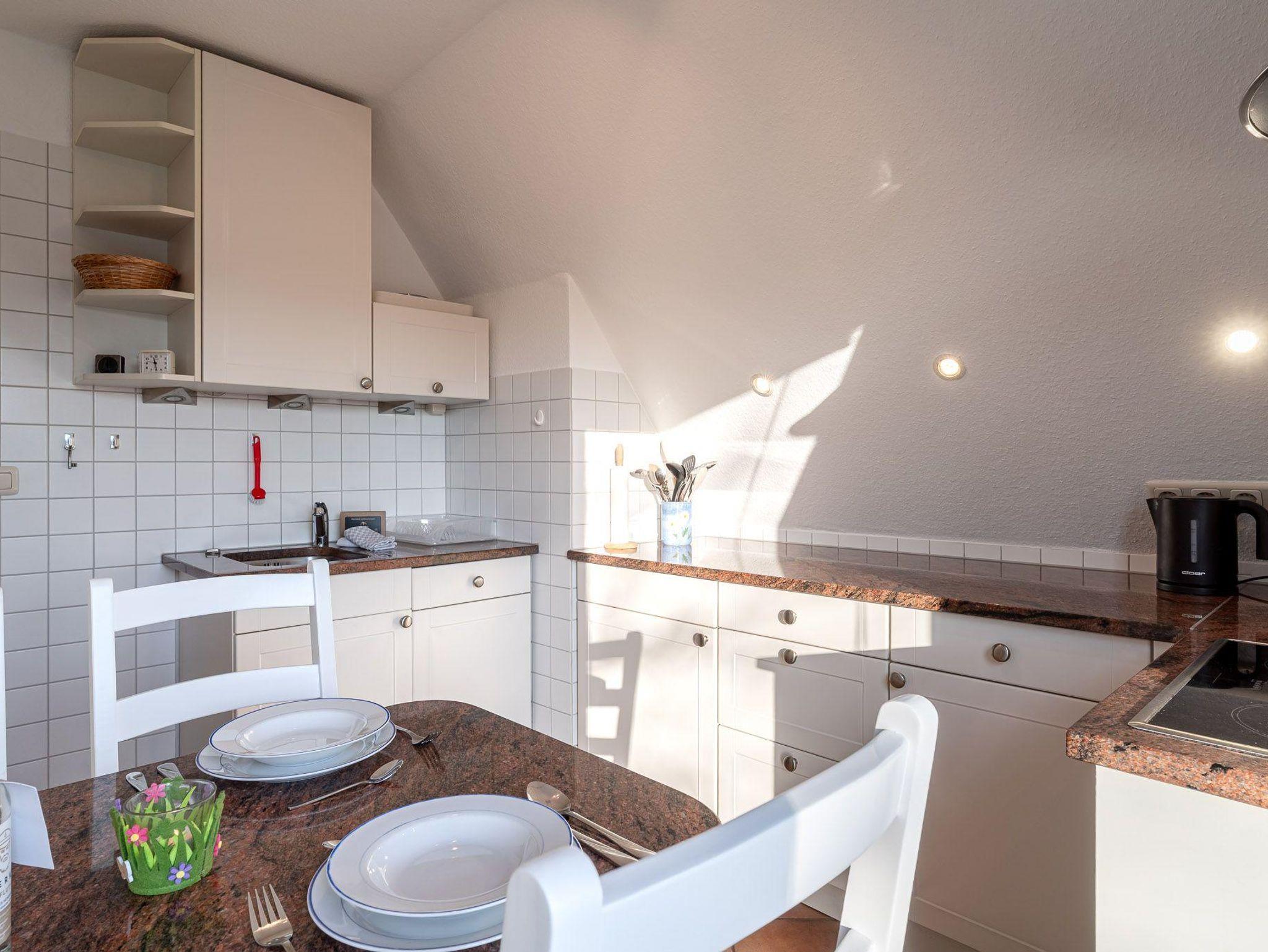 Die geschlossene Küche ist modern ausgestattet und bietet Ihnen vielfältige Möglichkeiten zur Selbstverpflegung: Ein Ceran-Herd, Elektro-Backofen, Kühlschrank, Spülmaschine, Wasserkocher, Toaster sowie Kaffeemaschine stehen bereit. Hinzu kommen sämtliche wichtigen Küchenutensilien, Geschirr, Besteck und Geschirrhandtücher. So können Sie sich unabhängig und flexibel versorgen.