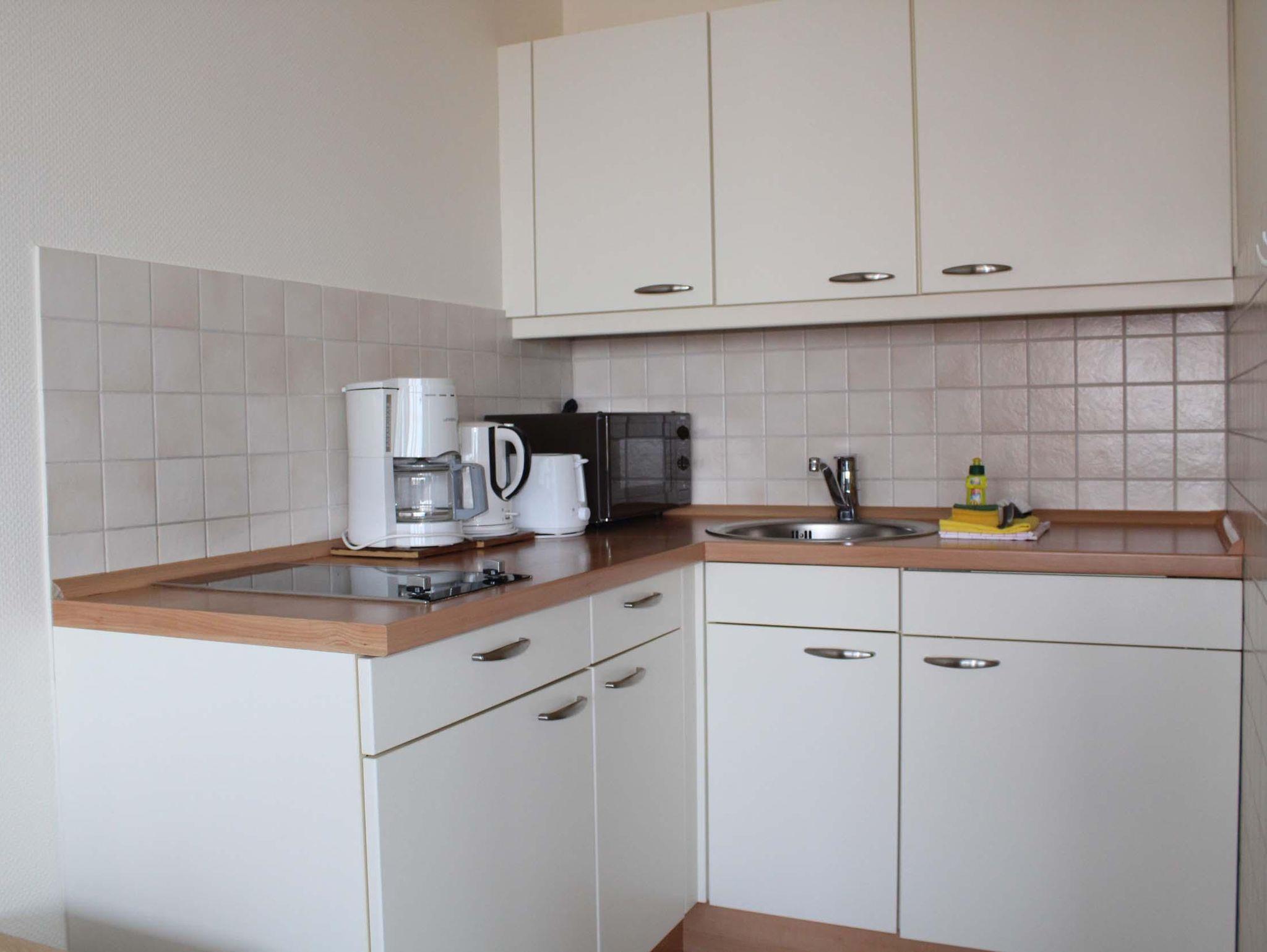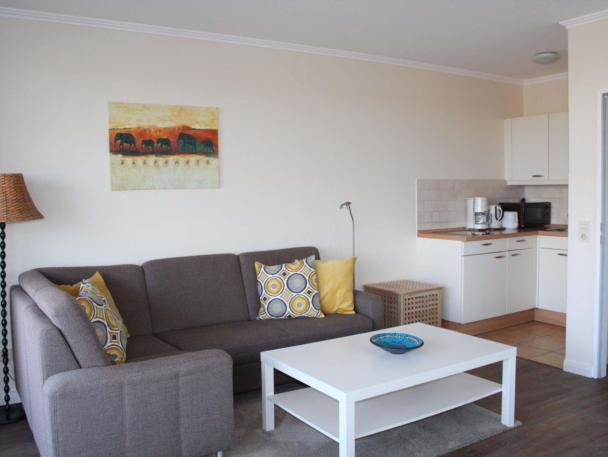 Schlafraum mit 2 Einzelbetten (je Bett 190 x 90), Wohnraum, Laminatfußboden, Essecke, Küchenzeile mit Mikrowelle, Dusche/WC, Kabel-TV, Durchwahltelefon, Balkon, PKW-Platz-Nr. 60, Aufzug und Fahrradkeller.