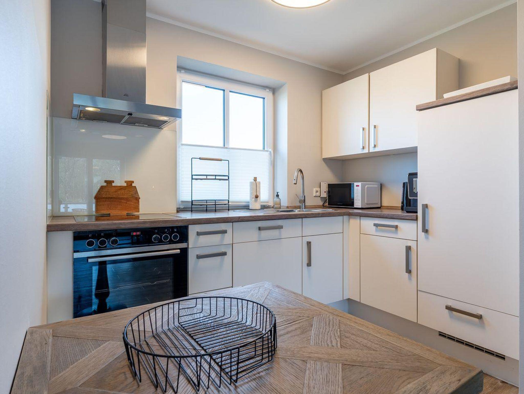 Diese moderne und stilvoll eingerichtete Wohnung bietet auf 60 m² genügend Platz für bis zu drei Personen. Der offene Wohnbereich verbindet Küche und Wohnzimmer harmonisch und ist der perfekte Ort, um sich nach einem erlebnisreichen Tag zu entspannen. Genießen Sie die Zeit bei einem gemütlichen Abendessen, das Sie in der voll ausgestatteten Küche zubereiten können. Hier stehen Ihnen moderne Geräte wie ein Cerankochfeld, Backofen, Kühlschrank mit Gefrierfach, Geschirrspüler, sowie kleine Küchengeräte wie Wasserkocher und Kaffeemaschine zur Verfügung.