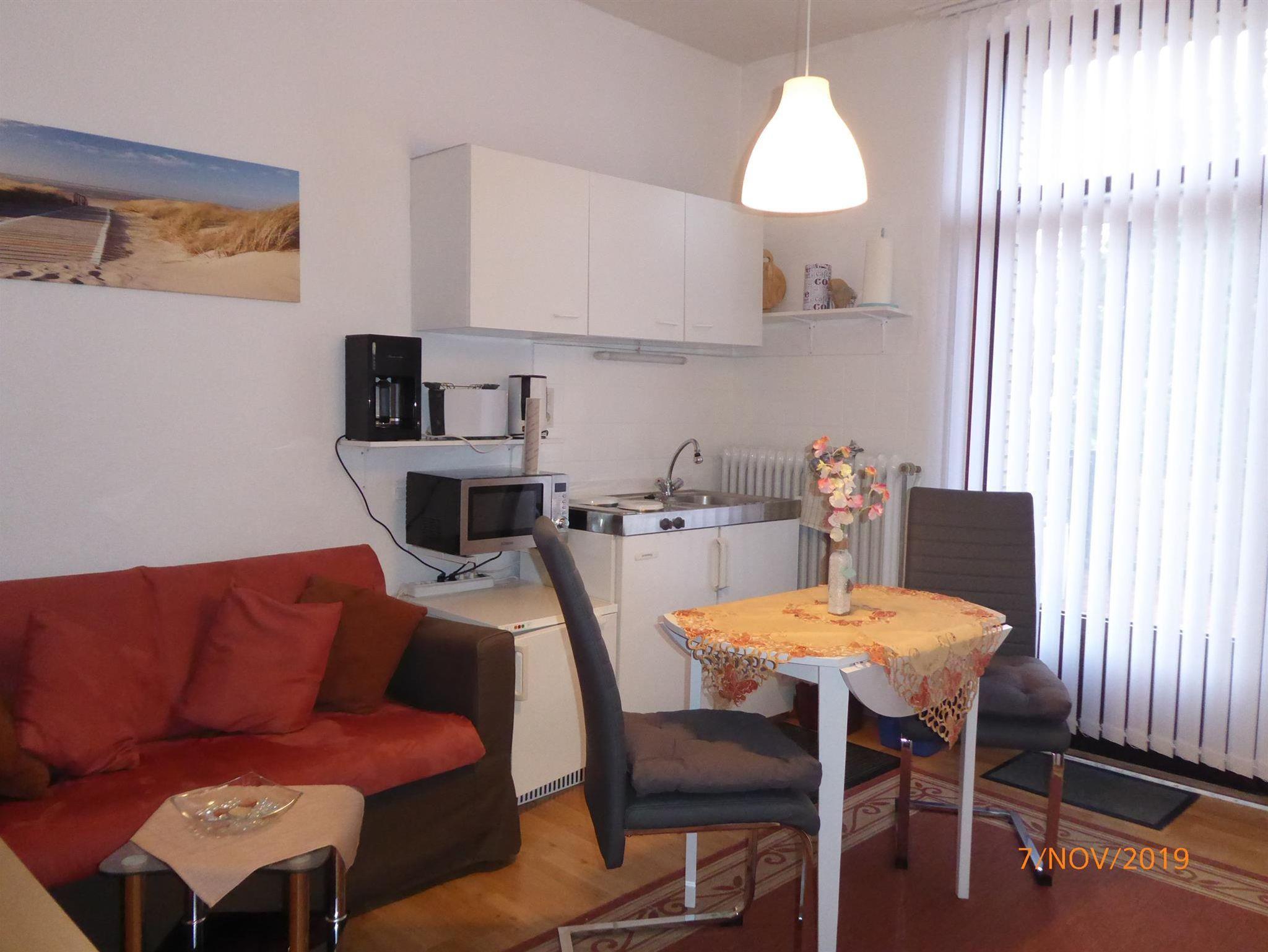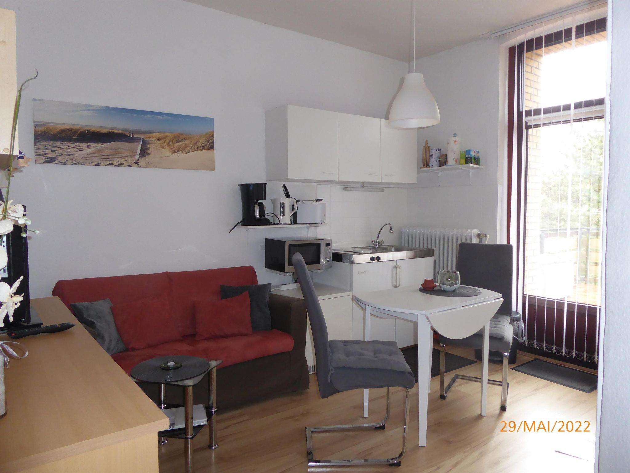 Wohnraum inkl. SAT-TV und kleiner Stereoanlage, mit integrierter Pantryküche. (Microwelle, Wasserkocher, Töpfe, Geschirr, etc. vorhanden.)Wir möchten Sie darauf hinweisen ,dass es ein Nichtraucherappartement ist !