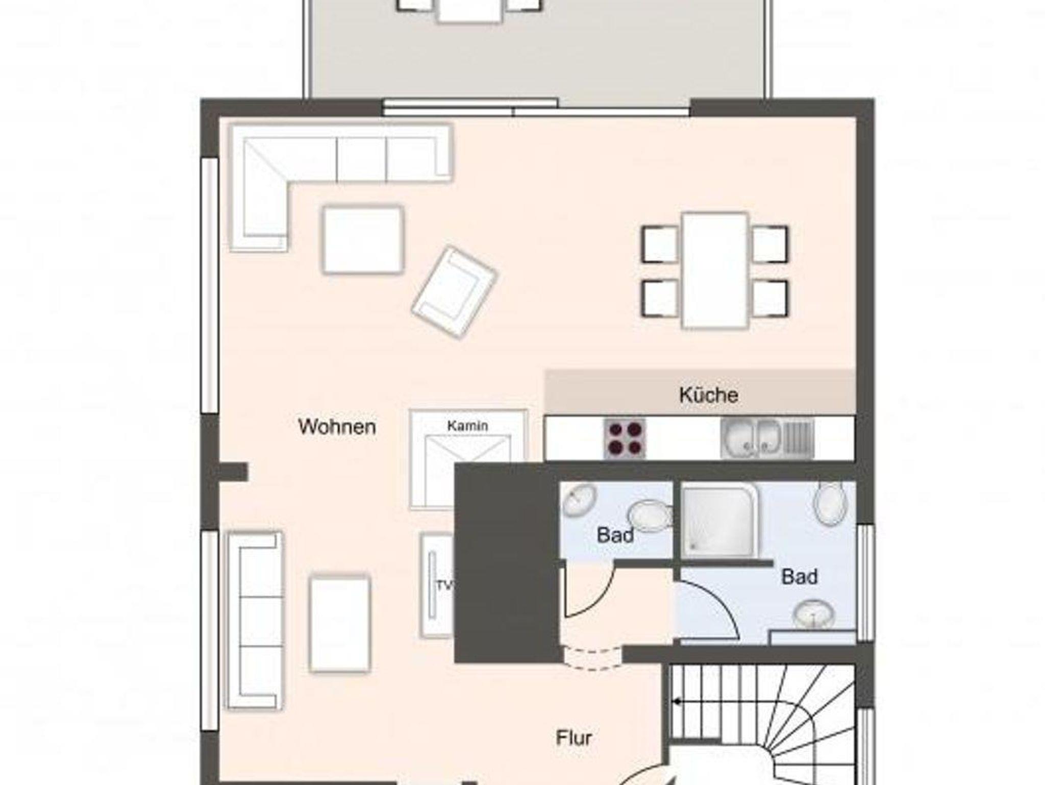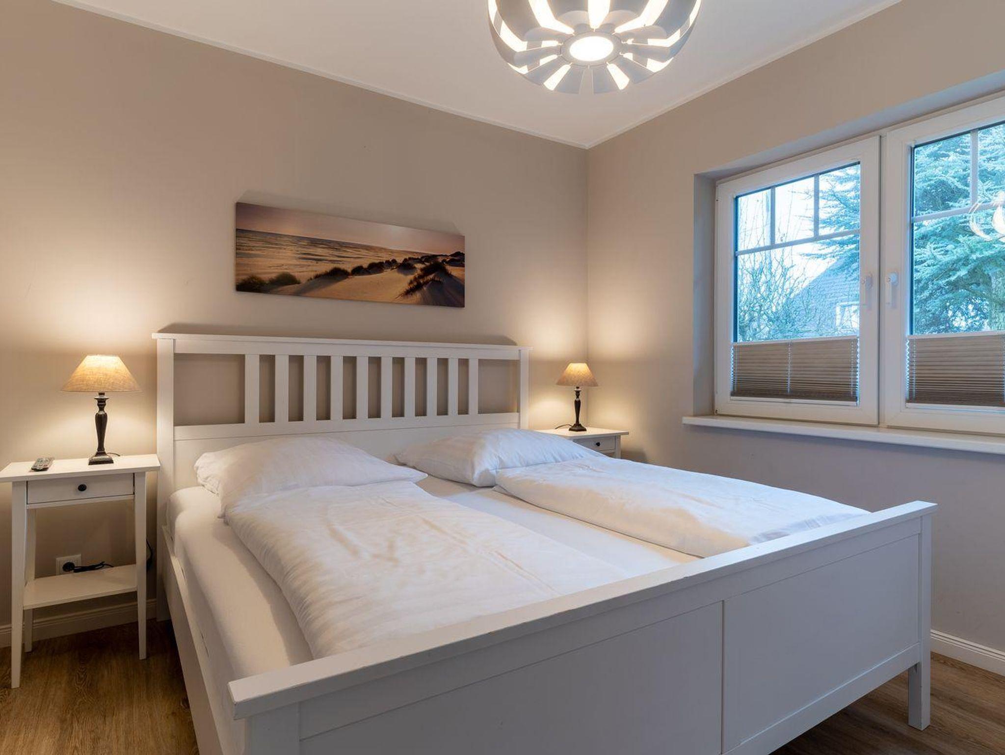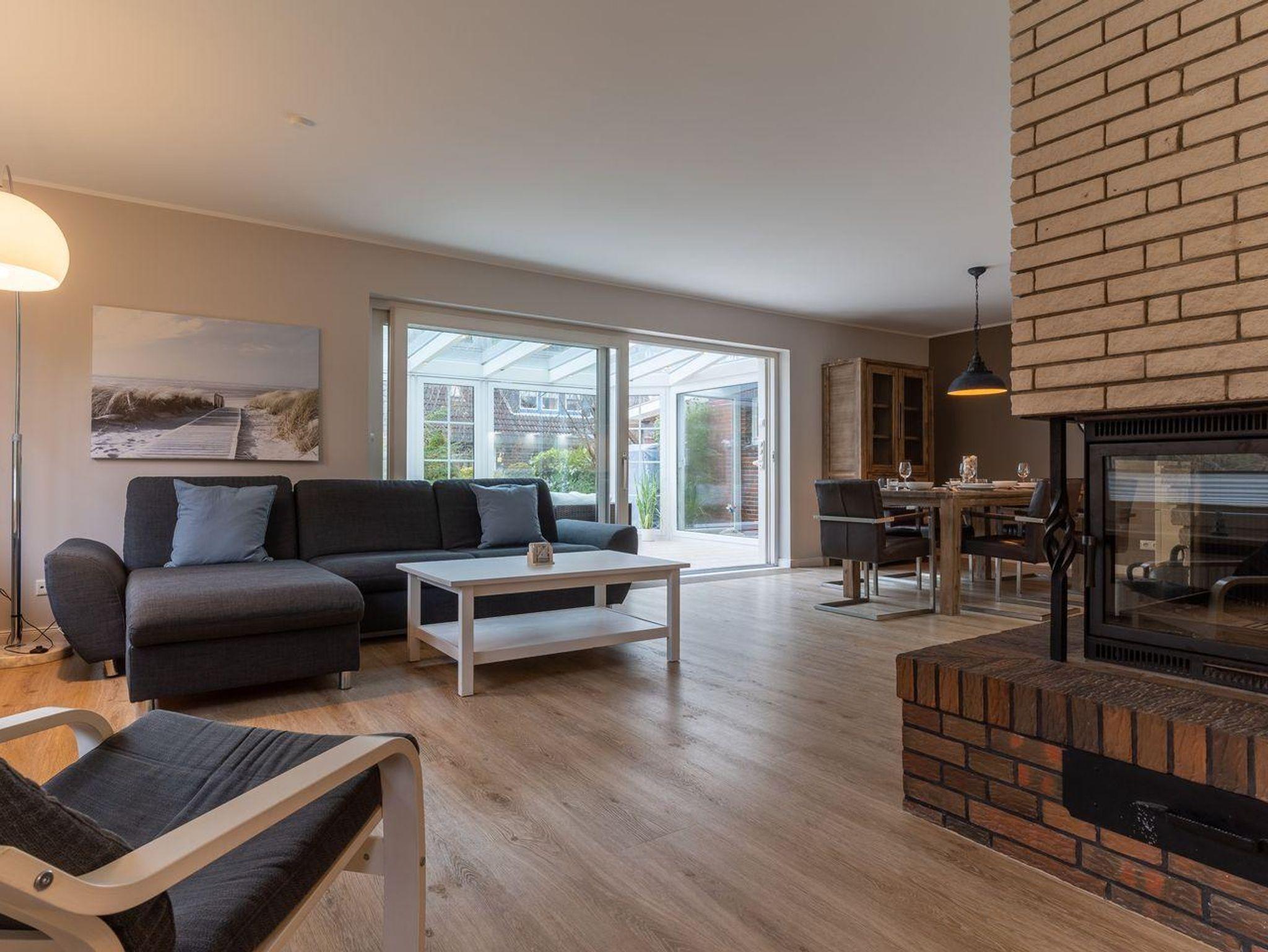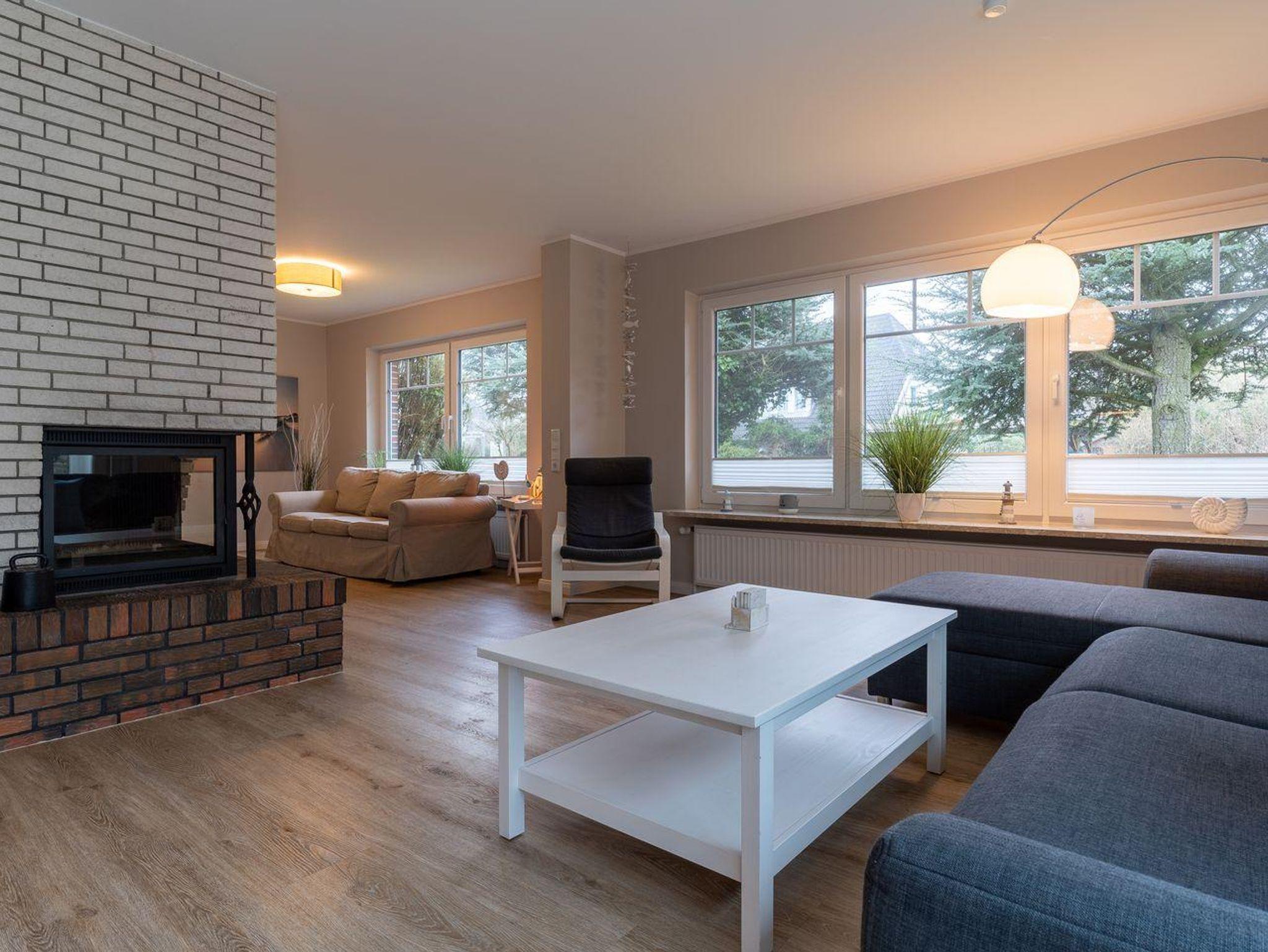 Die Wohnung befindet sich im Erdgeschoss und hier befindet sich der lichtdurchflutete und sehr großzügige Wohnraum mit TV, Kamin und einem stilvollen Essbereich, sowie einer modernen Wohnküche. Die Wohnräume sind mit neuen und modernen Möbeln ausgestattet. An den Wohnbereich schließen sich ein Flur mit Garderobe, und ein Duschbad, sowie ein Gäste WC an.Die beiden Schlafzimmer sind jeweils mit einem Doppelbett ausgestattet (1,80 x 2,00 und 1,40 x 2,00 m) und die Kleiderschränke gewähren Ihnen hinreichend Ablageflächen. Zusätzlich gibt es im Wohnzimmer ein gemütliches Schlafsofa für 2 Personen. Darüber hinaus befindet sich am Wohnzimmer ein großer Wintergarten und bringt Sie sofort in Urlaubsstimmung.Das Grundstück mit Stellplatz, Rasenfläche und einer geschützten Terrasse ist mit heimischen Pflanzen angelegt.