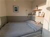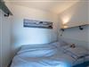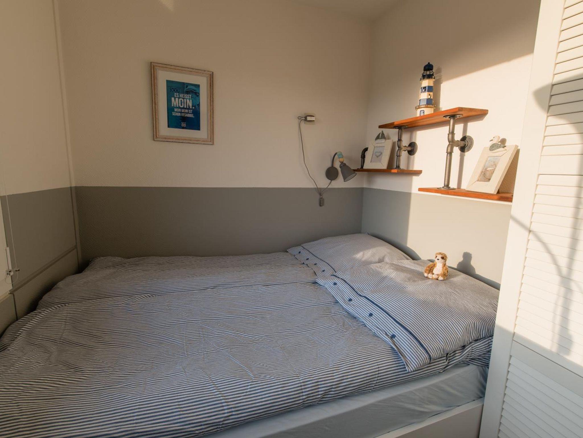 Schlafbereich mit Doppelbett (160 cm) durch Schiebevorhang von dem Wohnraum getrennt.