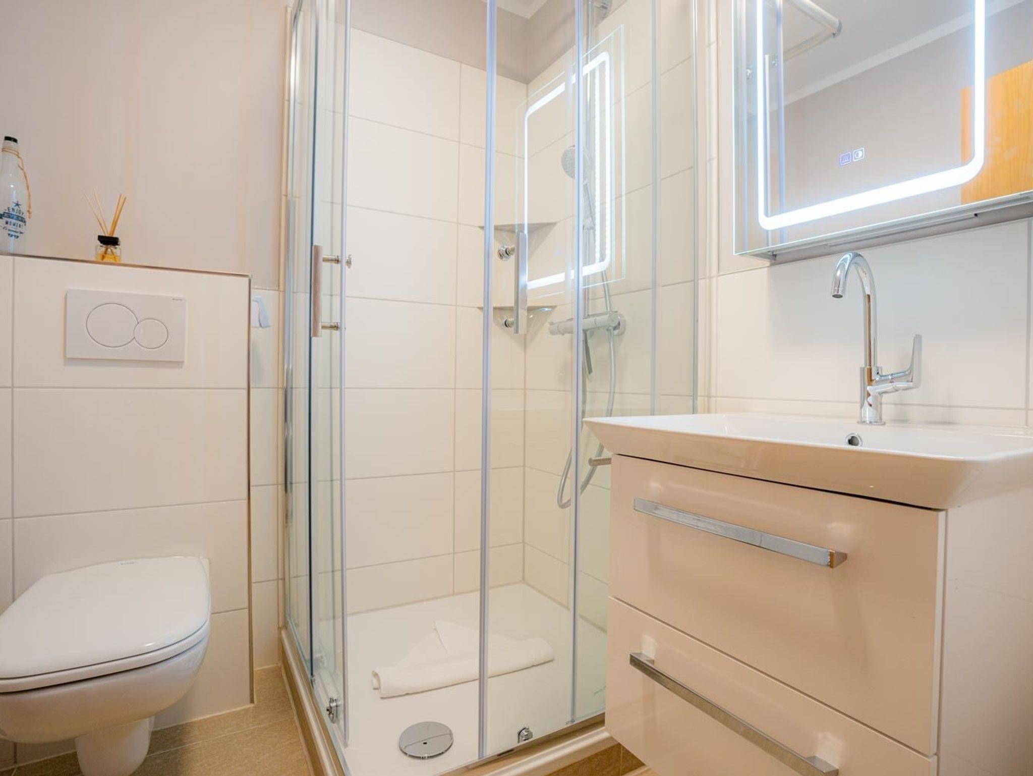 Badezimmer (Duschbad) mit Dusche, WC, Heizlüfter und Föhn.
