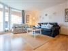 Wohnzimmer mit 2 Sofas (3er und 2er), Esstisch mit 5 Stühlen, TV (Kabel) und DVD-Player. Direkter Zugang zum möblierten Balkon.