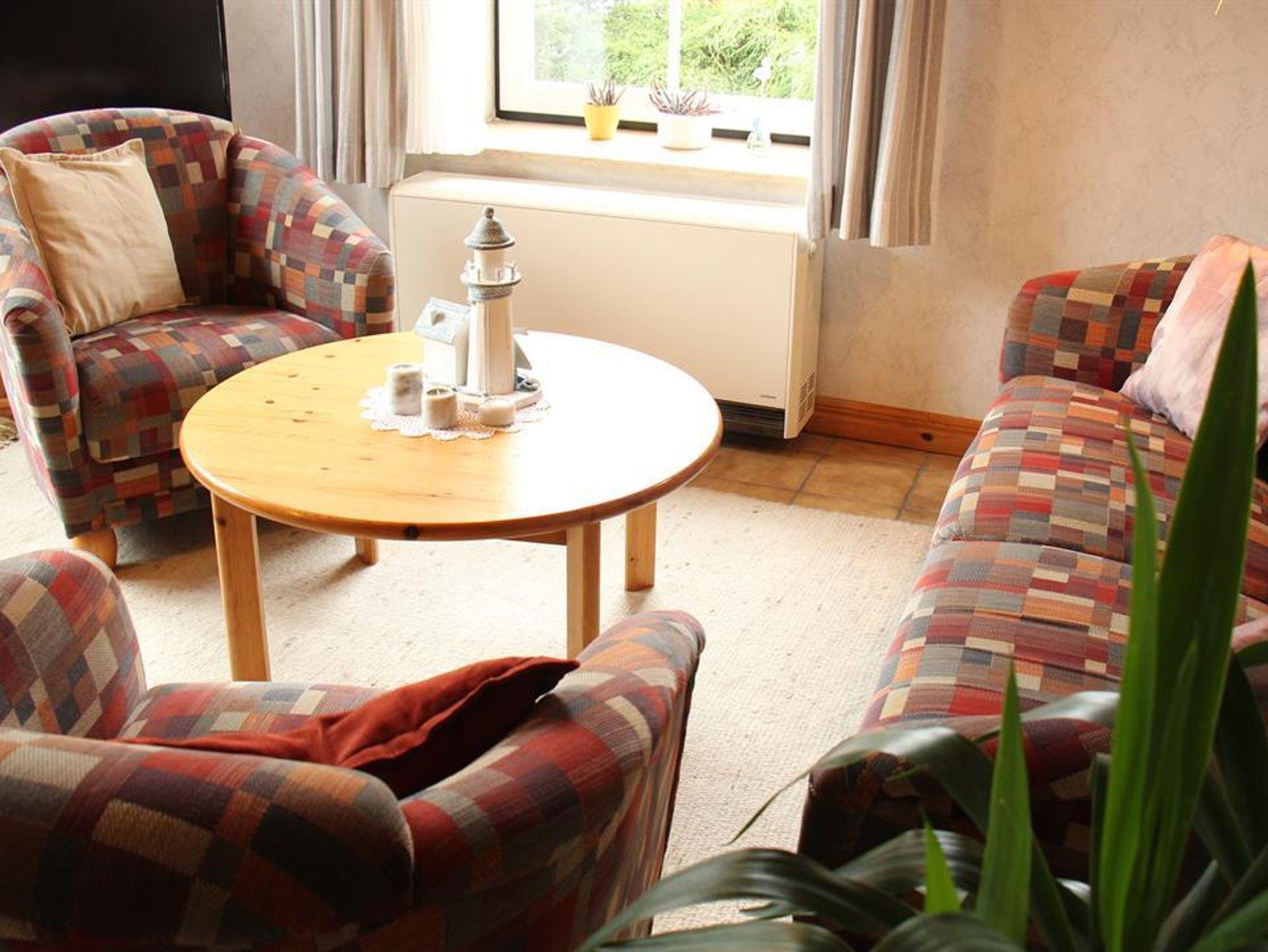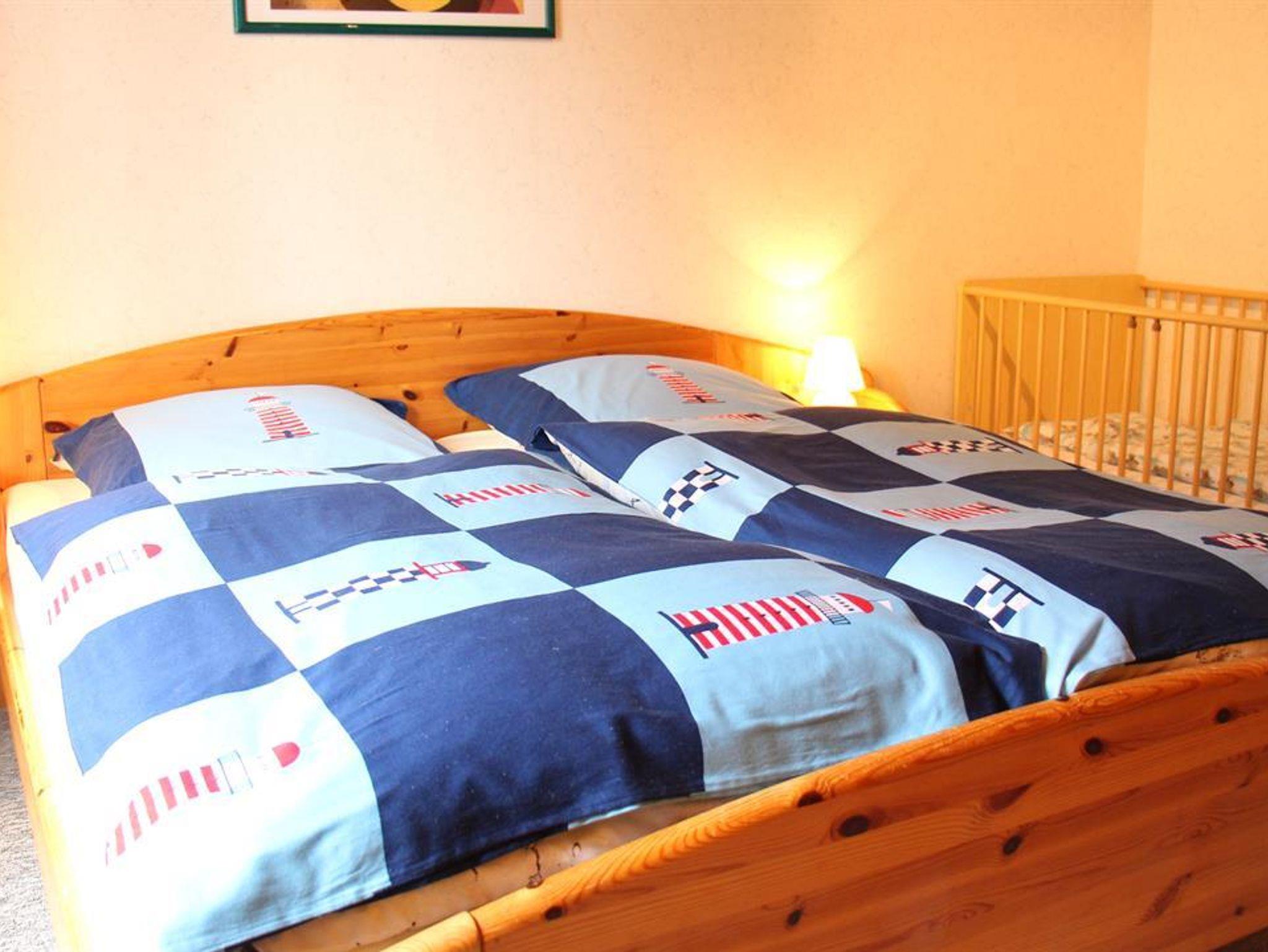 1 Wohn-Eßraum mit Küchenzeile (u.a. mit Mikrowelle), Kabel-Farb-TV, Radio (mit CD-Player). 1 Schlafraum mit Doppelbett. 1 Schlafraum mit 2 Einzelbetten. Dusche/WC. Abstellraum. Tresor. Deckenholzvertäfelung. Die Wohnung ist liebevoll im nordischen Stil eingerichtet. Bettwäsche und Handtücher müssen mitgebracht werden. Kinderhochstuhl und Kinderbett auf Wunsch nach Verfügbarkeit. Neue Designbelagböden in den Schlafzimmern.