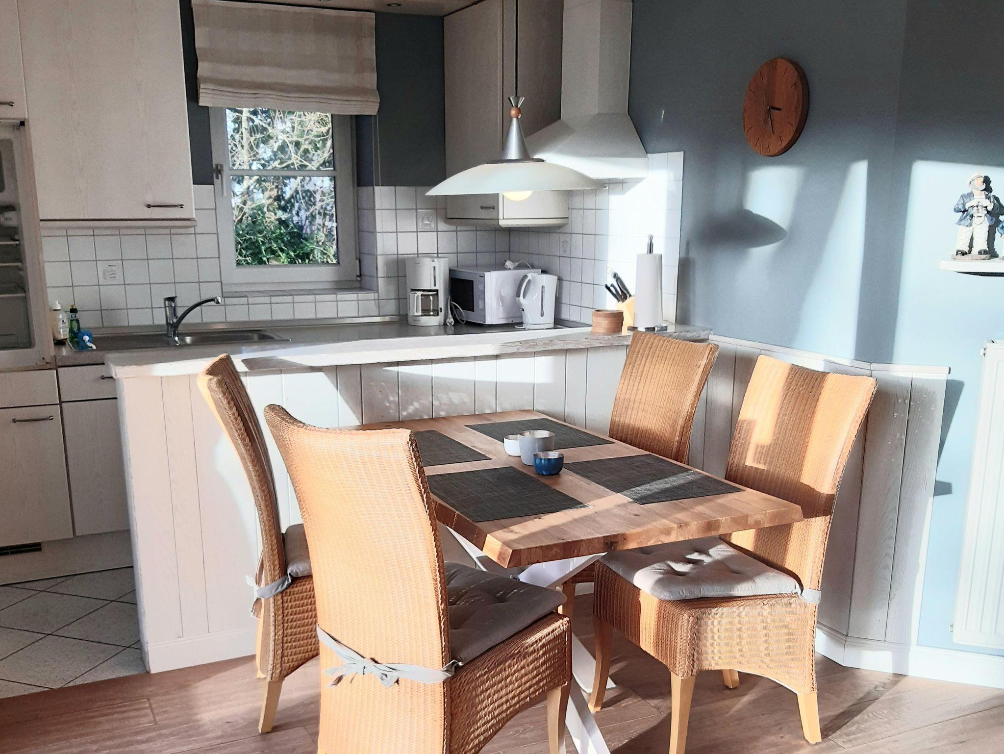 Appartementhaus in ruhiger, reizvoller Wohnlage. ERDGESCHOSS: Flur. Bad mit Wanne und Dusche, WC. 1 Schlafraum mit Doppel- bett, 1 Schlafraum mit 2 Einzelbetten. Schlafräume mit Korkboden (100% natürlich,fußwarm, antiallergisch). Wohnraum mit Sitzecke, TV, Radio, möbl. Südwest-Terrasse mit Strandkorb und 5-tlg. Gartenmöbel-Set. Integrierte Küchenzeile (Cerankochfeld, Backofen, Mikrowelle, Geschirrspüler).Essecke. Abstellraum. Im Keller Waschraum mit Münz-Waschmaschine und -trockner.Gaszentralheizung. PKW-Platz. Nichtraucherappartement. Keine Tiere. Internetanschluss vorhanden.