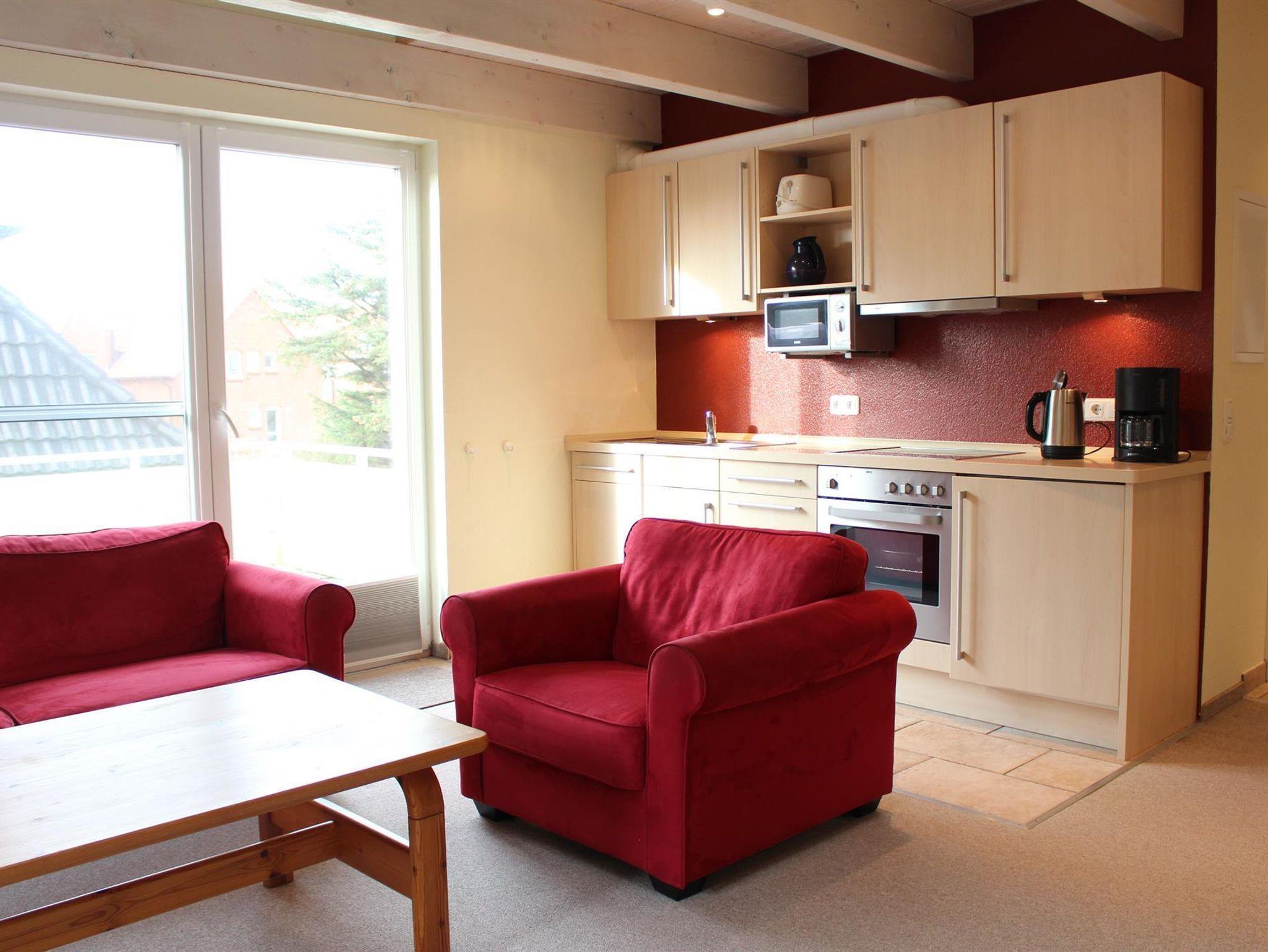 Die Wohnungen selbst bestehen aus einem Wohnzimmer mit einer Küchenzeile, die u. a. mit Kaffemaschine, Toaster, Wasserkocher, Spülmaschine, Backofen, Mikrowelle und einem Cerankochfeld ausgestattet ist. Nebenan befinden sich das Duschbad und ein Schlafzimmer. Über eine Treppe gelangen Sie aus dem Wohnzimmer auf eine Galerie mit einem Doppelbett.