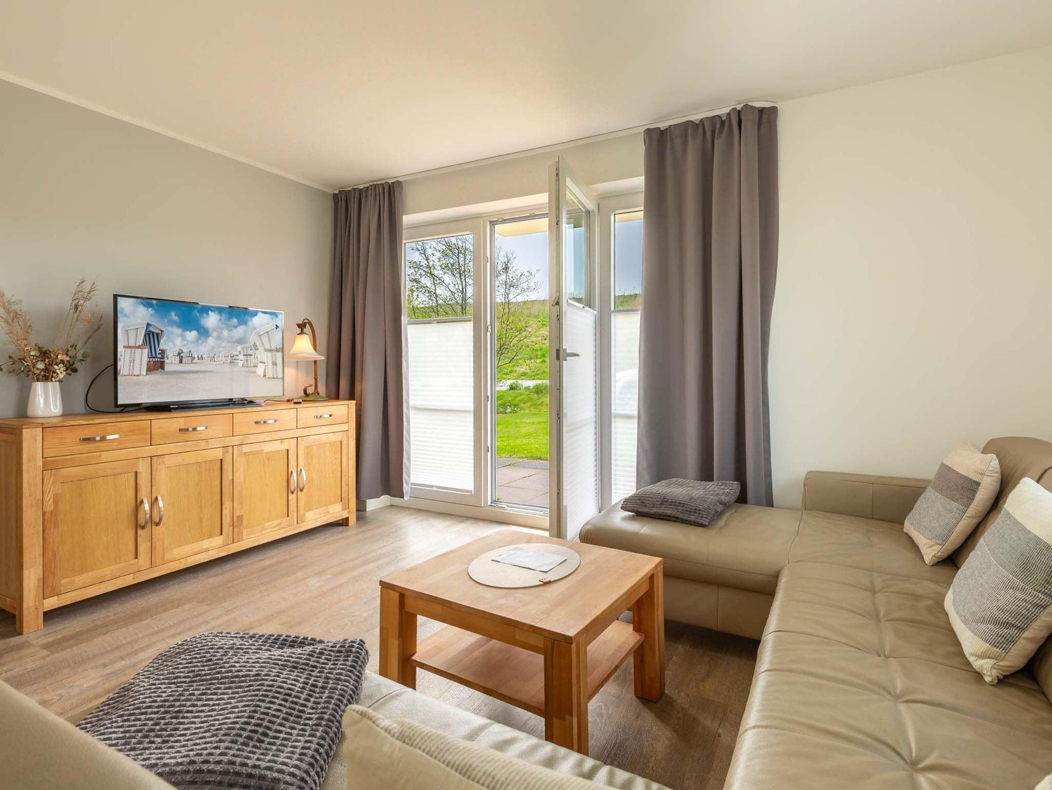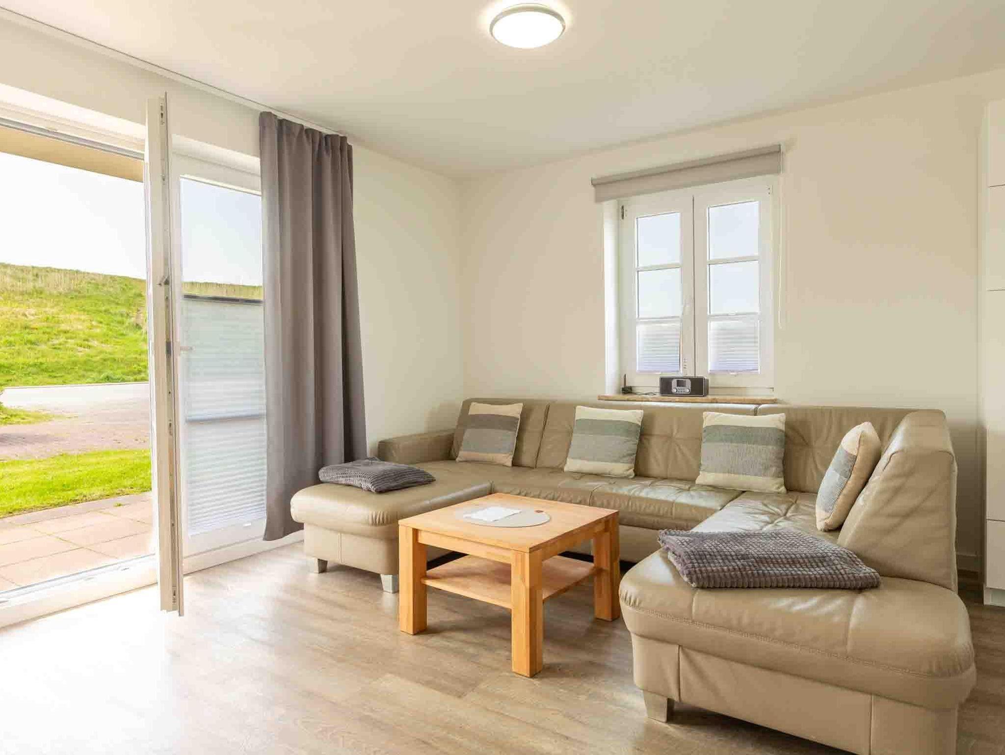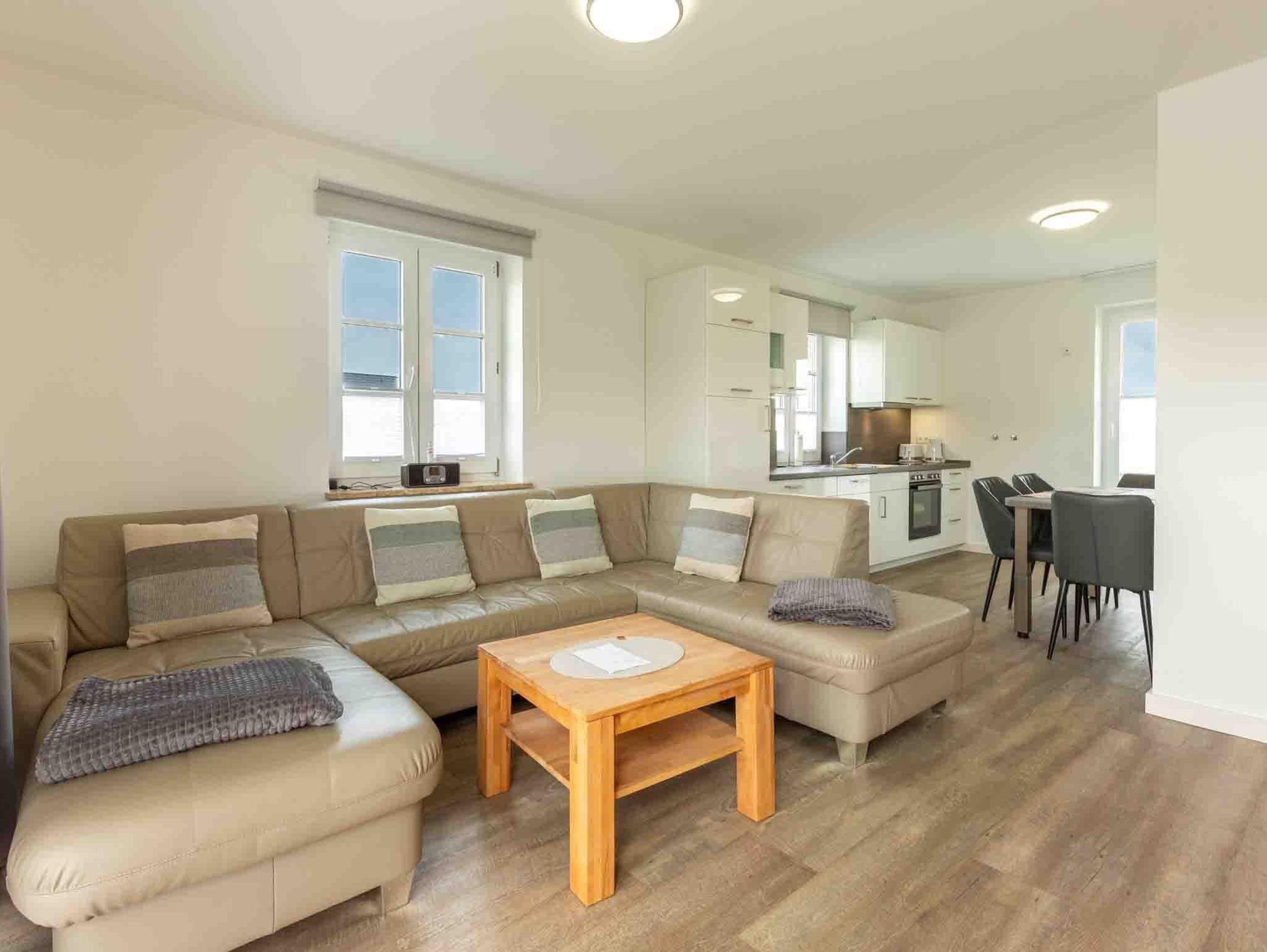 Wohnzimmer mit großer Wohnlandschaft, SMART-TV (Sat) und direktem Zugang zu beiden Terrassen nach Westen und nach Osten. Offene Küche mit Backofen, Mikrowelle, Geschirrspüler, Kühlschrank mit Gefrierfach und Esstisch mit 4 Stühlen.