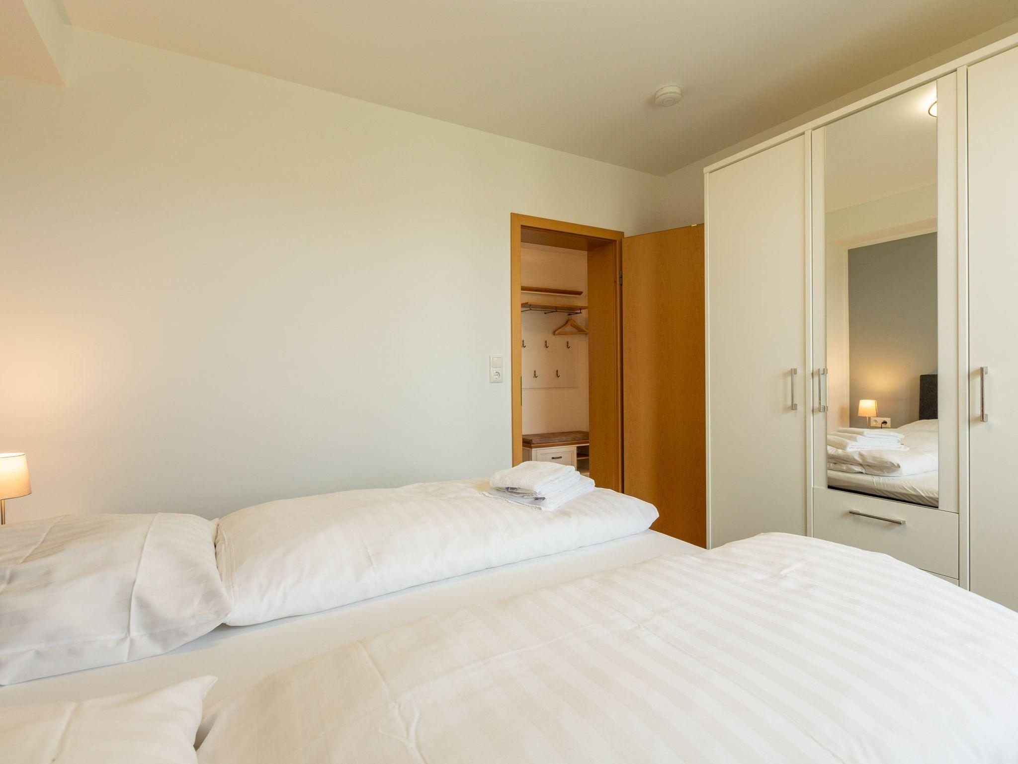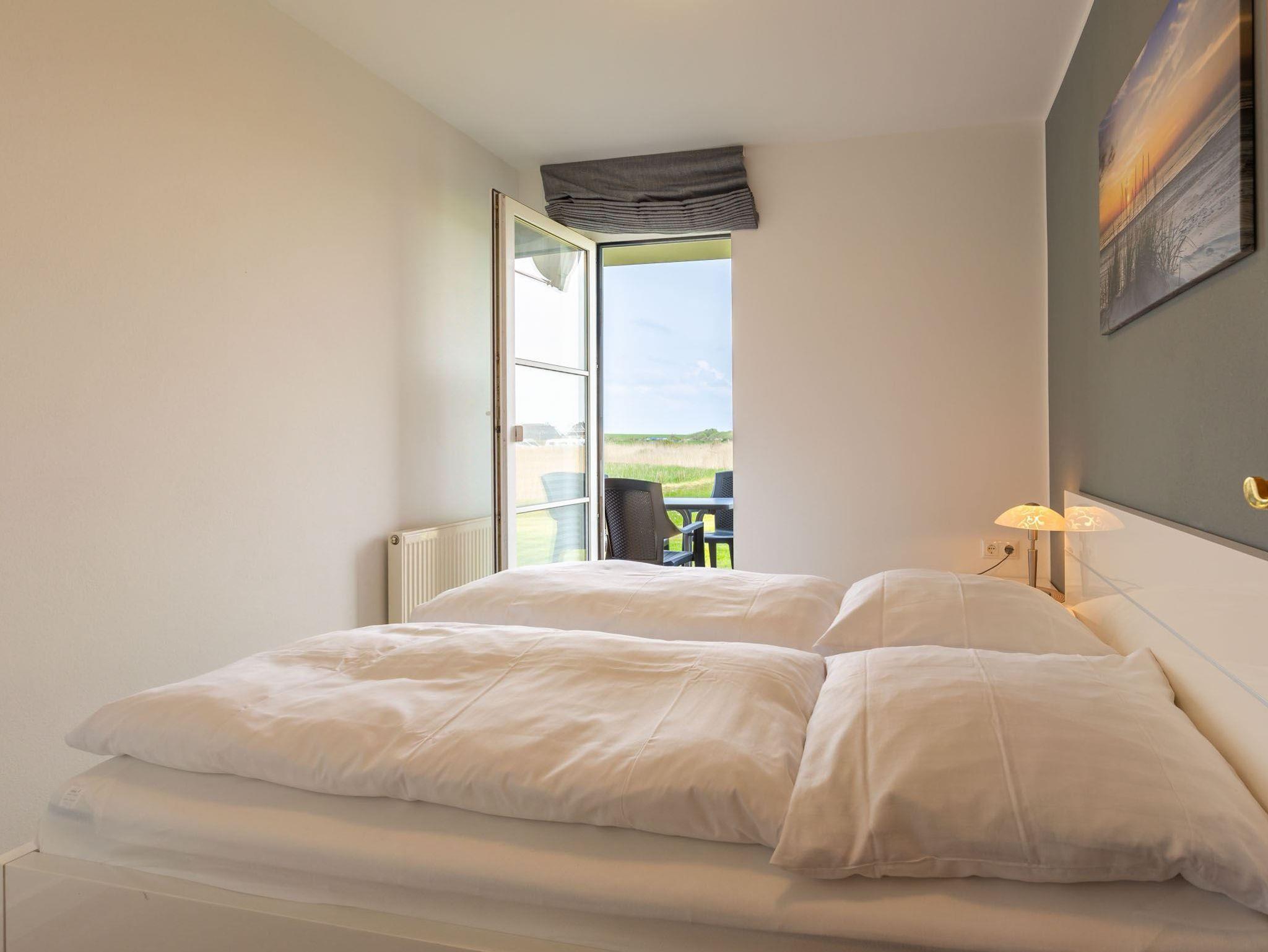 2. Schlafzimmer mit Doppelbett (2x 80x200cm), Kommode, TV (Sat) und Zugang zur Ost-Terrasse.