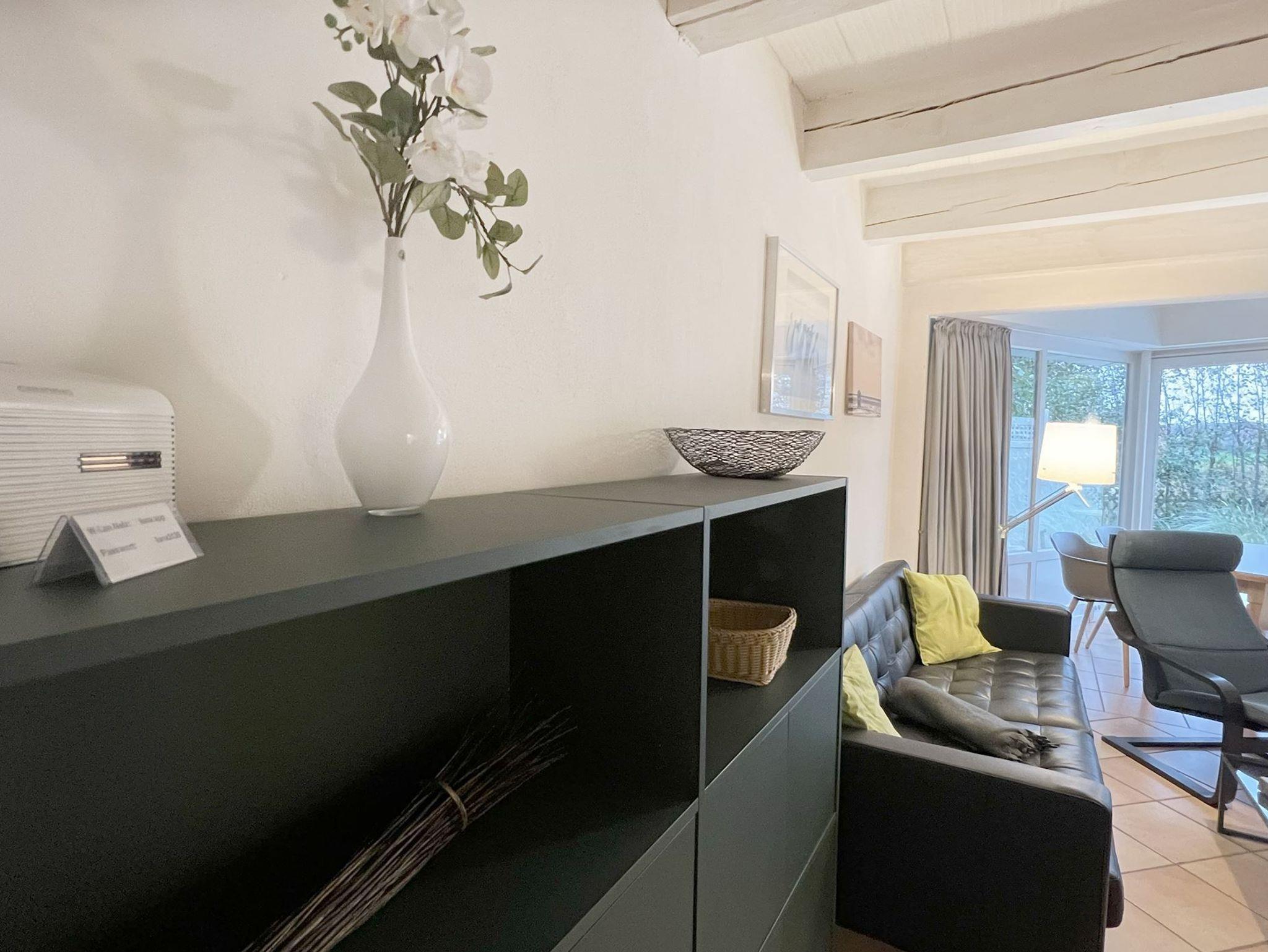 Die ca. 70 qm teilen sich folgendermaßen auf: Im Erdgeschoss befindet sich die Eingangsdiele mit einer gradläufigen Treppe nach oben zu den beiden Schlafzimmern. 1 Schlafraum mit Doppelbett (180x200cm mit getrennten Matratzen), ein Schlafraum mit 2 Einzelbetten (90x200cm). Das Zustellen eines Kinderreisebettes oder Hochstuhles ist kein Problem. Abgehend von der Eingangsdiele der Wohn-Essraum mit voll ausgestatteter Küchenzeile, gemütlicher Sitzecke und Essecke im raumhoch verglasten Wintergarten, direkter Zugang zur mit einer kleinen Sanddüne eingefassten Terrasse und Garten. Das Duschbad ist ausgestattet mit Dusche, WC, Waschtisch und Außenfenster.