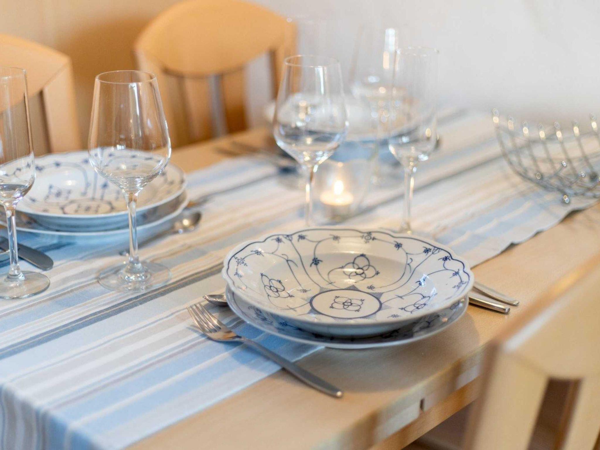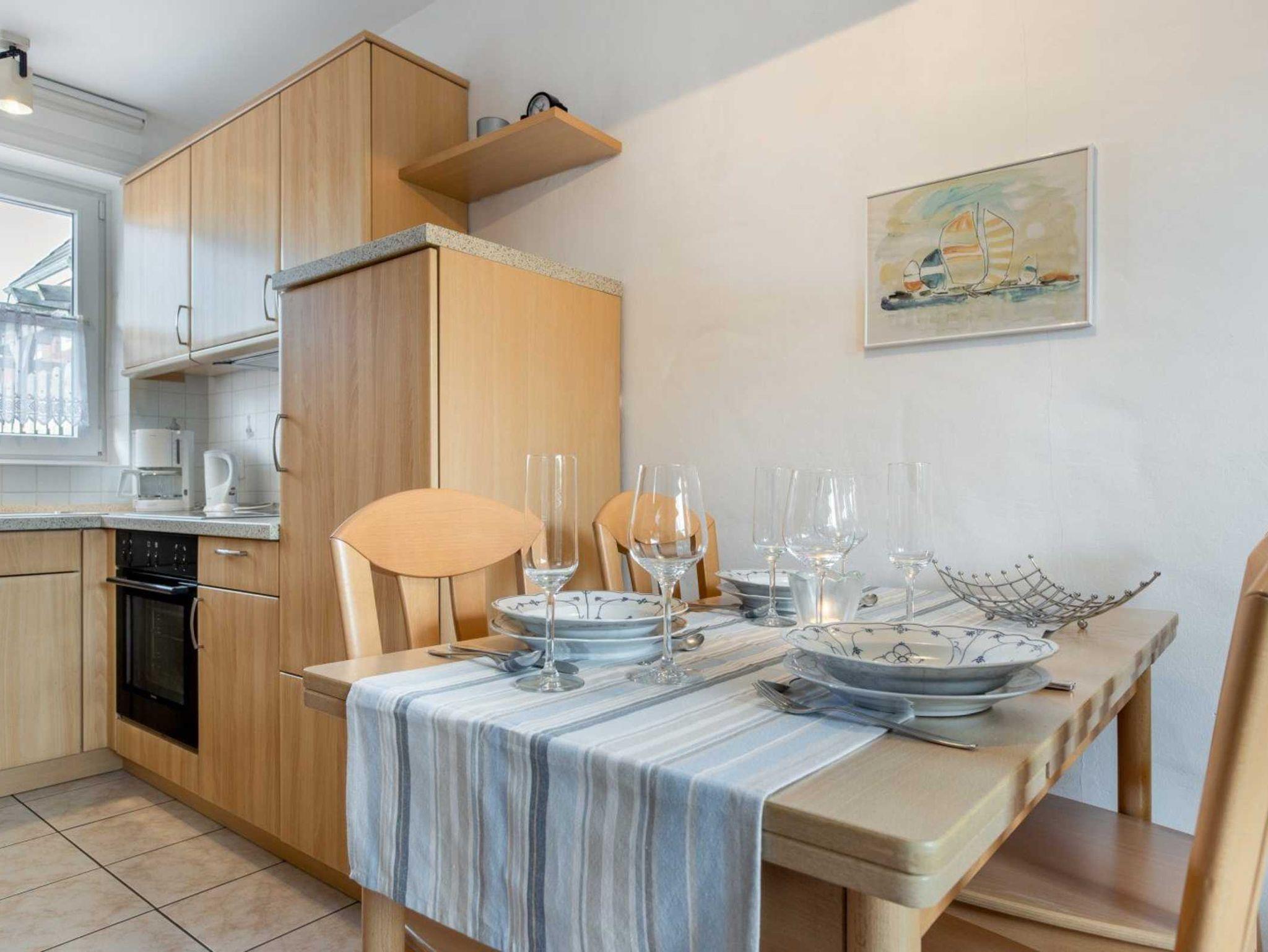 Wohnzimmer mit Sofa (2er), 2 Korbsesseln, Kaminofen, TV (Sat), DVD-Player, Stereo-Kompaktanlage und Esstisch mit 4 Stühlen. Direkter Zugang zur windgeschützten, möblierten Terrasse nach Osten. Offene Küche mit Backofen, Kühlschrank mit Gefrierfach und Geschirrspüler. Keine Mikrowelle. Abstellraum mit Staubsauger und Bügelset.