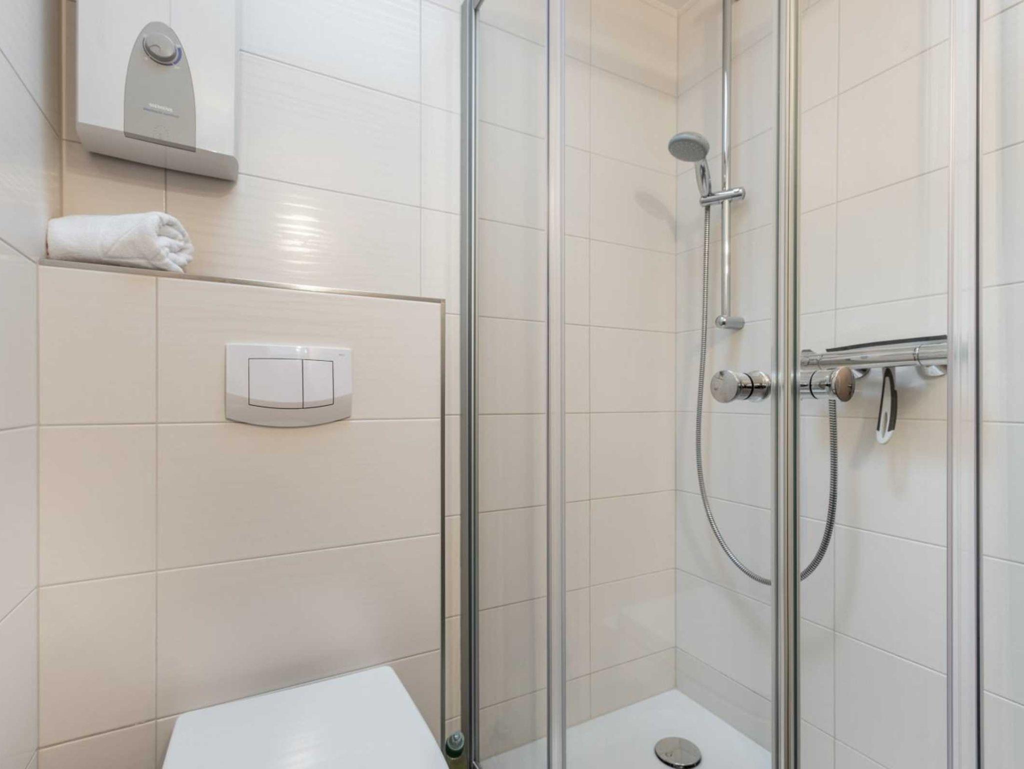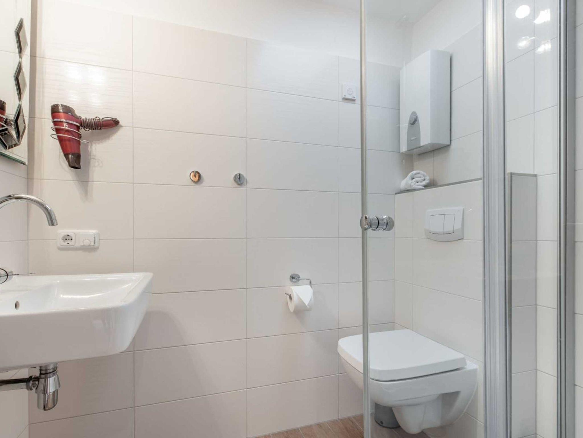 Badezimmer (Duschbad) mit Dusche, WC, Handtuchwärmer, Föhn und Tageslicht.
