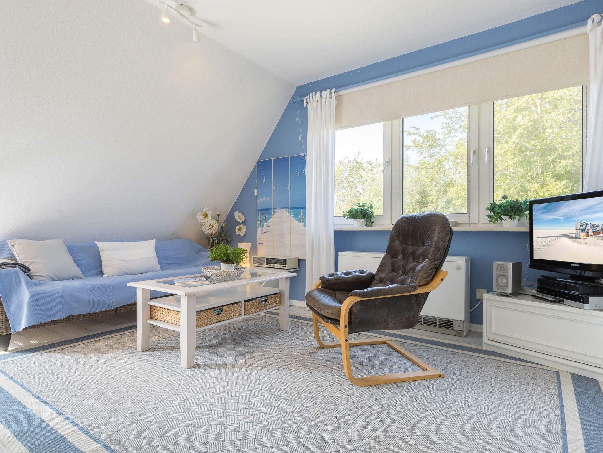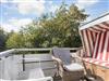 • Wohnzimmer mit Sofa für 2-3 Personen, 2 Sesseln, Esstisch mit 4 Stühlen, TV (Kabel), DVD-Player und Stereo-Kompaktanlage. Direkter Zugang zum möblierten Balkon mit Strandkorb nach Südwesten.