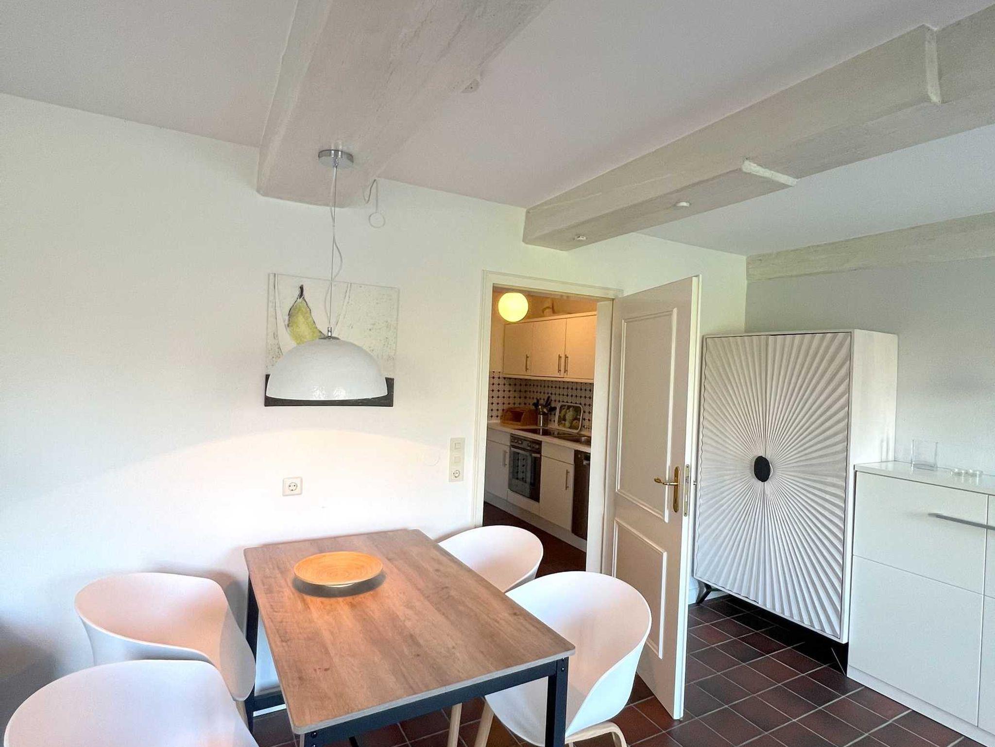Genießen Sie Ihren Urlaub in unserer gemütlichen und komfortablen Bauernhauswohnung für bis zu 3 Personen. Es erwartet Sie original friesisches Ambiente unter einem Reetdach. Das über 100 Jahre alte Bauernhaus liegt eingebettet in viel Grün. Auf der zur Wohnung gehörenden Terrasse, ausgestattet mit Strandkorb und Gartenmöbeln, können Sie wunderbar entspannen und die Seele baumeln lassen. Die Westlage mit Blick auf die große Obstwiese lädt dazu ein. Im Eingangsbereich finden Sie eine Diele mit Garderobe vor. Weiter geht es durch die voll ausgestattete Küche in den lichtdurfluteten Wohn- und Essbereich. Hier finden Sie ein zusätzliches Schrankbett, so dass die dritte Person genügend Platz hat. Moderne friesische Behaglichkeit findet sich in der geschmackvollen Einrichtung und mit viel Liebe zum Detail wieder. Einen guten Schlaf bietet Ihnen das Doppelbett im separaten Schlafzimmer. Das geräumige Duschbad verfügt über eine bodengleiche Dusche. Freuen Sie sich auf wundervolle und ruhige Urlaubstage bei uns.