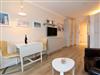 Das Wohn-/Schlafzimmer verfügt über eine Leseecke mit zwei Ledersesseln, einem Esstisch und einem großen Fernseher mit Mediathek. Die kleine Küchenzeile ist hochwertig und vollständig ausgestattetet u.a. mit Geschirrspüler, Kühlschrank inkl. 4-Sterne-Gefrierfach, Kombi-Mikrowelle mit Grillfunktion und Ceran-Kochfeld.
