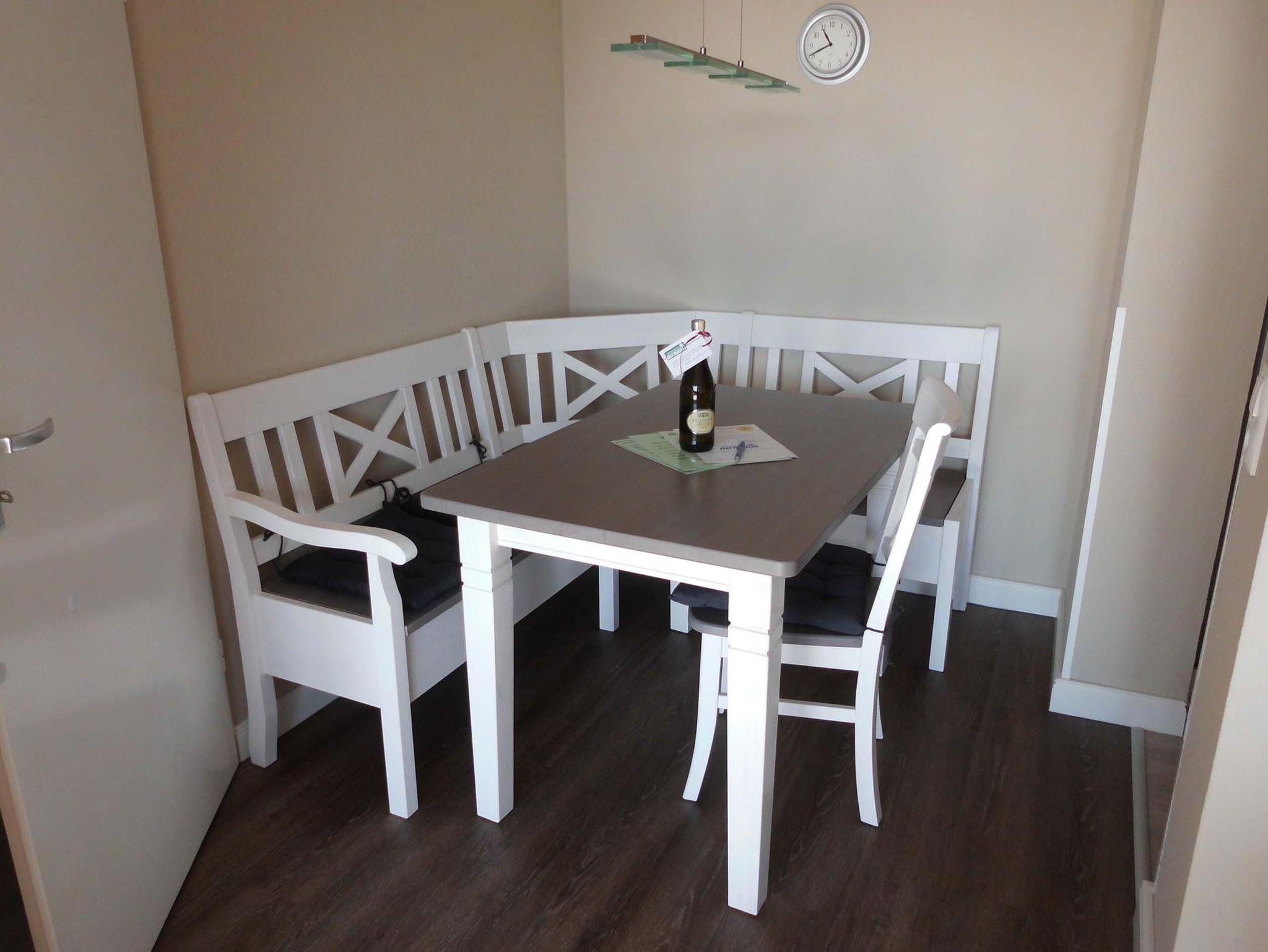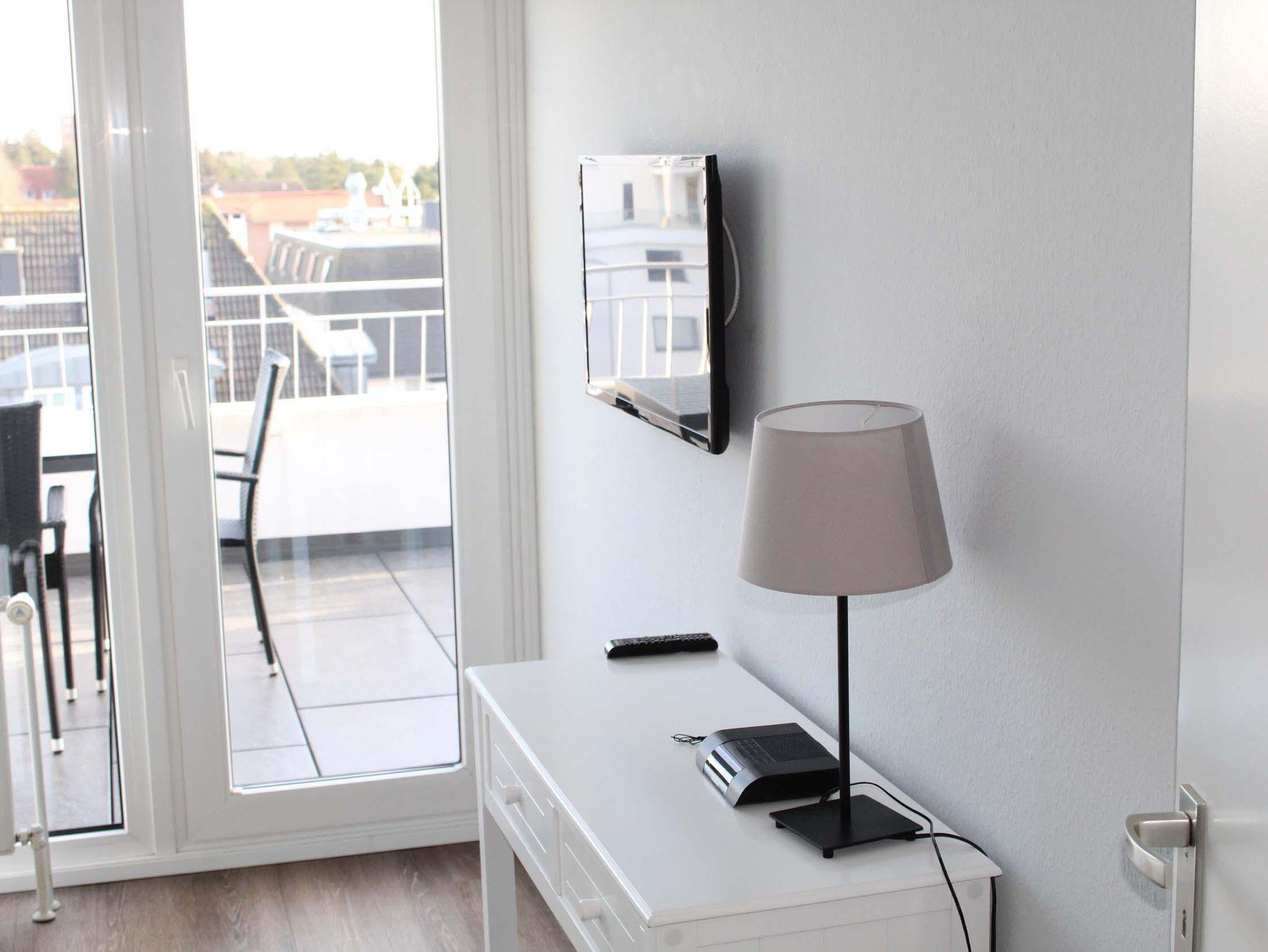 App.Nr. 66, Typ 6, IV.OG., Süd-Ostlage Schlafraum mit 2 Einzelbetten, 1 Schlafraum mit 1 Einzelbett und mit 2. Fernseher, Wohn-Schlafraum mit 2 Wandschrankbetten, PVC-Fußboden, Sitzecke, Essecke, Küchenzeile mit Geschirrspüler, Mikrowelle und Backofen, Dusche/WC, Durchwahltelefon, Kabel-TV, Balkon, Garagenstellplatz 66, Aufzug und Fahrradkeller. Rezeption, Brötchenservice, Schwimmbad, Sauna kostenpflichtig, kostenfreier Internetzugang (LAN-Germania). Bettwäsche wird einmalig bei Einzug gestellt. Handtücher können gegen Gebühr entliehen werden. NICHTRAUCHERWOHNUNG
