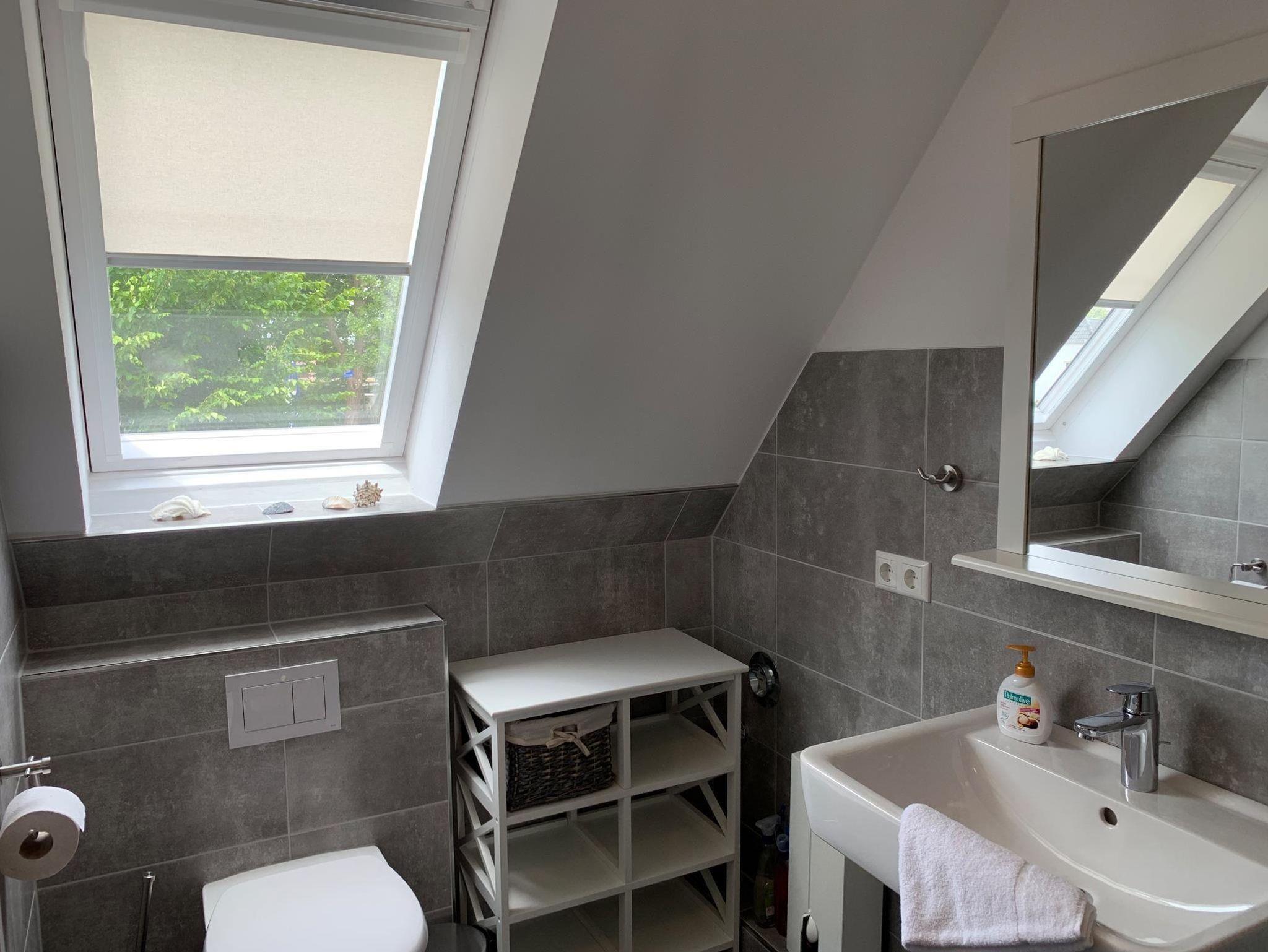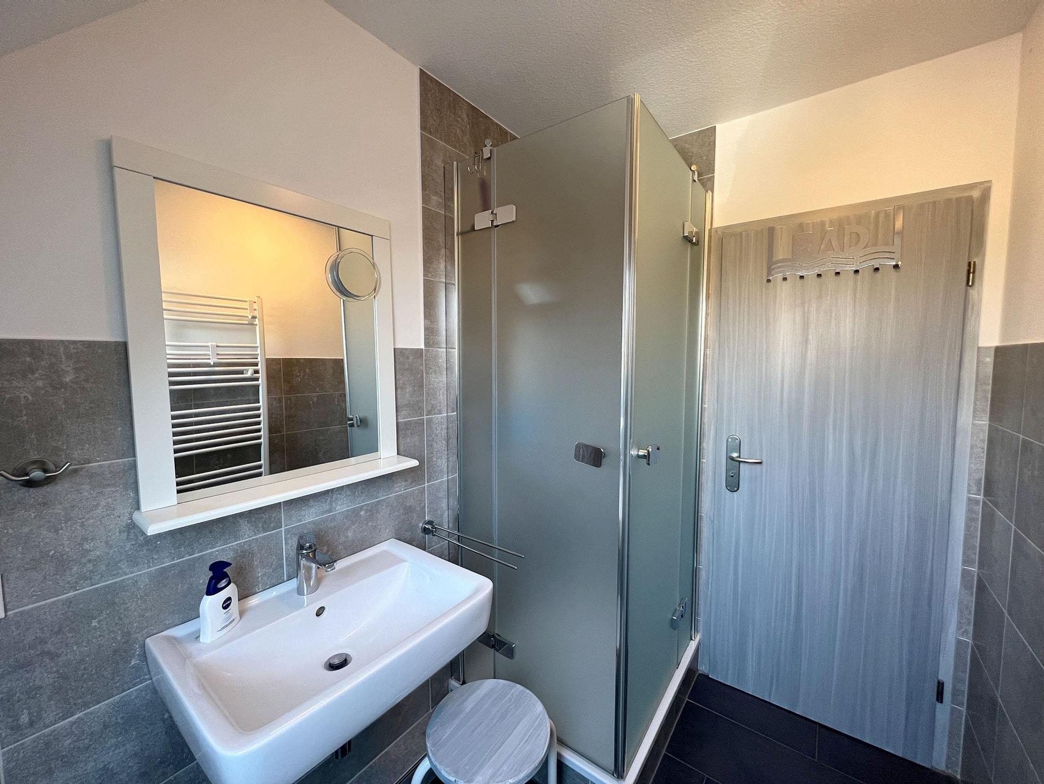Bad: Dusche, Waschbecken, WC, Duschkabine, Hocker, Spiegel, Regal, Fön