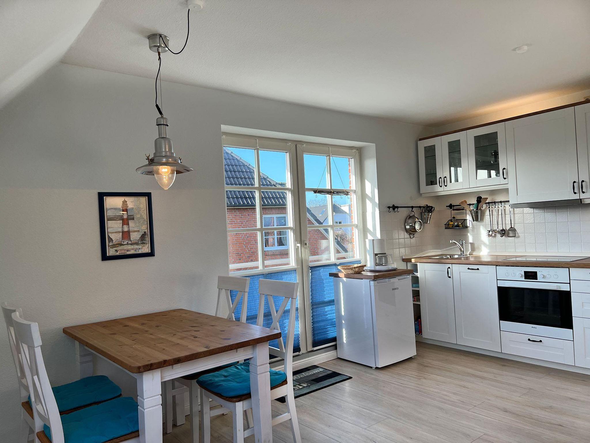 In dieser gut ausgestatteten 3-Zimmer-Ferienwohnung mit einer Größe von 58 qm für 2-3 Personen machen Sie schöne Ferien. Die Nichtraucher-Wohnung besitzt im 1. OG und DG 2 Schlafzimmer mit insgesamt 3 Schlafplätzen. Auf dem Süd-Westbalkon können Sie die gute Nordseeluft geniessen. Die kleine Küche ist mit einem Cerankochfeld, Heißluftbackofen, Dunstabzugshaube, Spülmaschine und einem Kühlschrank mit Gefrierfach ausgestattet. Dazu gibt es elektrische Kleingeräte wie Pürrierstab, Toaster, Kaffeemaschine etc.