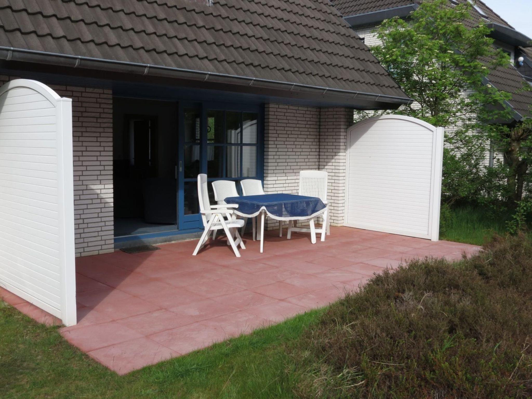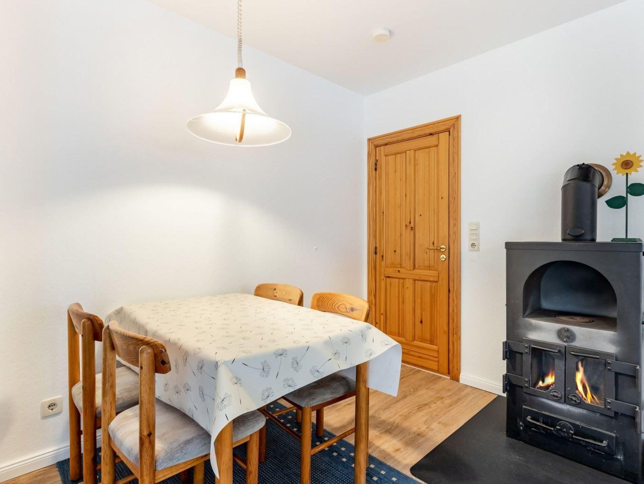 Wohnzimmer mit 1 Sofa und 2 Sesseln, TV (Kabel), Radio mit CD-Player, behaglichem Kaminofen und Esstisch mit 4 Stühlen. Direkter Zugang zur möblierten und windgeschützten Gartenterrasse nach Süden mit Strandkorb.