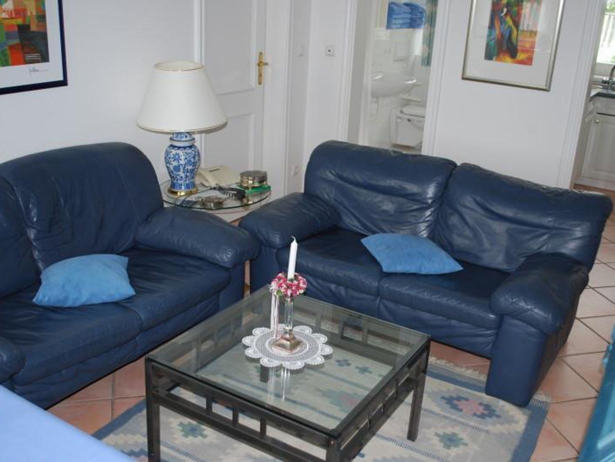 Die Wohnung Oland ist sehr stilvoll und hochwertig mit blauen Ledersofas, blau lasierten Stilmöbeln und viel Liebe für das Detail eingerichtet.