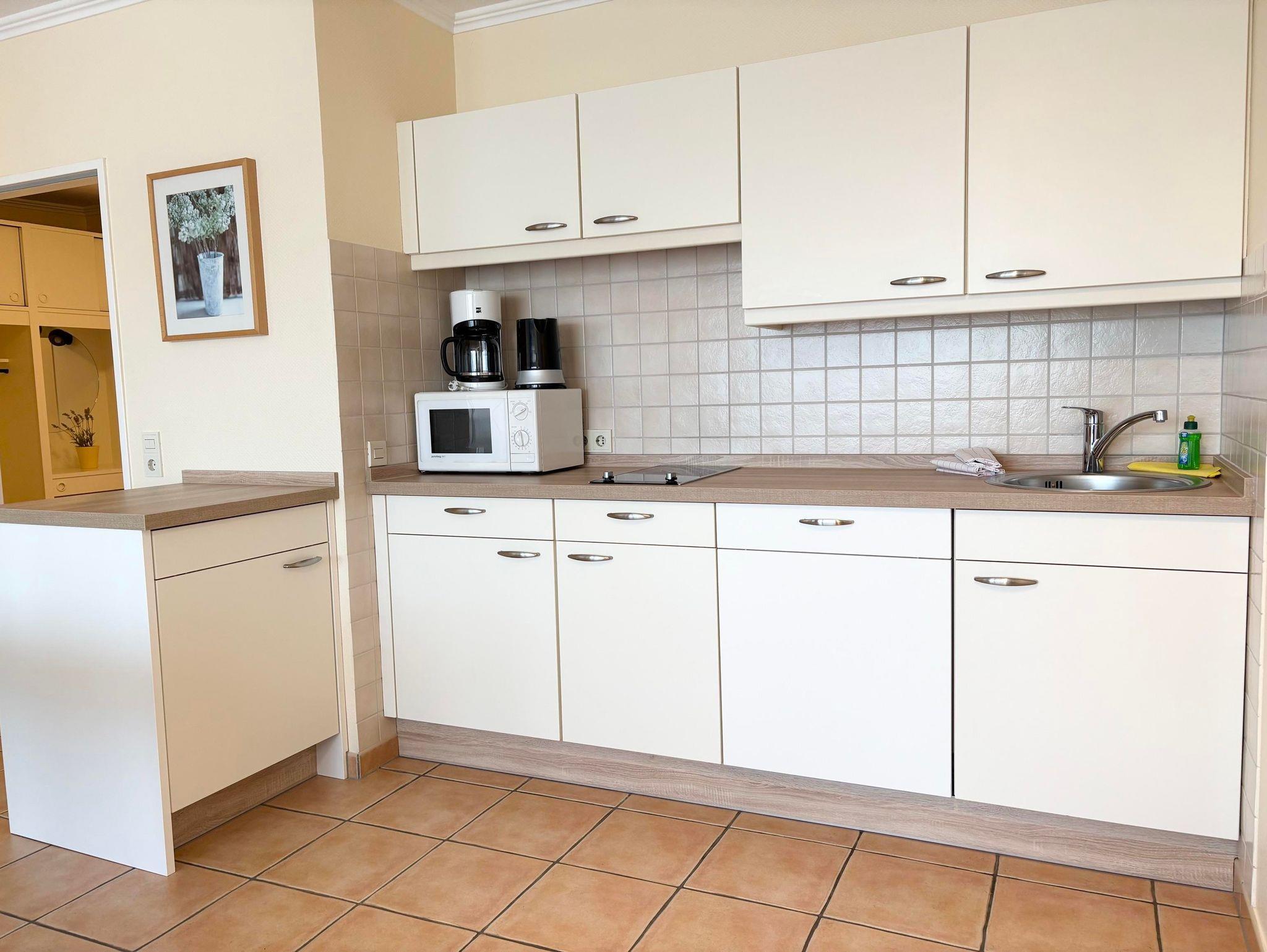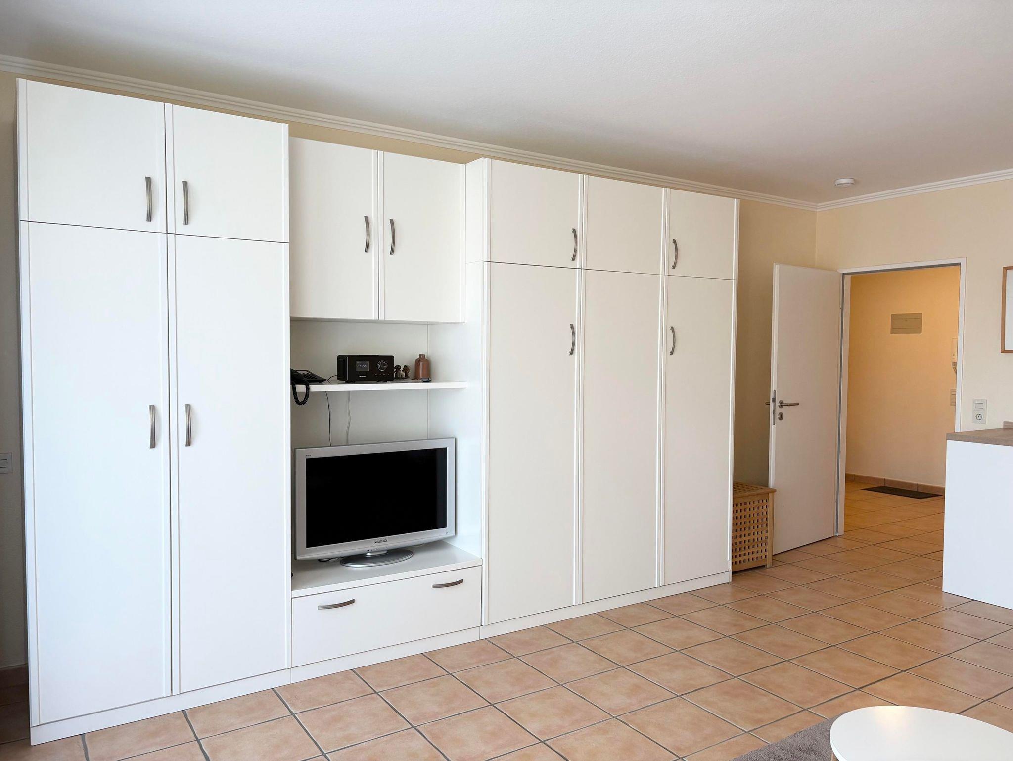 Schlafraum mit 2 Einzelbetten, Wohn-Schlafraum mit 2 Wandschrankbetten, Fußboden gefliest, Sitzecke, Essecke, Küchenzeile mit Mikrowelle, Dusche/WC, Durchwahltelefon, Kabel-TV, Balkon, PKW-Platz Nr. 44, Aufzug und Fahrradkeller.