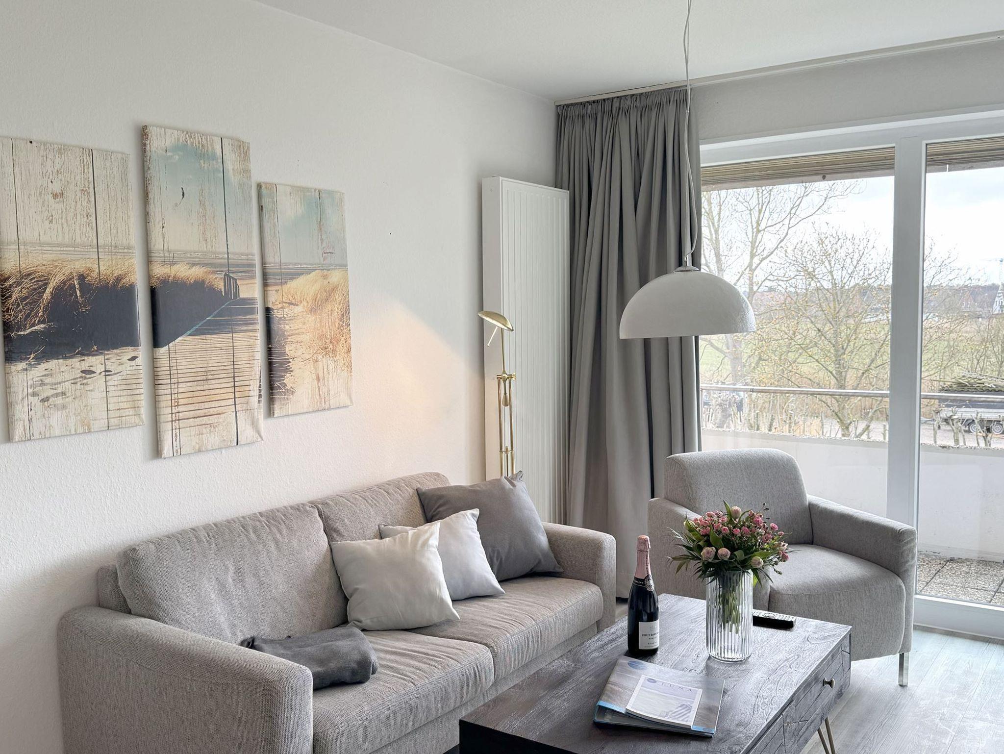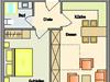 Die ca. 55 qm teilen sich folgendermaßen auf:Eingangsbereich mit Garderobe, offener Wohnraum mit Essbereich und integrierter Einbauküche,Einzelschrankbett (90x200cm,Matratze), direkter Zugang zur Loggia , Schlafzimmer mit Doppelbett (180x200cm,getrennte Matratzen), 1 Duschbad mit WC und Waschbecken.