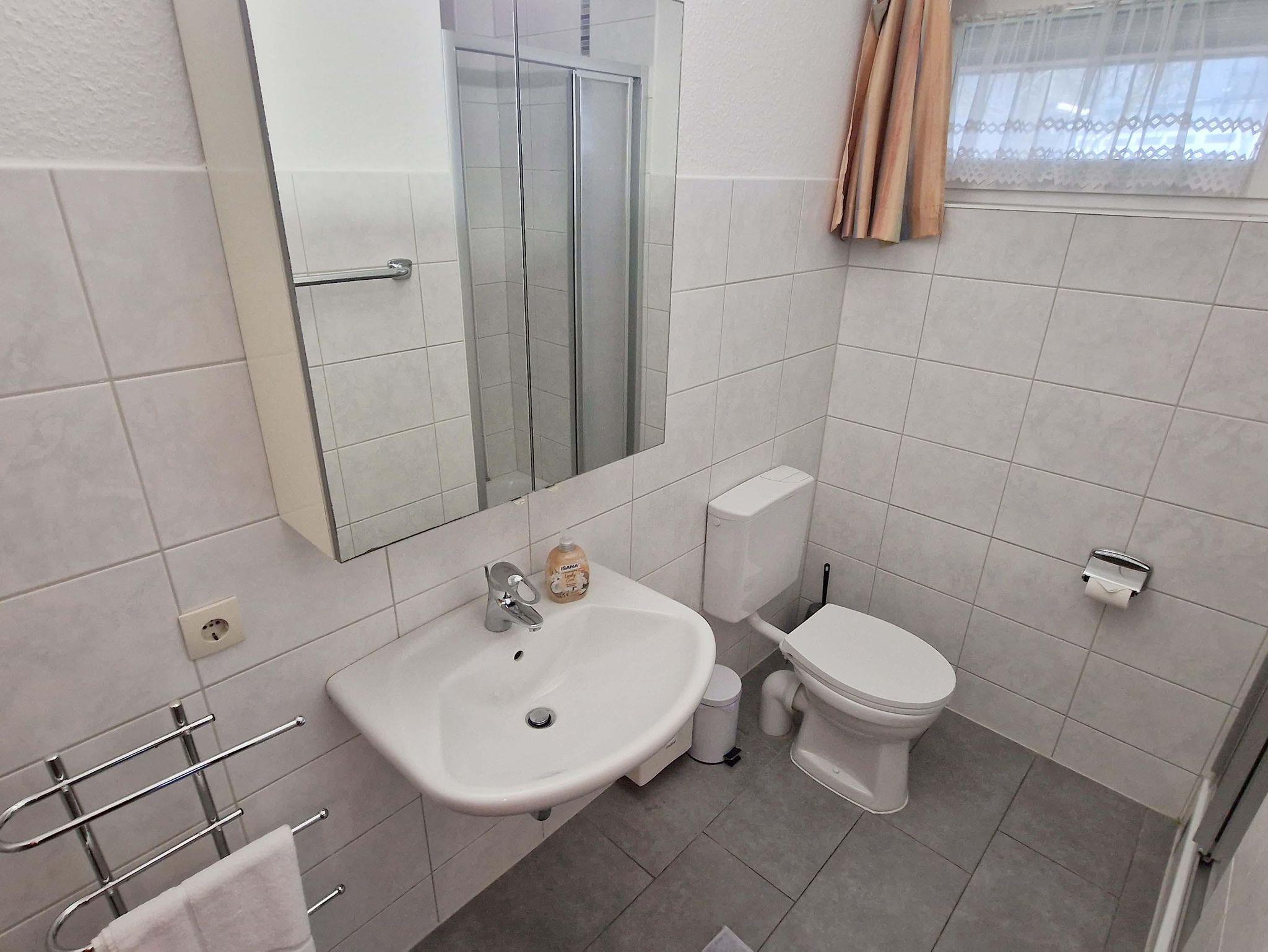 Bad: Dusche, Waschbecken, WC, Duschkabine, Spiegelschrank, Handtuchständer, Hocker
