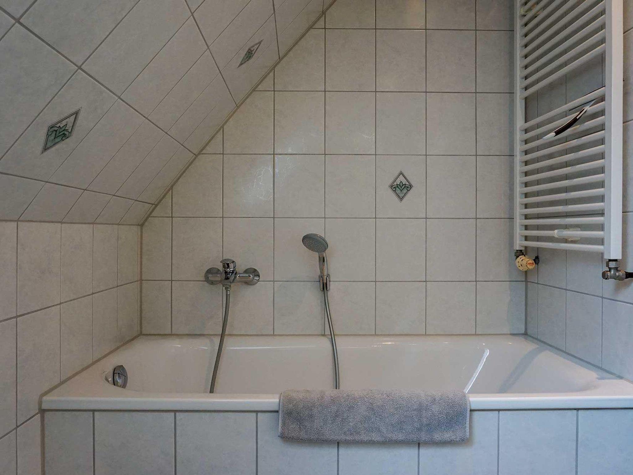 geräumiges Badezimmer mit Dusche, Badewanne, WC, Waschbecken und Handtuchwärmer