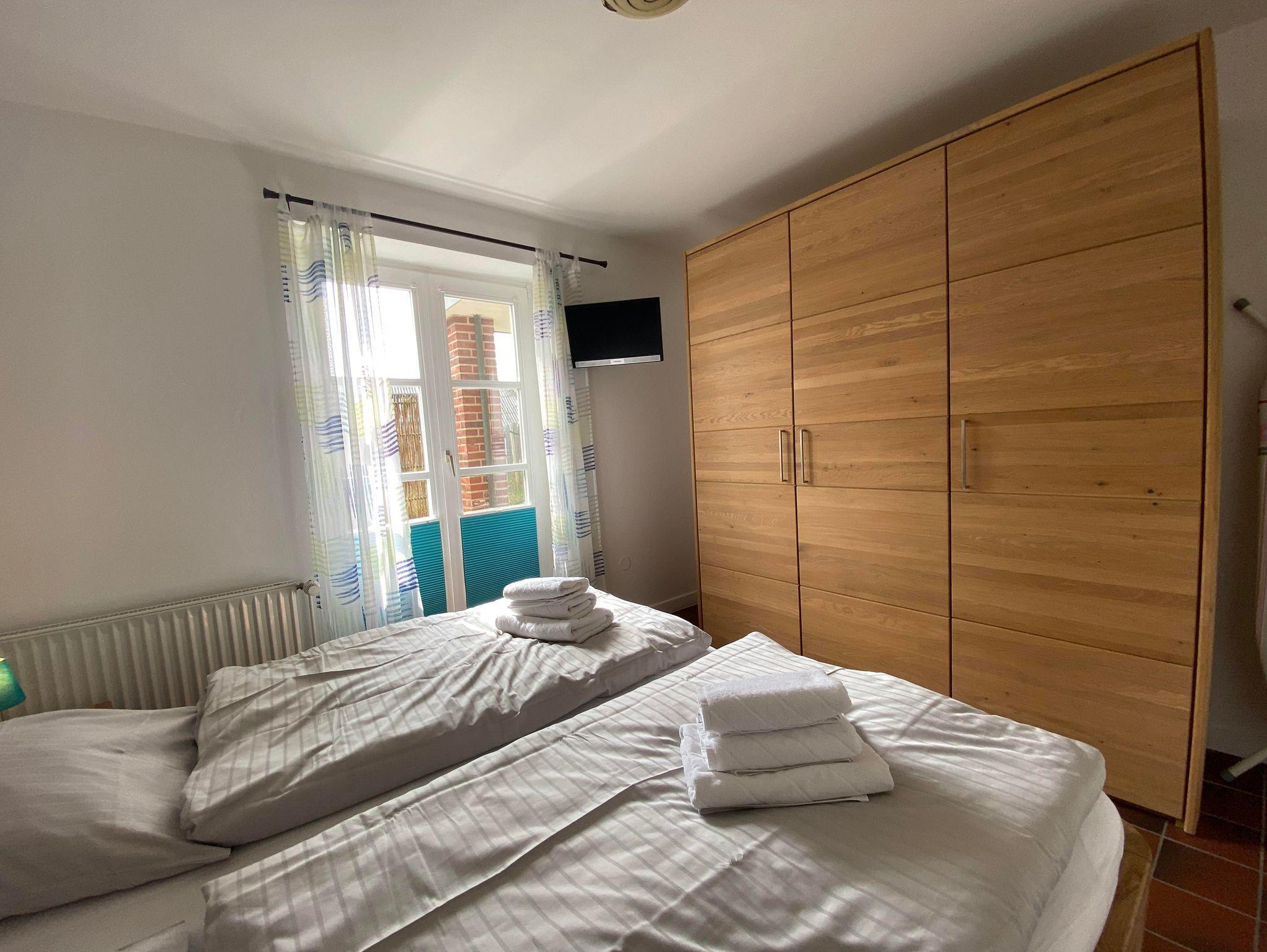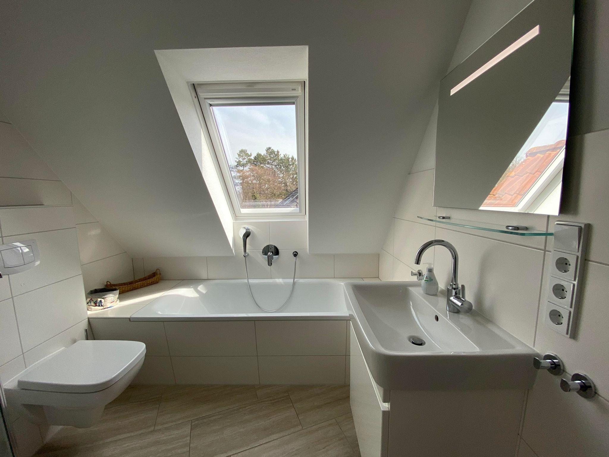 Obergeschoss: Wohnraum mit Zugang zum Balkon, ein Schlafzimmer mit Doppelbett (160 x 200 cm), ein Wannenbad / WC mit separater Dusche, sowie Waschmaschine und Trockner