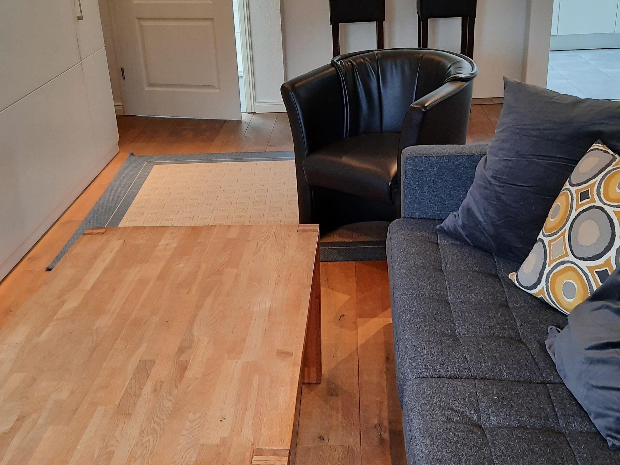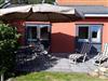 Die kleine, hübsche Terrasse mit Friesenwall ist direkt vor dem Wohnzimmer, im nach Süden liegenden Garten.