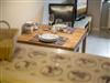 Wohnzimmer mit Sofa (2 Personen), Esstisch mit 2 Stühlen, TV (Sat), DVD-Player und Stereo-Anlage.