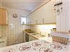 Separate Küche mit Backofen, Geschirrspüler, Kühlschrank mit Gefrierfach und praktischer Durchreiche zum Wohnzimmer.