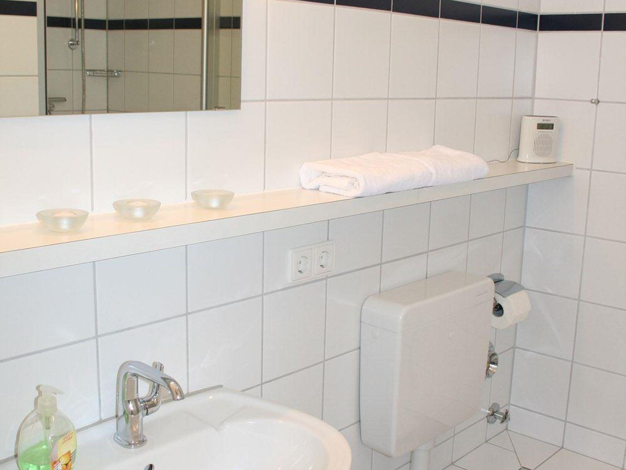 Bad: Dusche, Duschkabine, Waschbecken, WC, Konsole, Föhn, Bad-Radio, Elektro-Nachtspeicherheizung