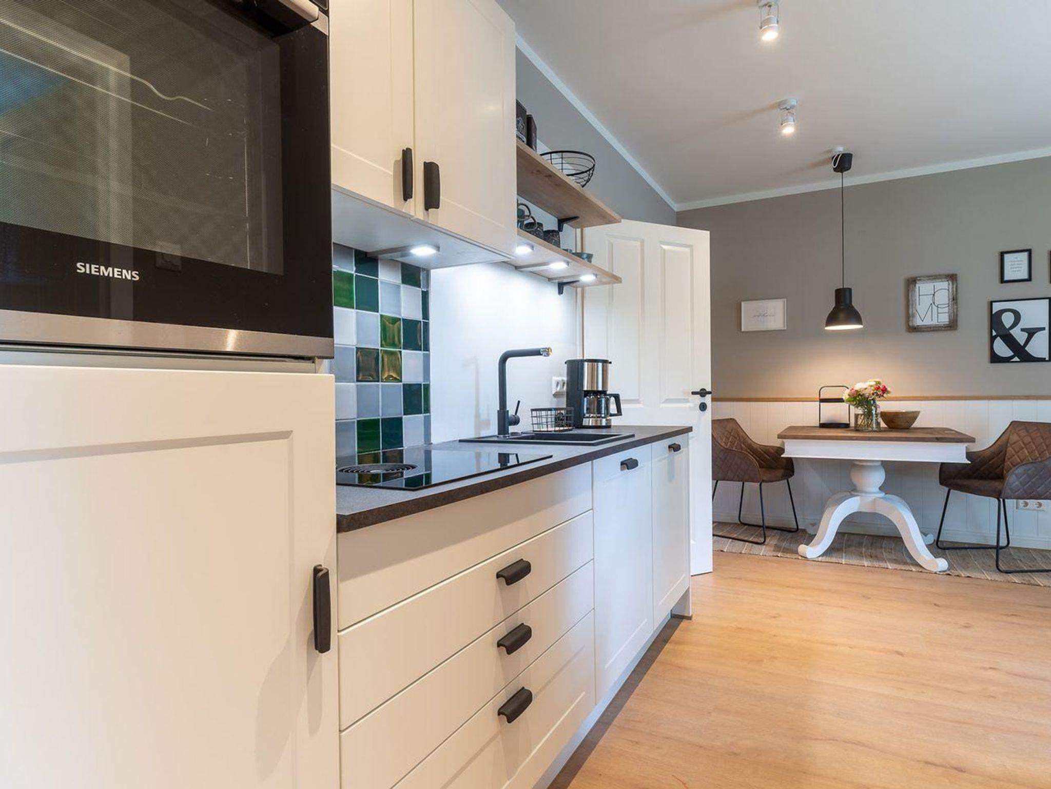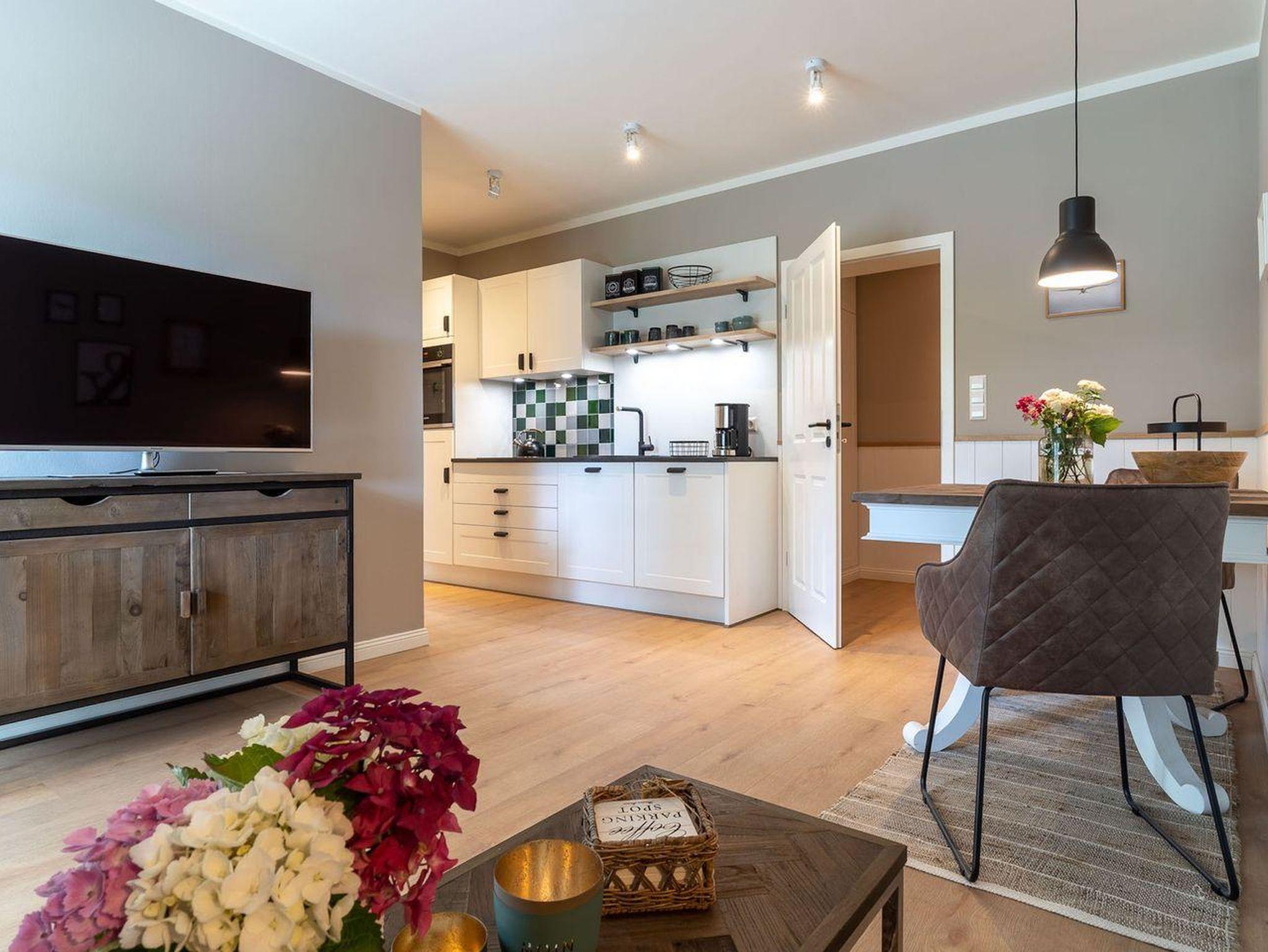 Der lichtdurchflutete Wohnraum mit einer offenen Wohnküche und einem gemütlichen Essbereich bietet jeden Komfort. Die Küche ist voll ausgestattet und verfügt über hochwertige Elektrogeräte.