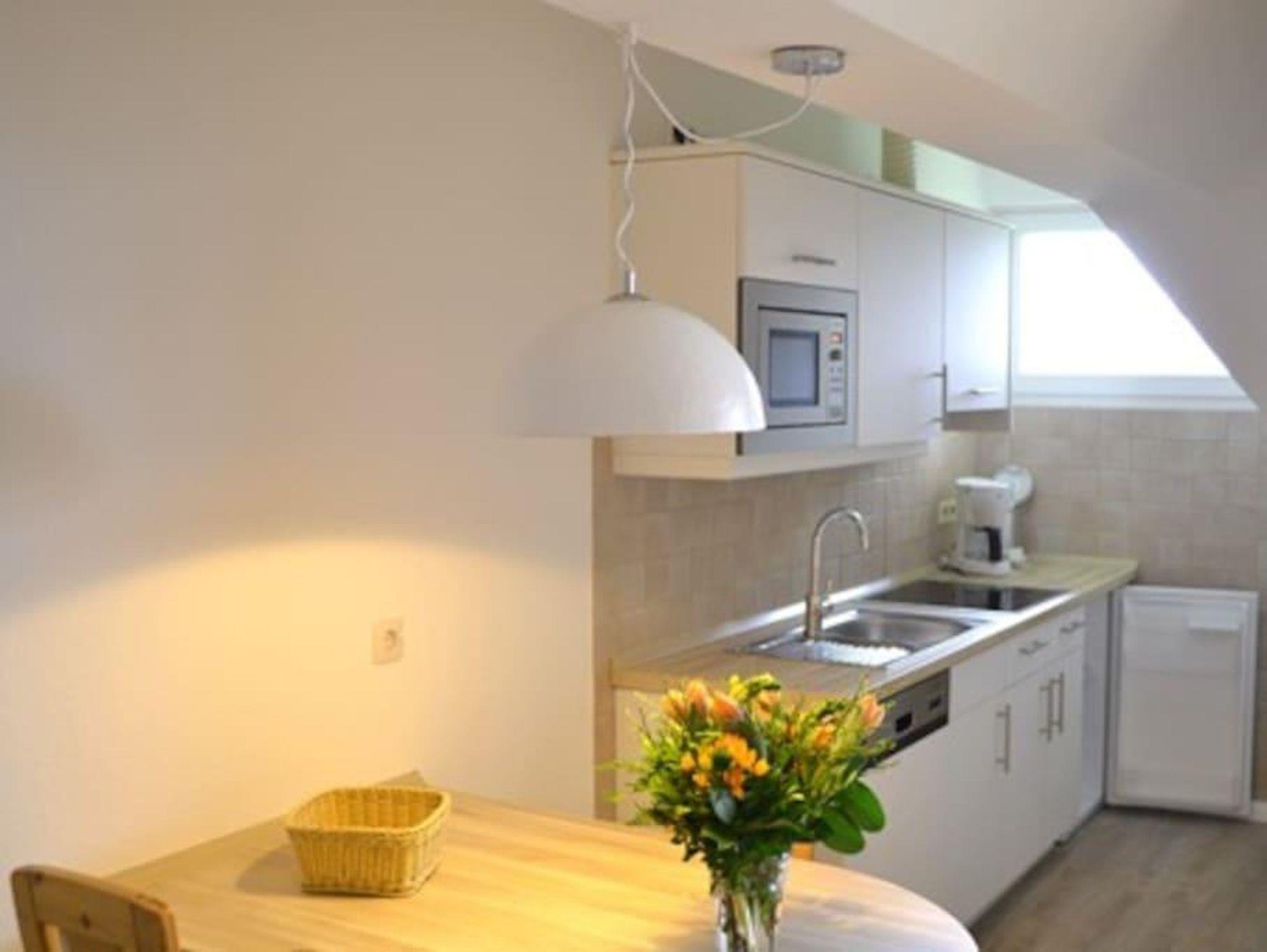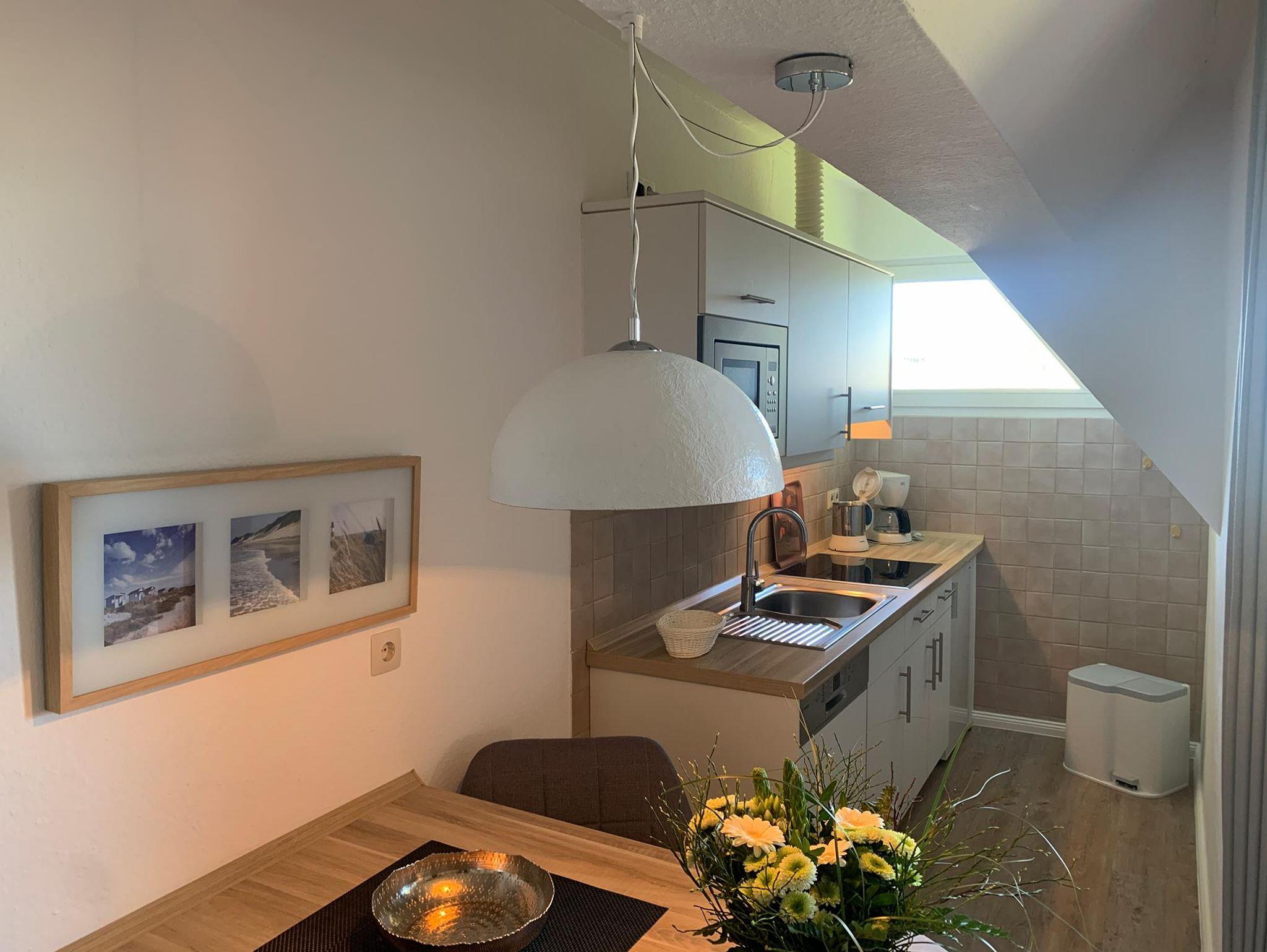 • komplett eingerichtete Küche mit Ceranfeld, Mikrowelle, Geschirrspüler, Kühlschrank mit Gefrierfach, Wasserkocher, Kaffeemaschine (Filter), Toaster.