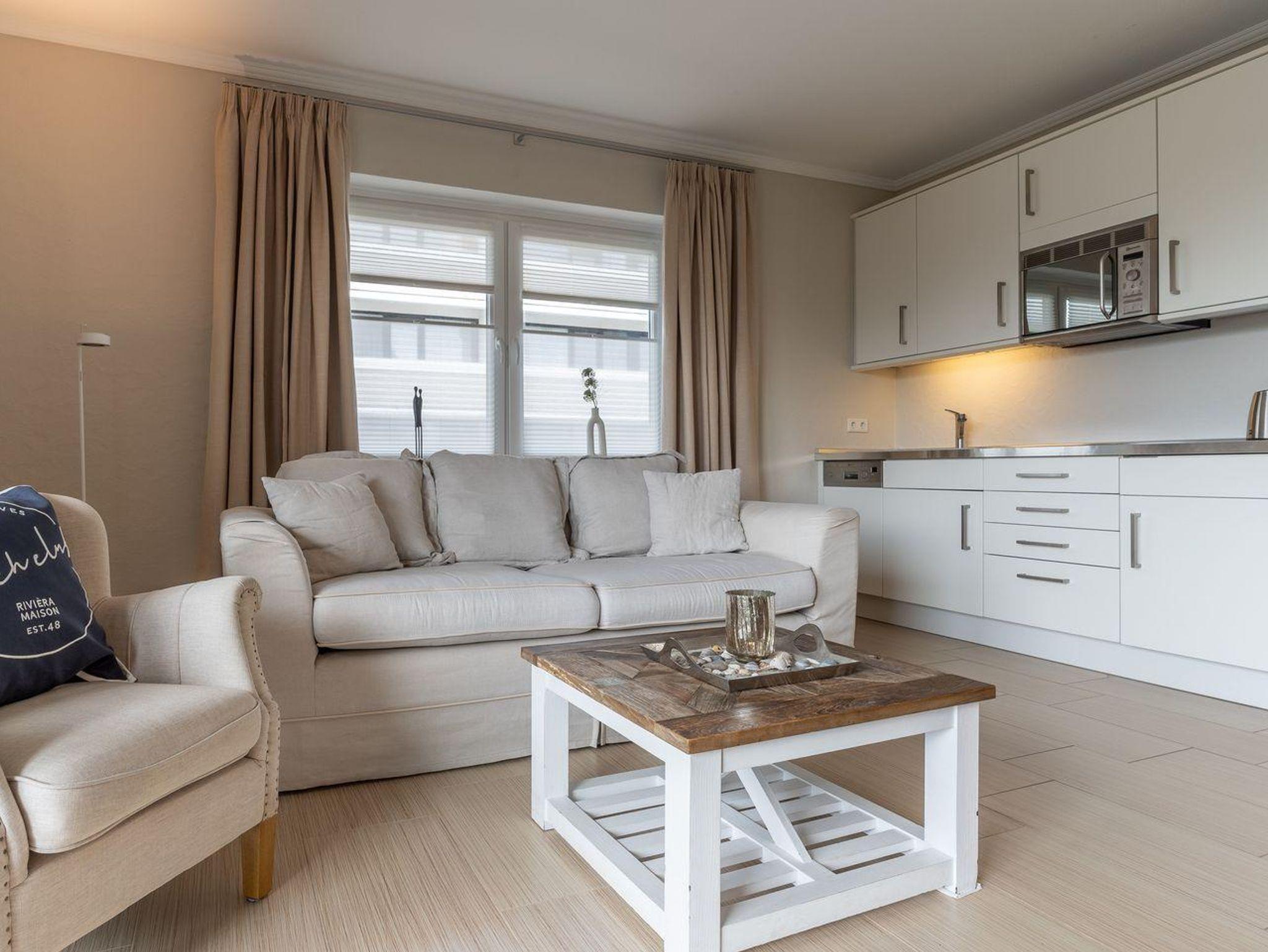 Die gesamte Wohnung ist mit sehr exclusiven Möbeln von Riviera Maison eingerichtet. Ein gemütliches Wohnzimmer mit offener Wohnküche und großzügigen Esstisch laden zum Chillen ein.