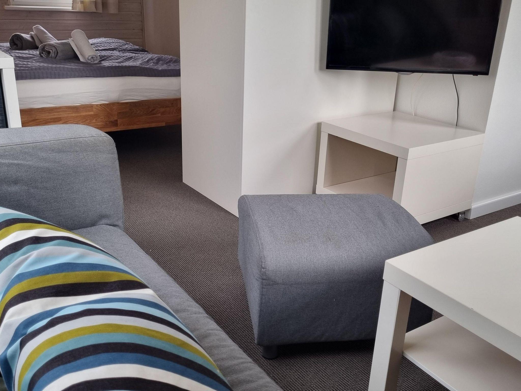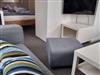 Der Wohnbereich lädt mit einer modernen Couch zum Entspannen ein. Im Schlafbereich mit Doppelbett 2 x 90 x 200 cm finden Dank des fehlenden Fußteils auch Großgewachsene viel Fußfreiheit.