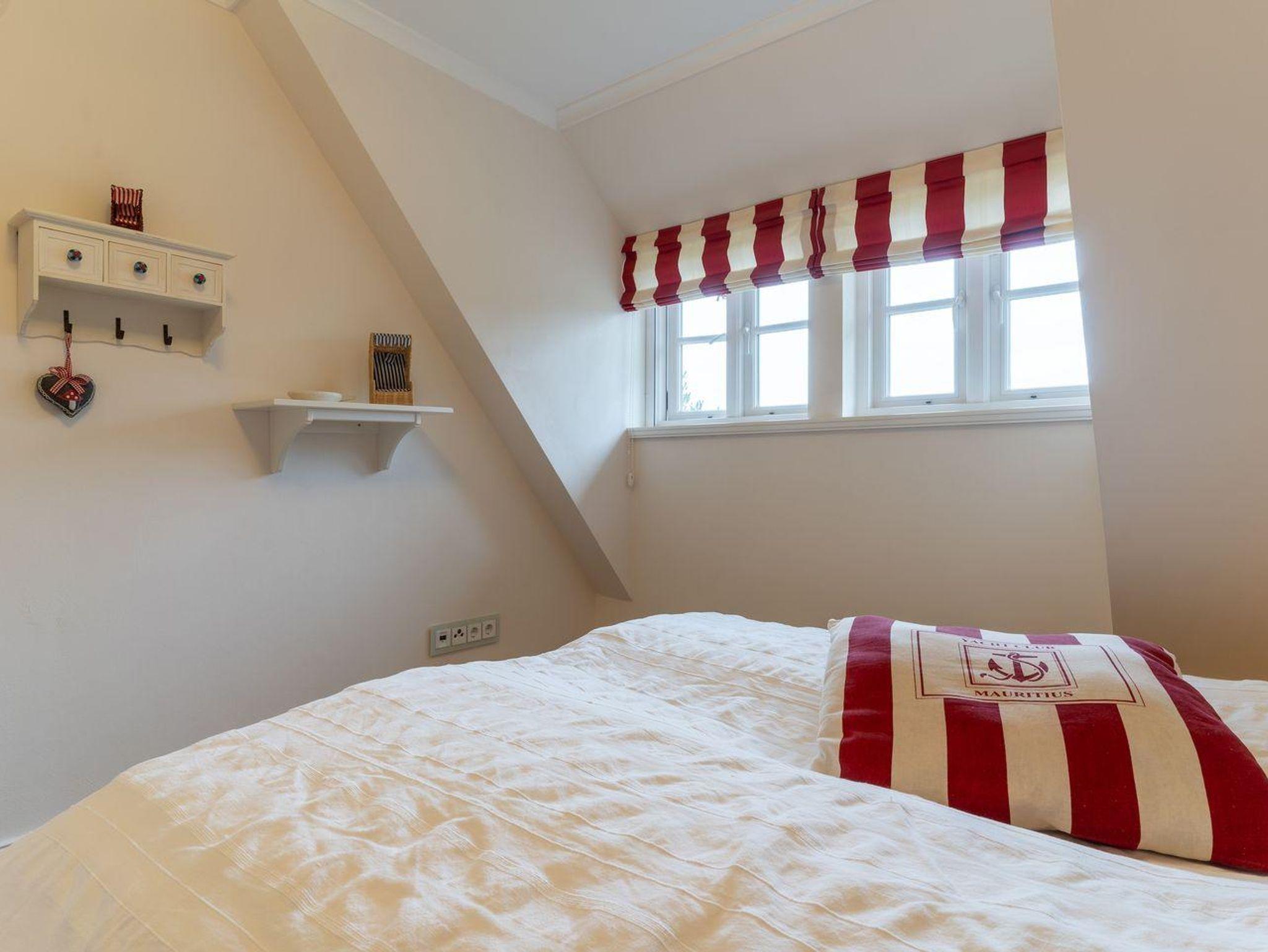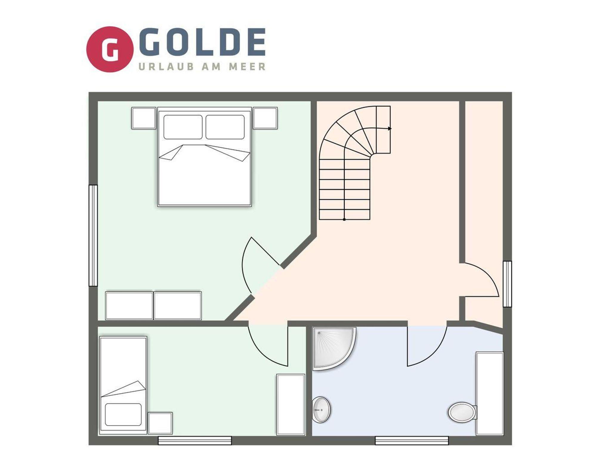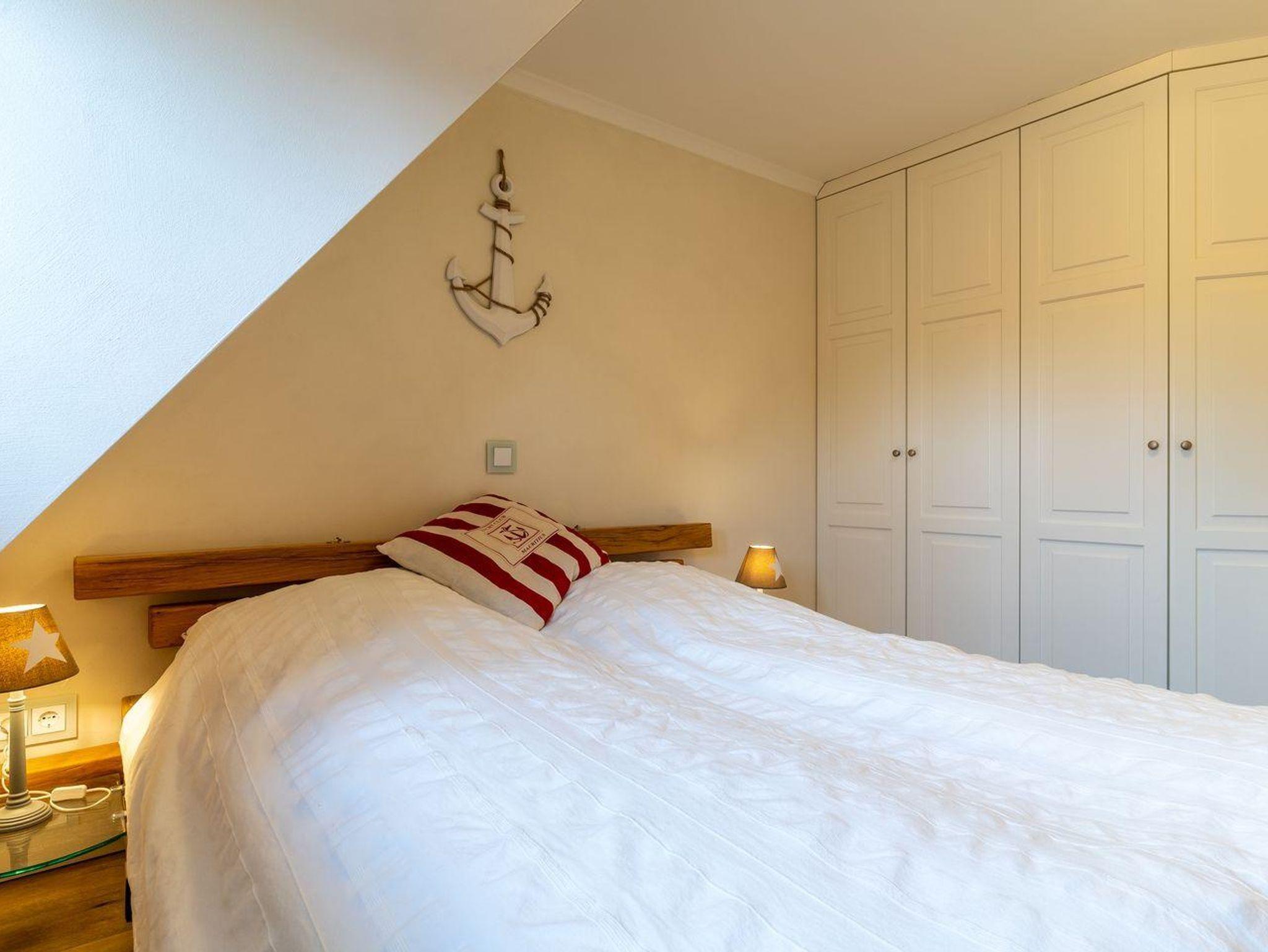 Obergeschoss: ein Schlafzimmer mit Doppelbett, ein Schlafzimmer mit Einzelbett (140 x 200 cm), ein Duschbad / WC mit Walk-In Dusche