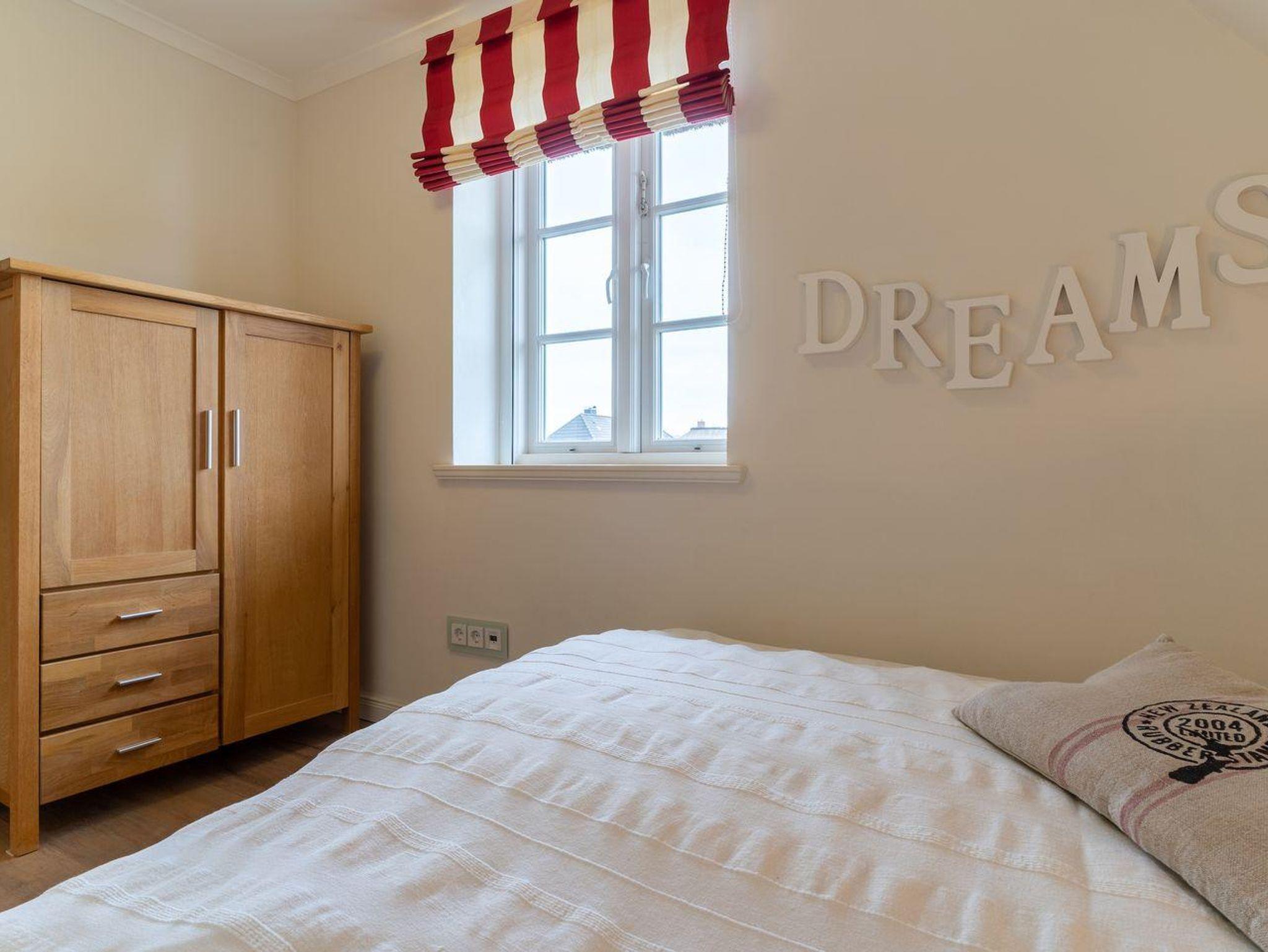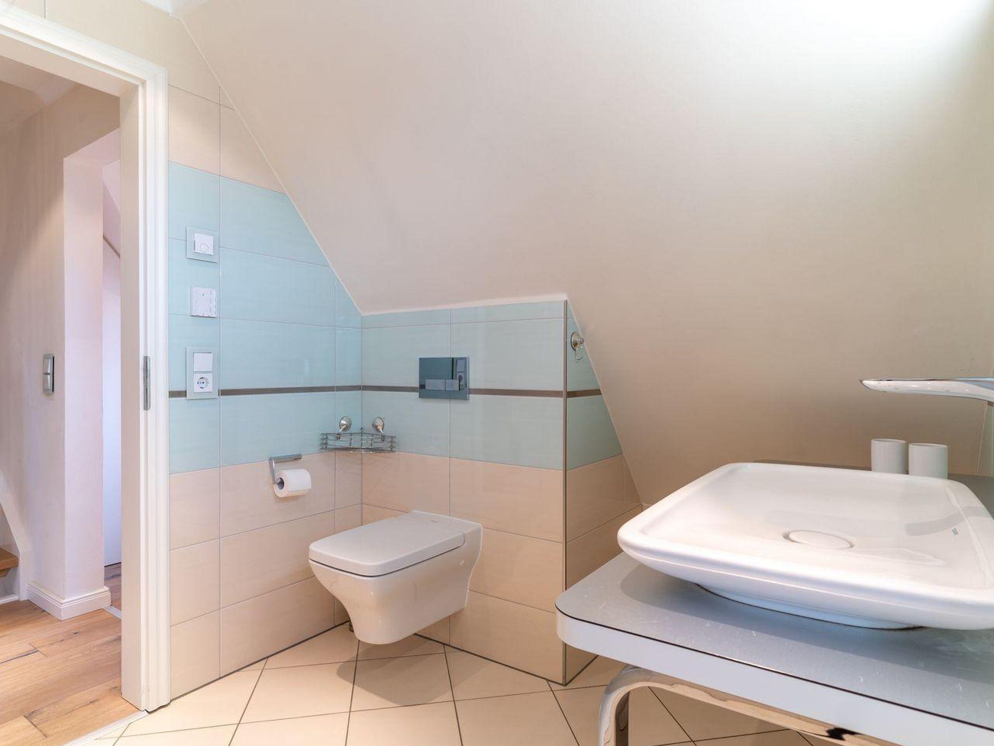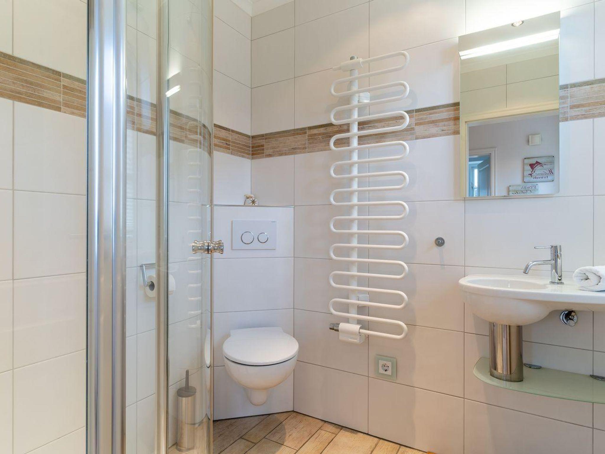 Obergeschoss: ein Schlafzimmer mit Doppelbett, ein Schlafzimmer mit Einzelbett (140 x 200 cm), ein Duschbad / WC mit Walk-In Dusche
